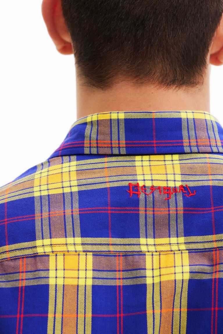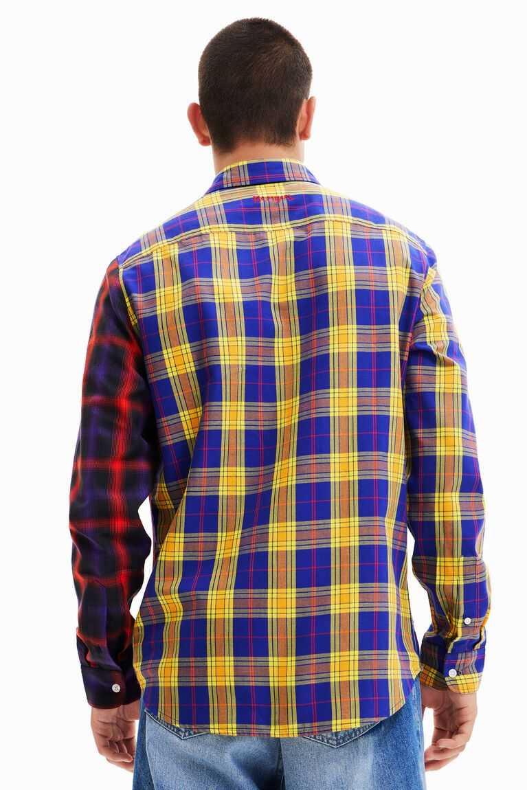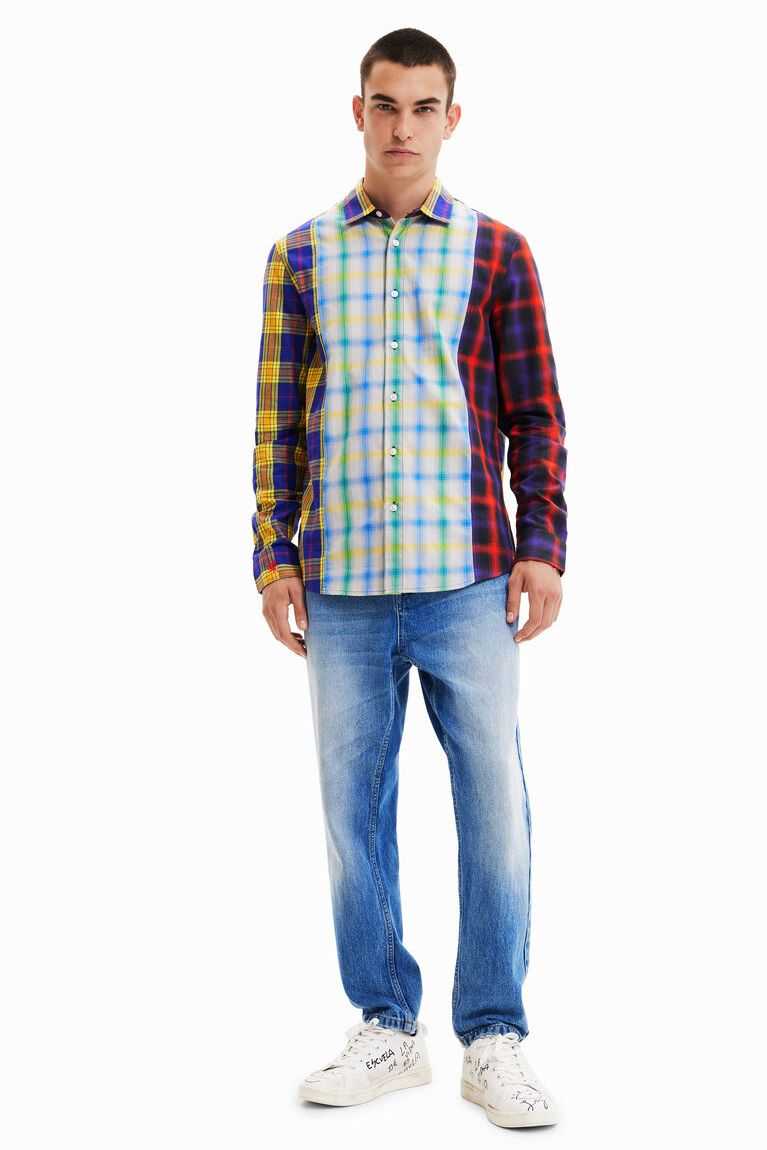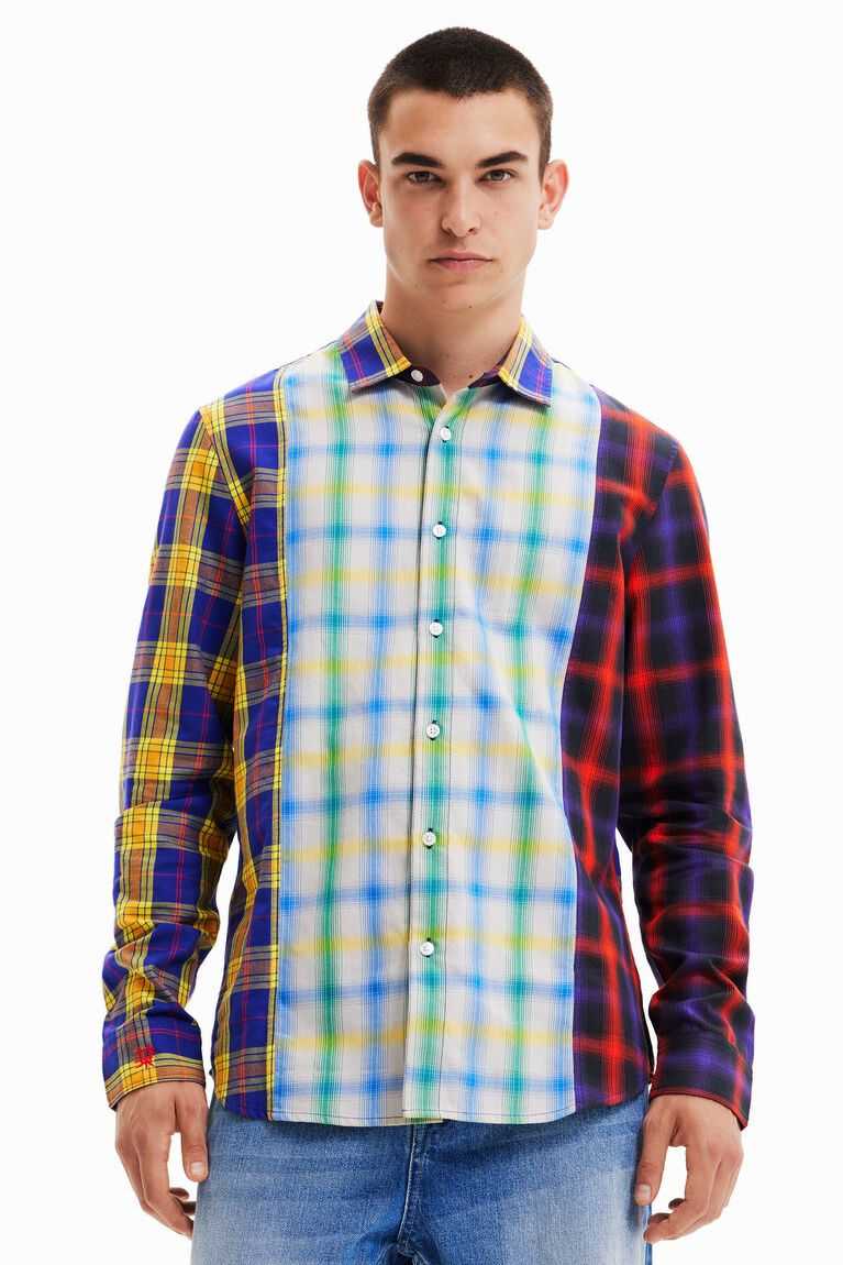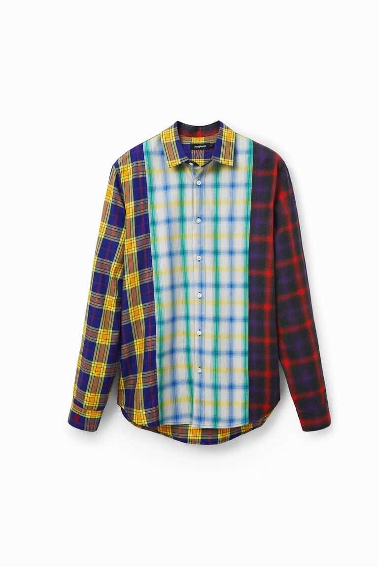 A long-sleeve straight-cut shirt with a vertical patchwork of different tartans in a very soft fabric.