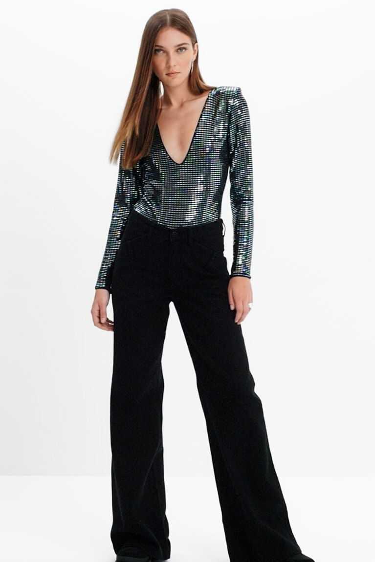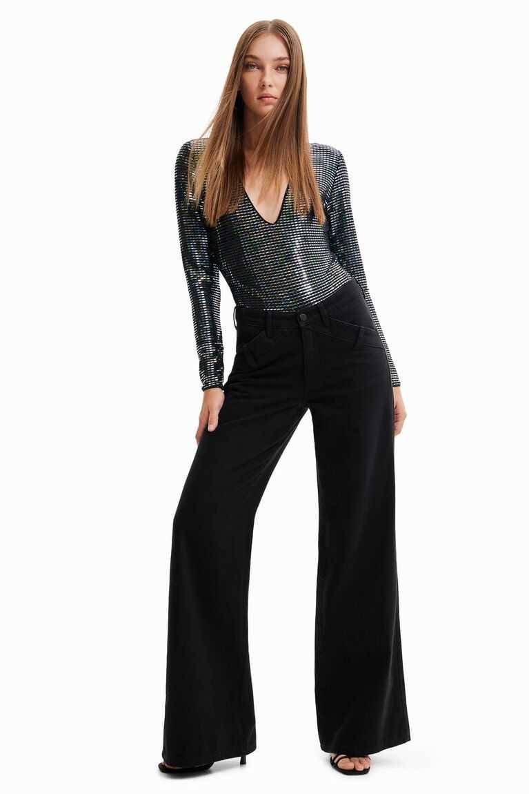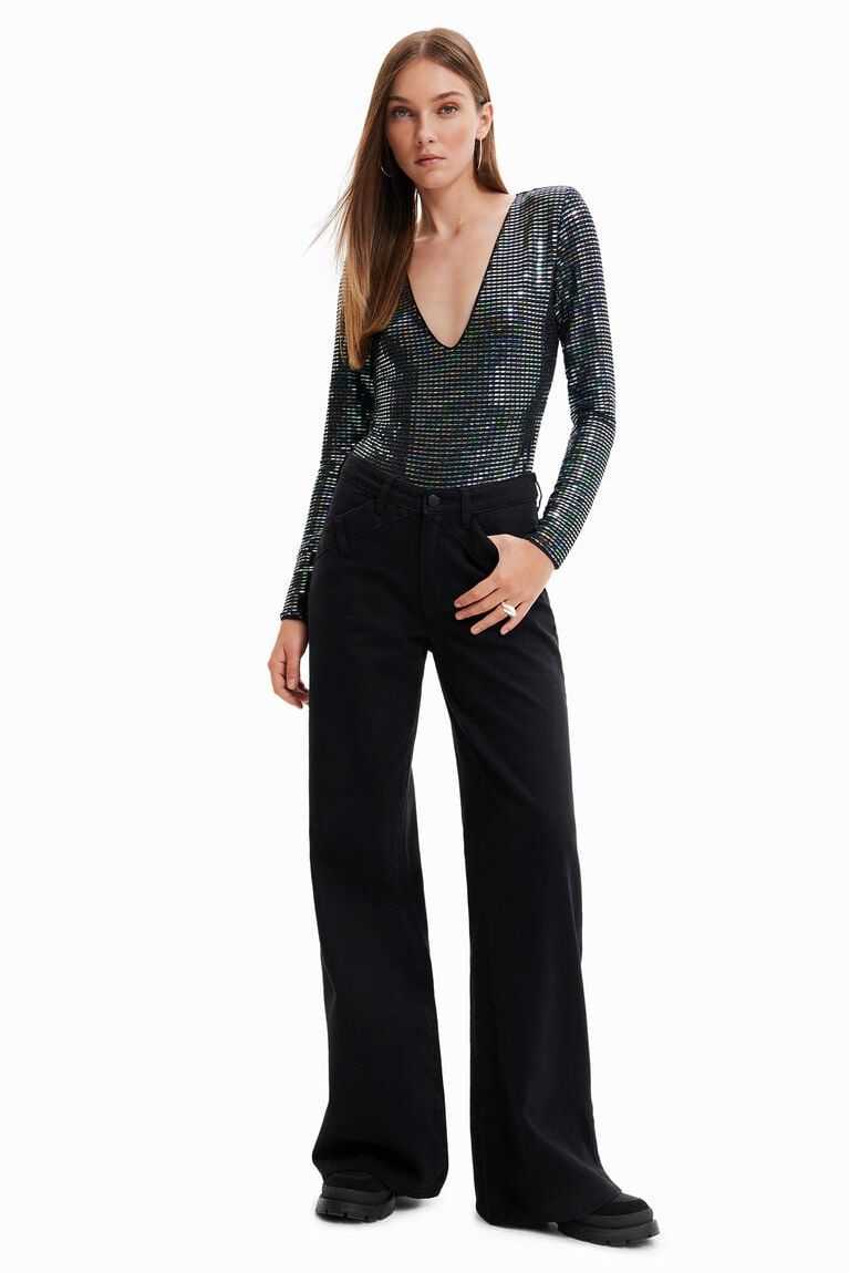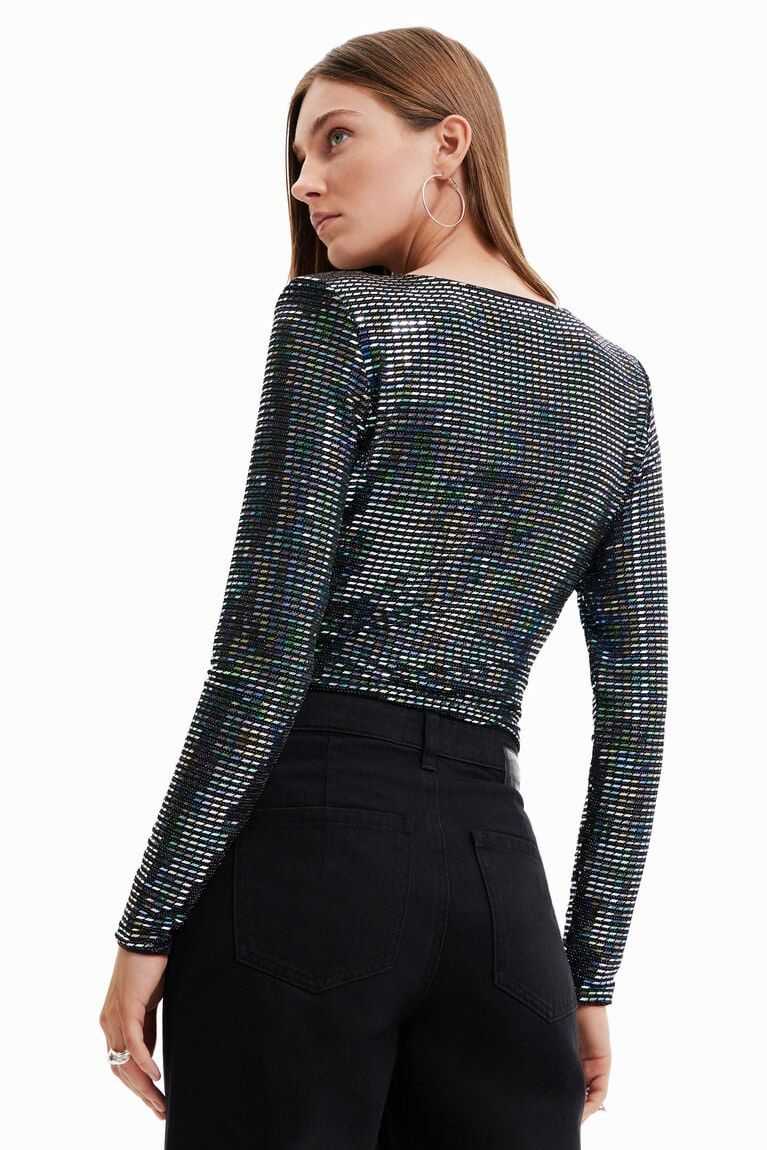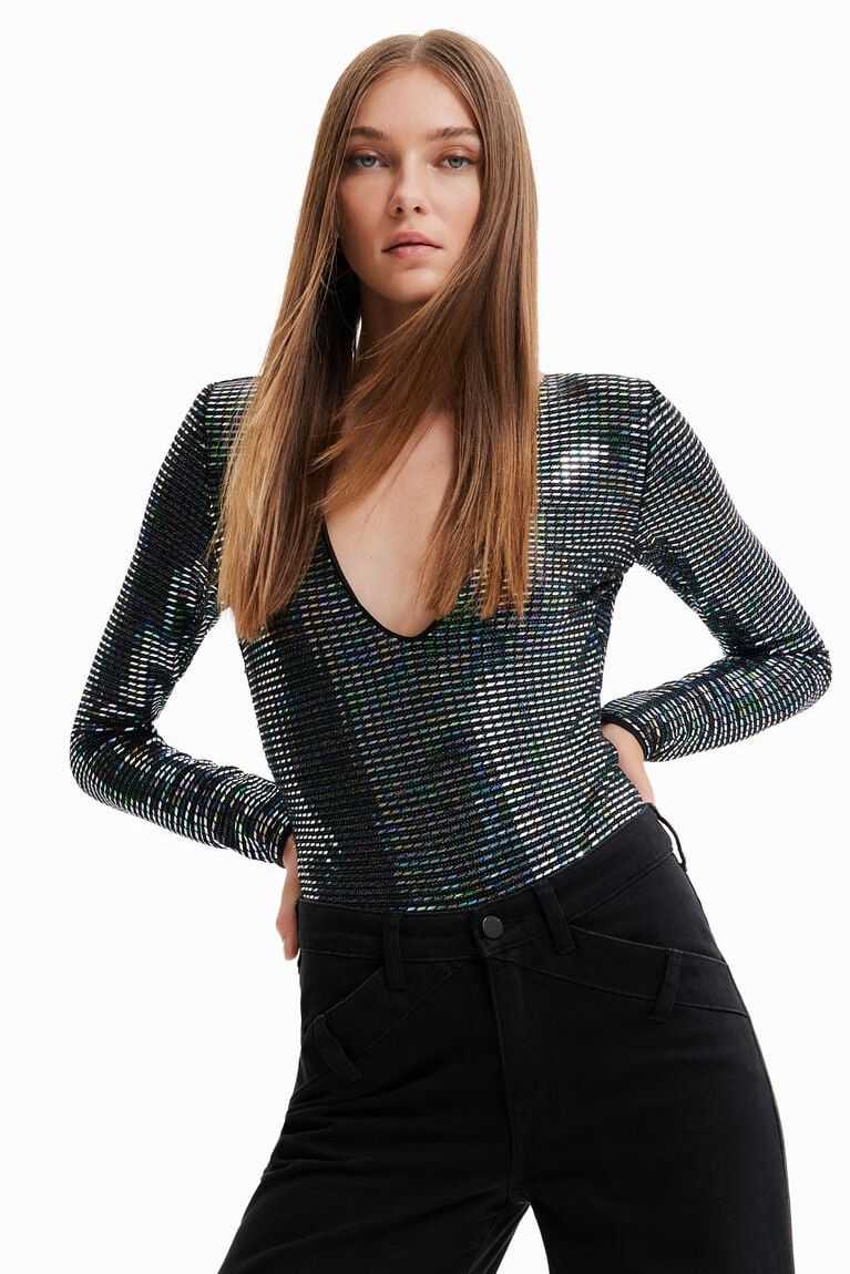 A fitted long-sleeve bodysuit with a V-neck in a fabric with iridescent appliqu
