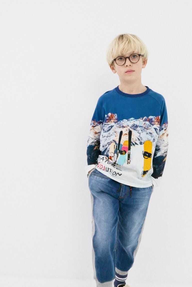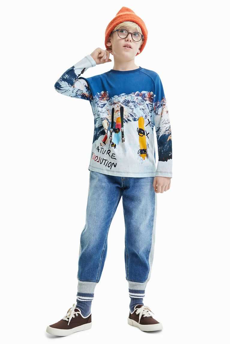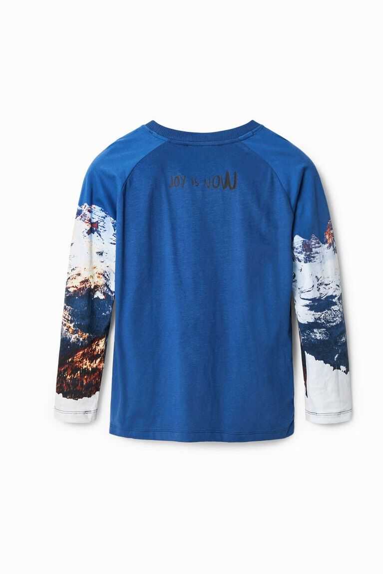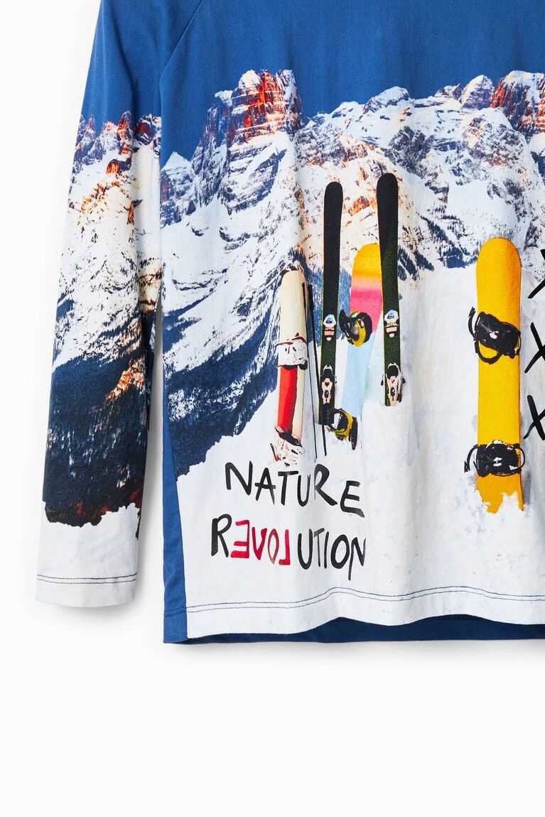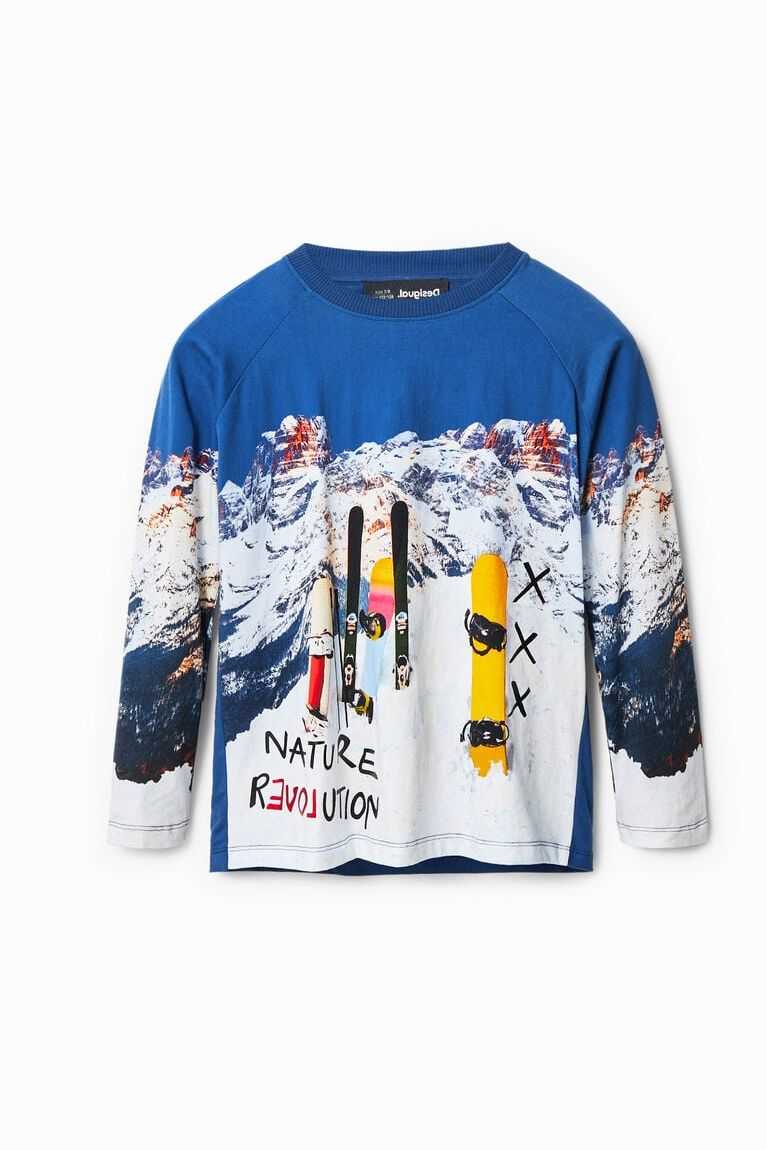 A long-sleeve cotton T-shirt featuring a photographic snowy mountain print with snowboards and skis.