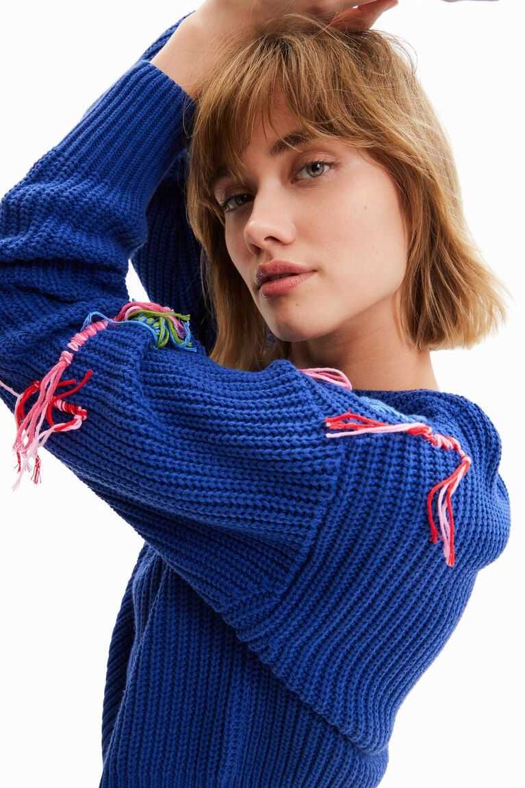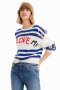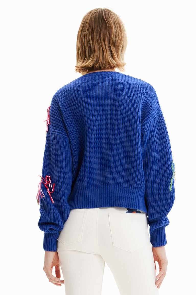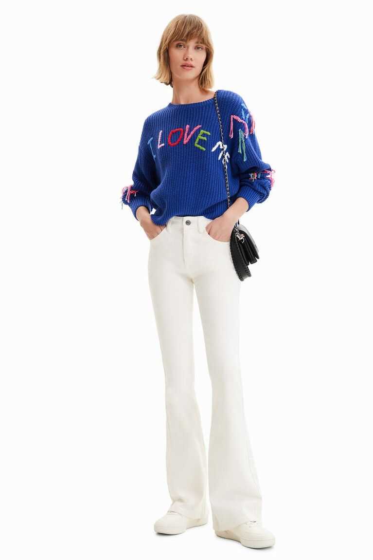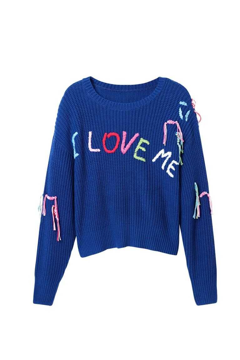 A long-sleeve pullover in medium-gauge knit with an embroidered message on the front.