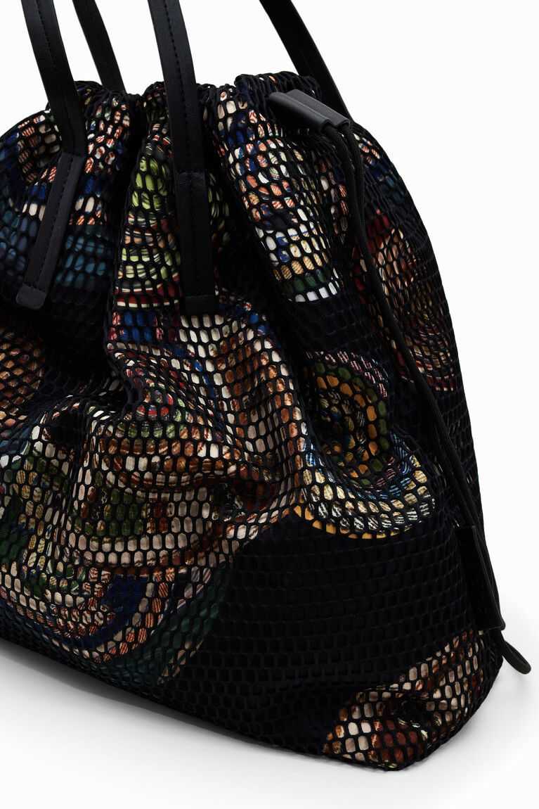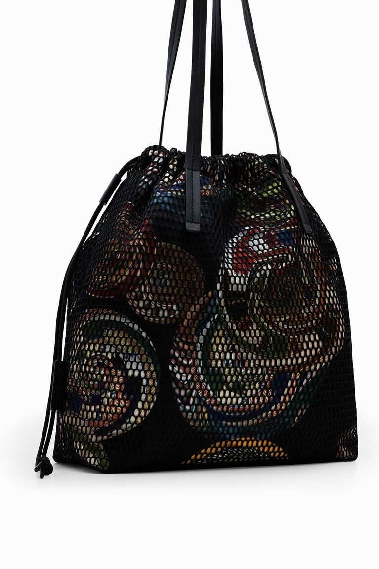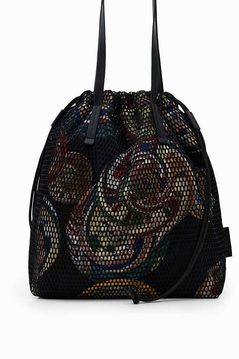 A bucket-style bag covered in mesh with a circle print designed by M. Christian Lacroix. Closes with drawstring gathering.