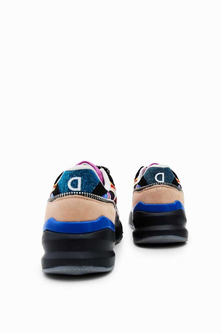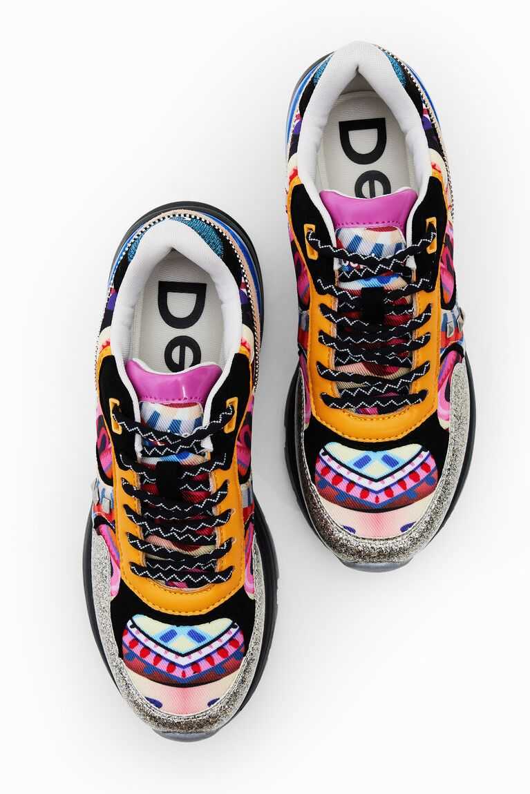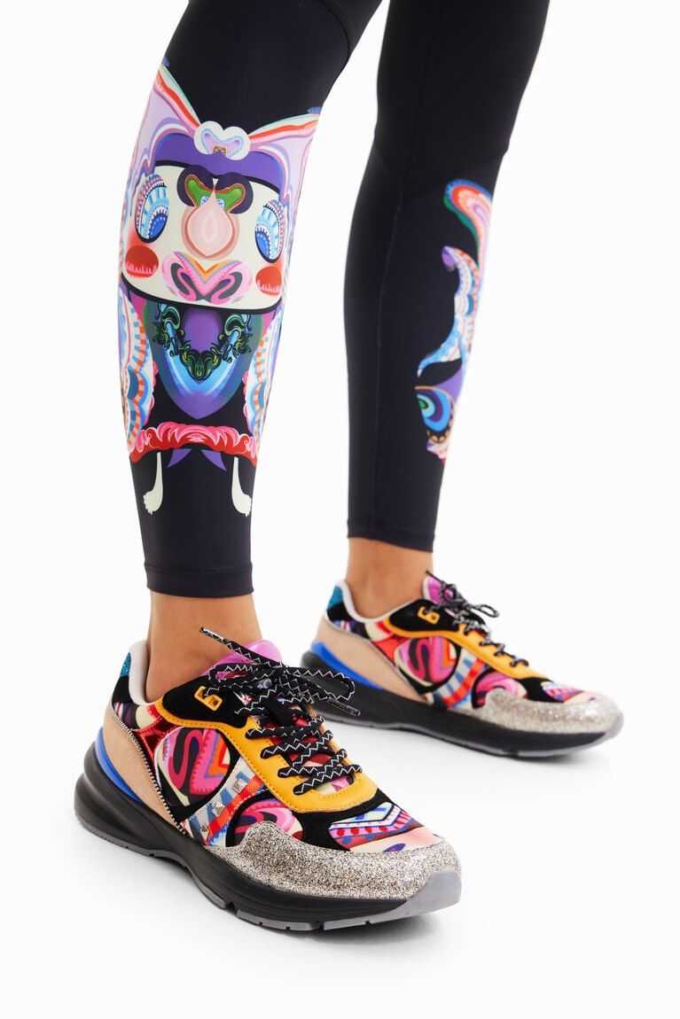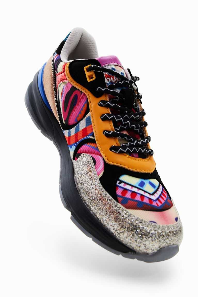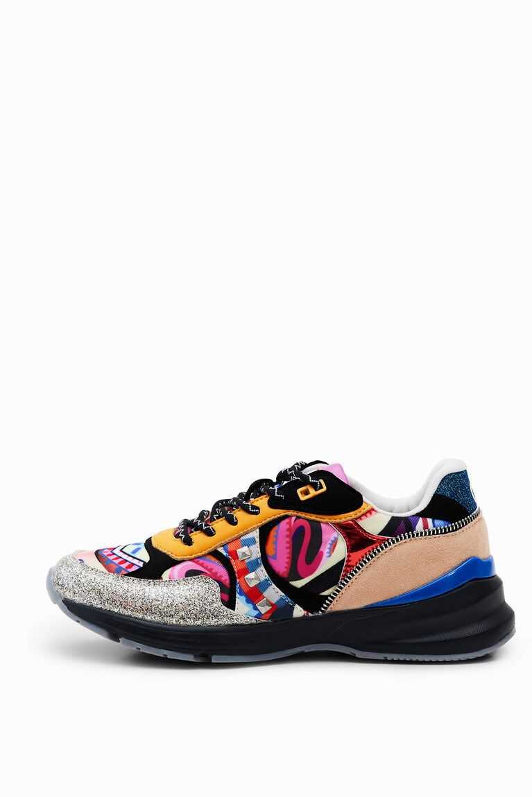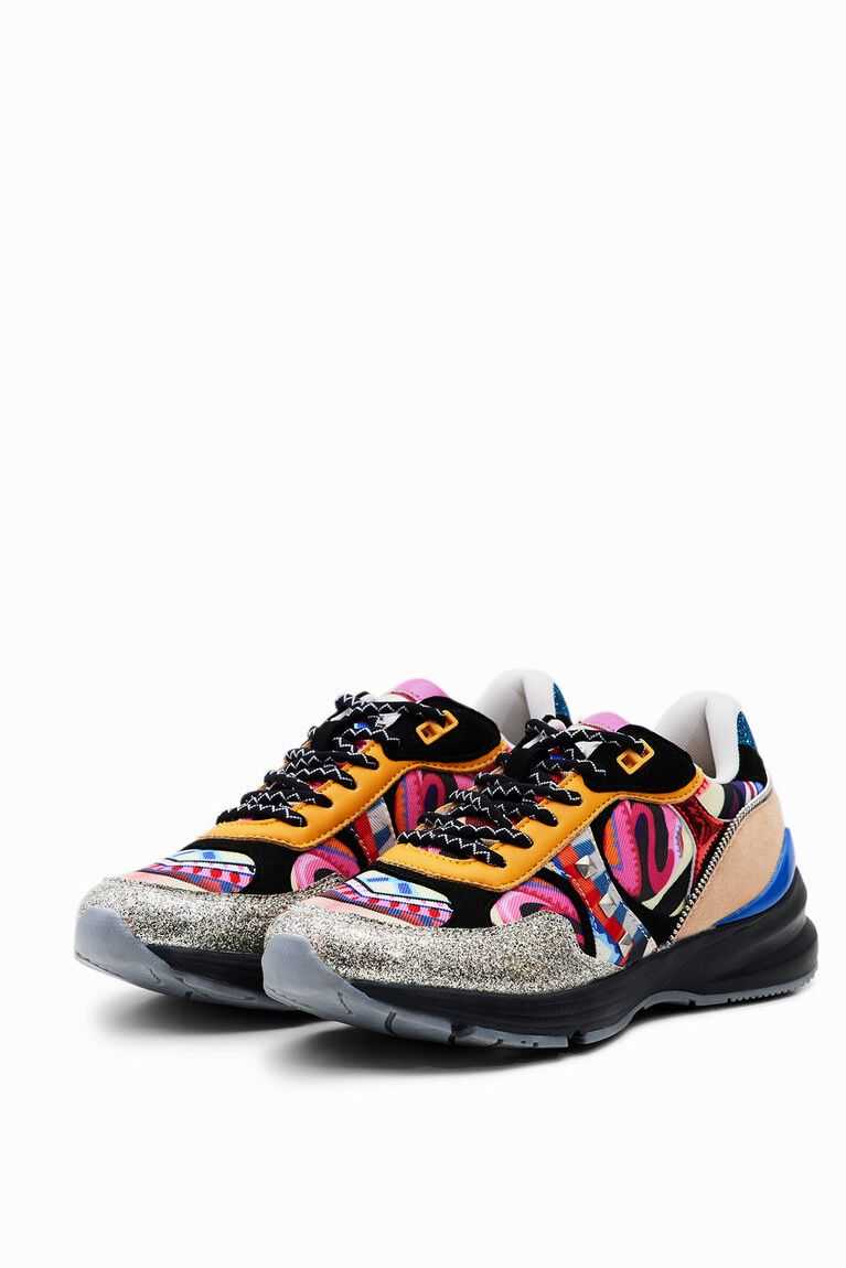 Anatomically shaped running sneakers designed by M. Christian Lacroix that coordinate with other garments from his collection. Featuring zip, stud, glitter and patchwork-print details.