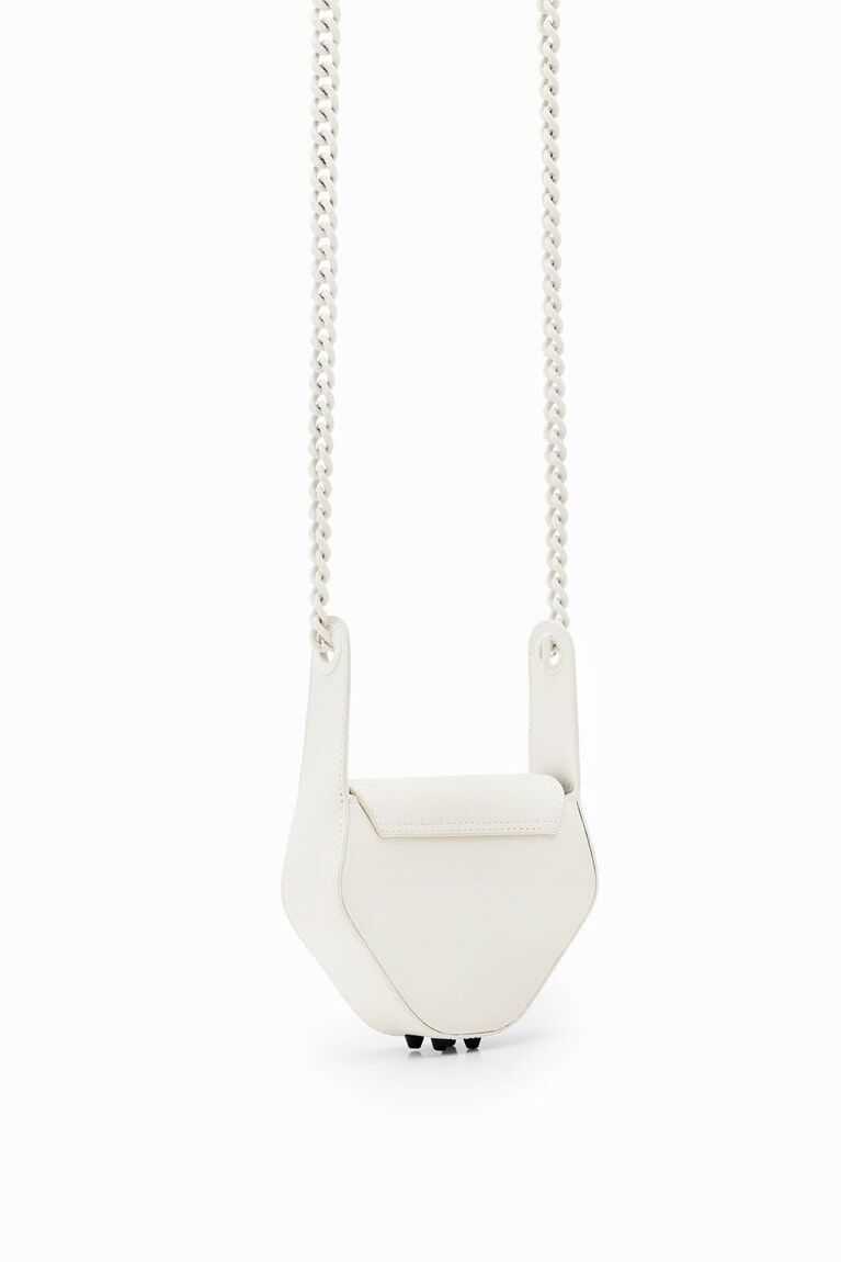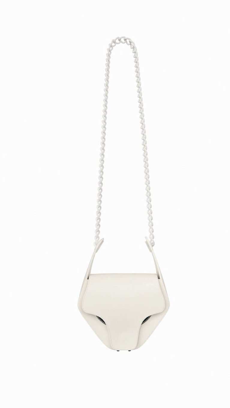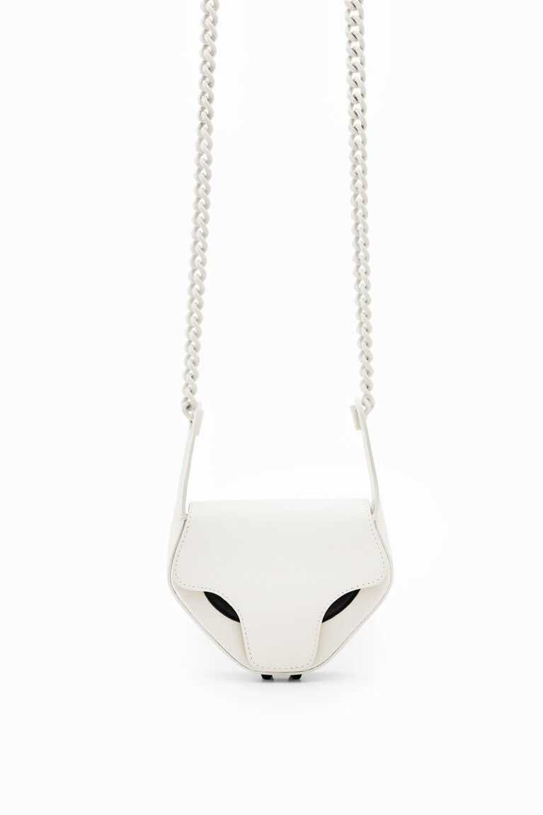 A small leather messenger bag with a flap closure, inside pockets and a long tone-on-tone chain strap. Designed by Maitrepierre and made in Spain.