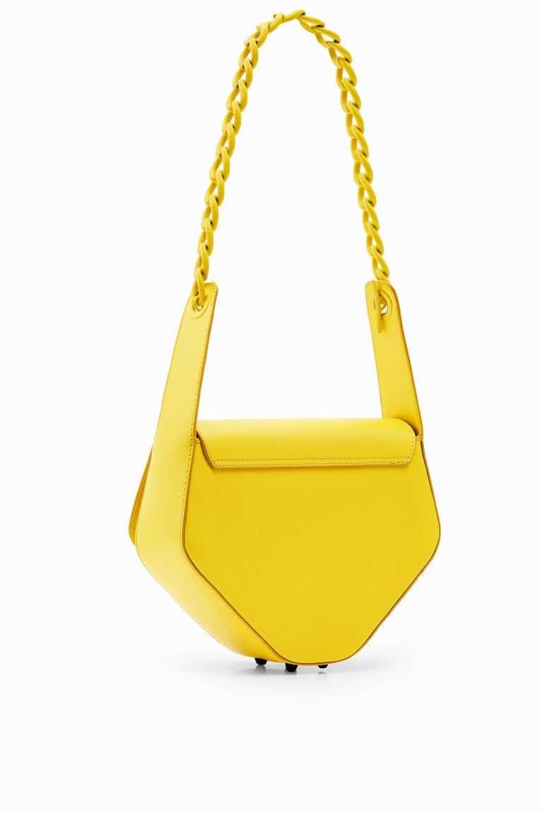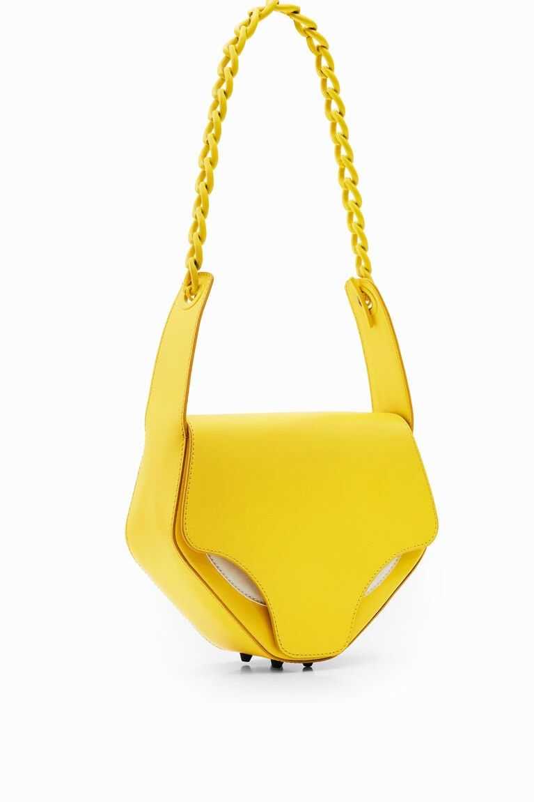 A leather shoulder bag with a flap closure, inside pockets and a short tone-on-tone chain strap. Designed by Maitrepierre and made in Spain.