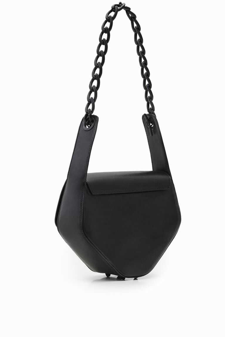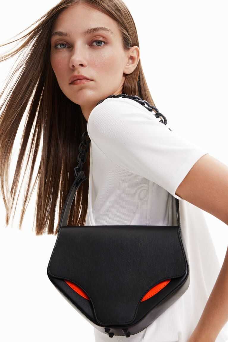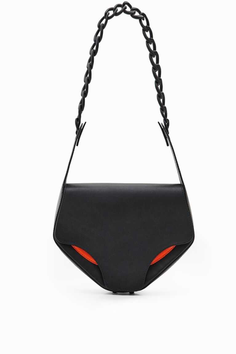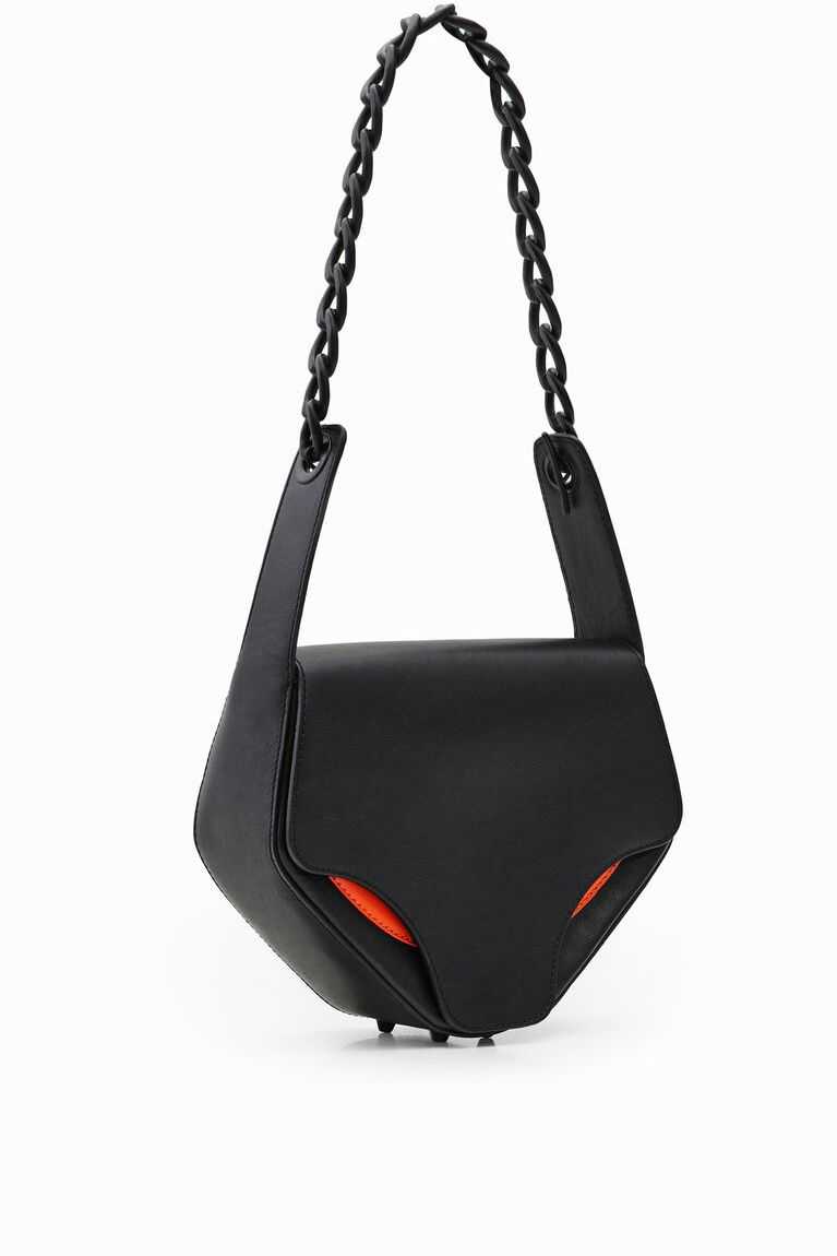 A leather shoulder bag with a flap closure, inside pockets and a short tone-on-tone chain strap. Designed by Maitrepierre and made in Spain.