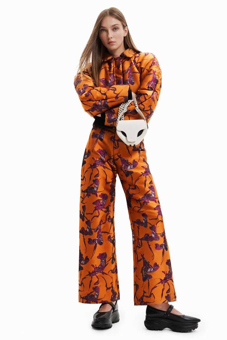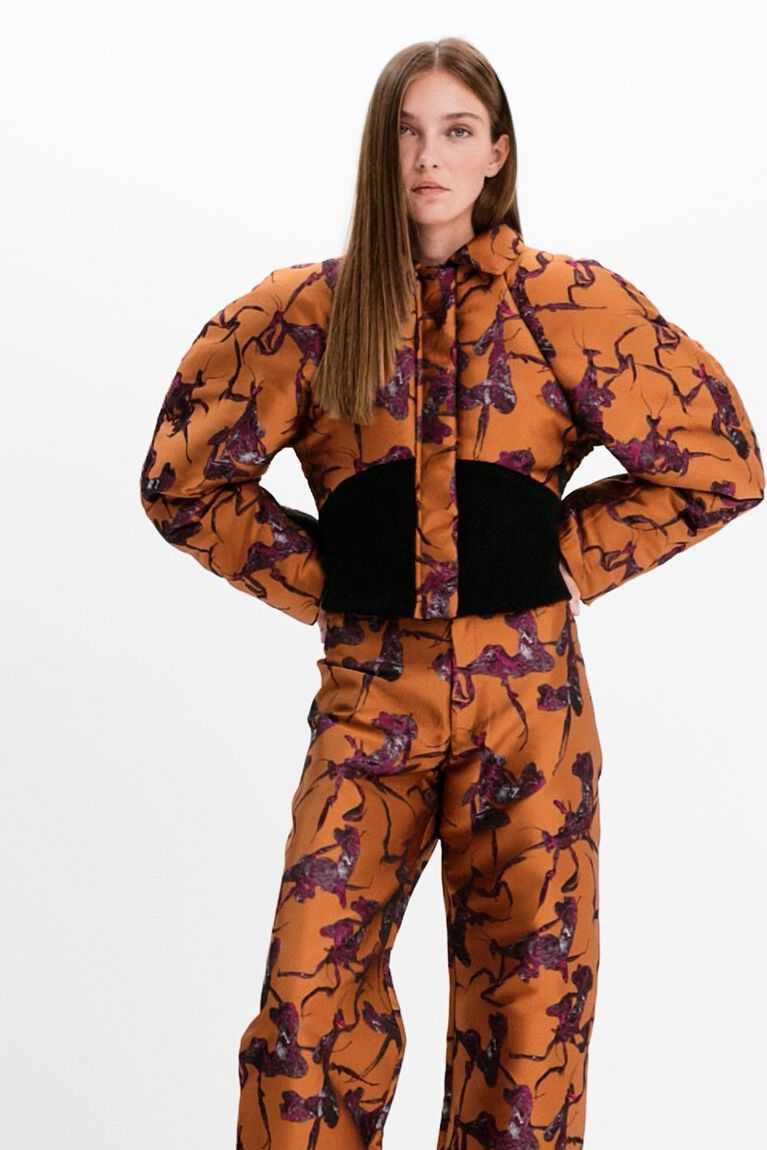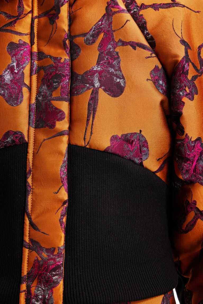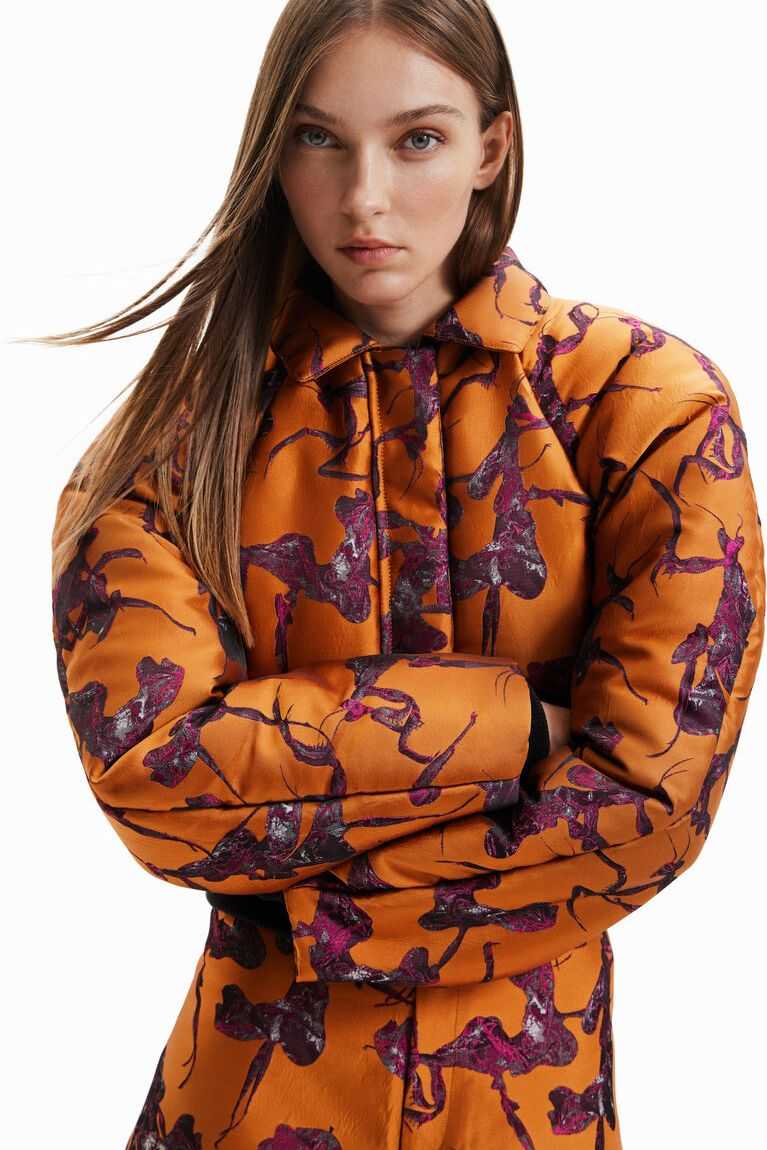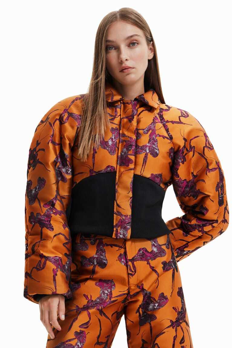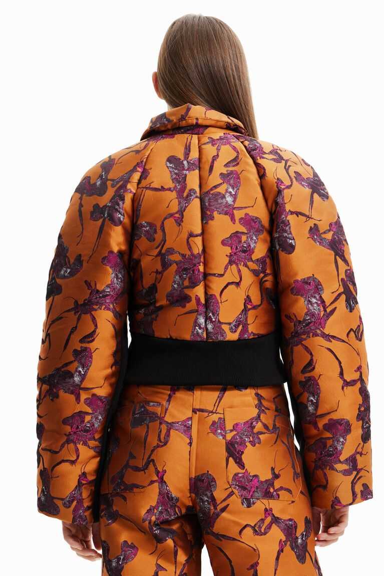 A short padded bomber jacket in jacquard fabric with a fitted hem and mutton sleeves. Designed by Maitrepierre.
