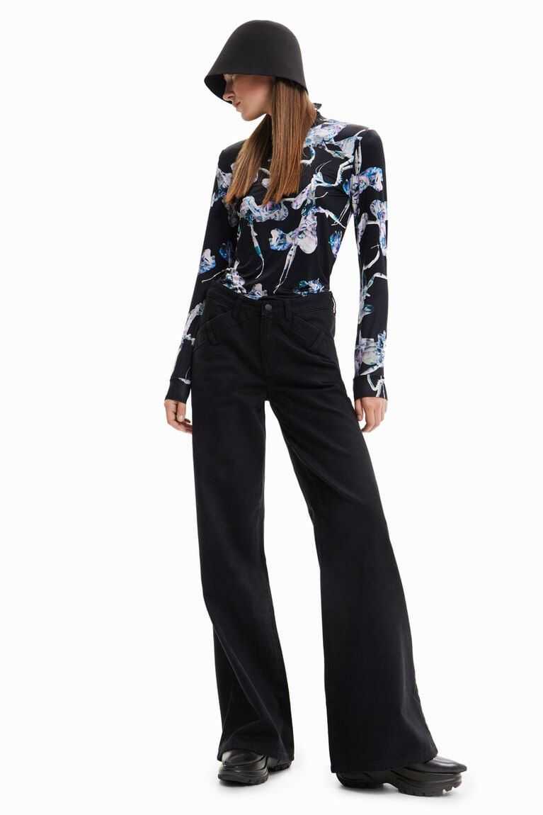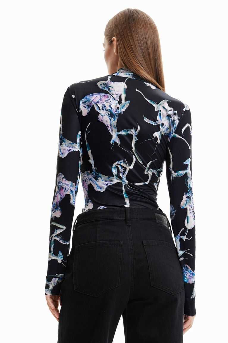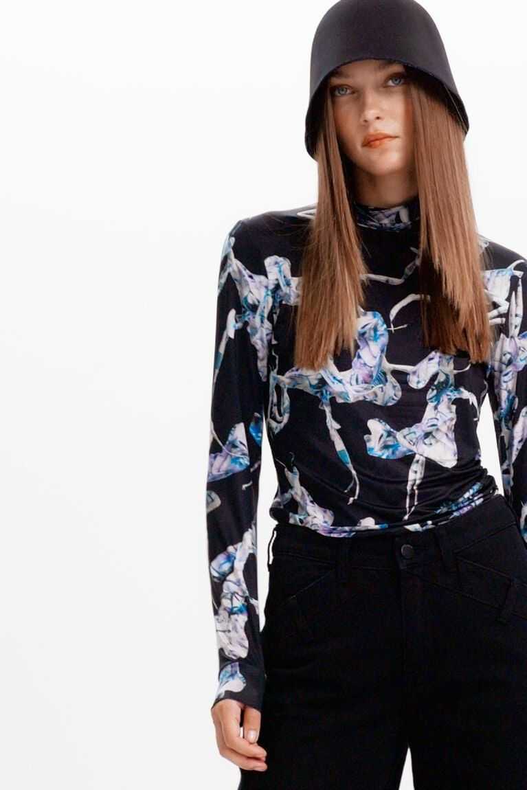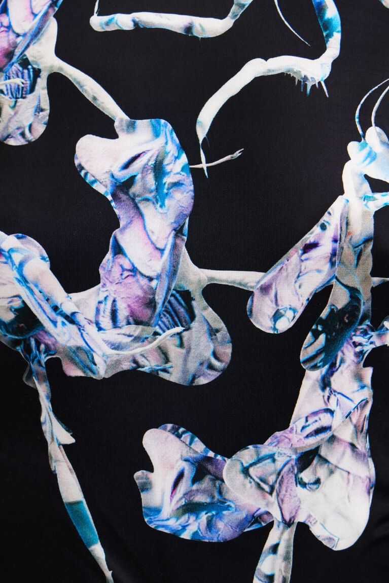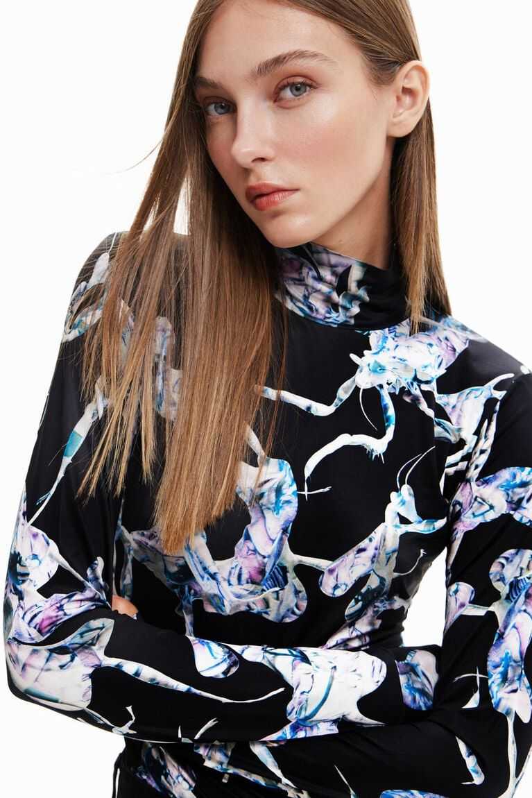 A fitted long-sleeve T-shirt with a high neck featuring a digital mantis print in a floral effect. Designed by Maitrepierre.