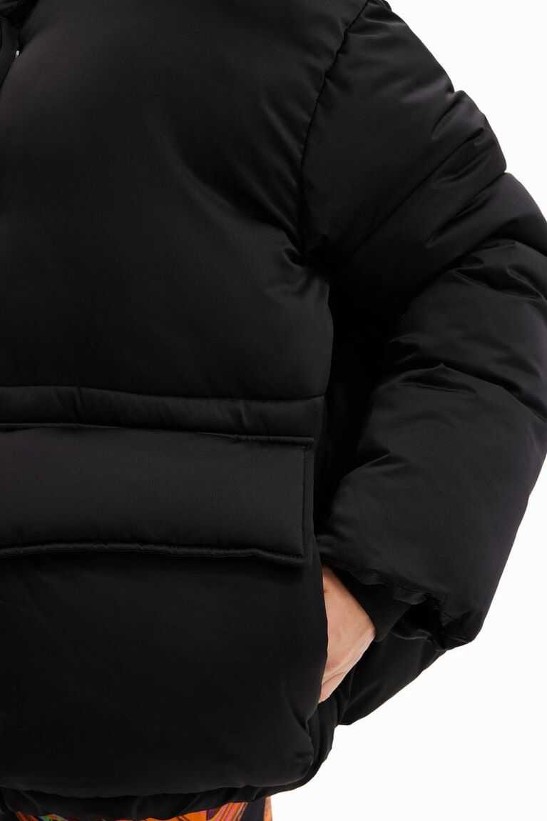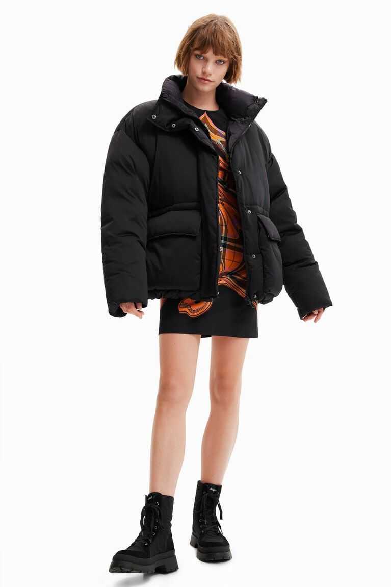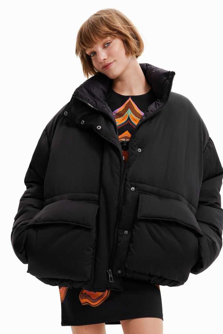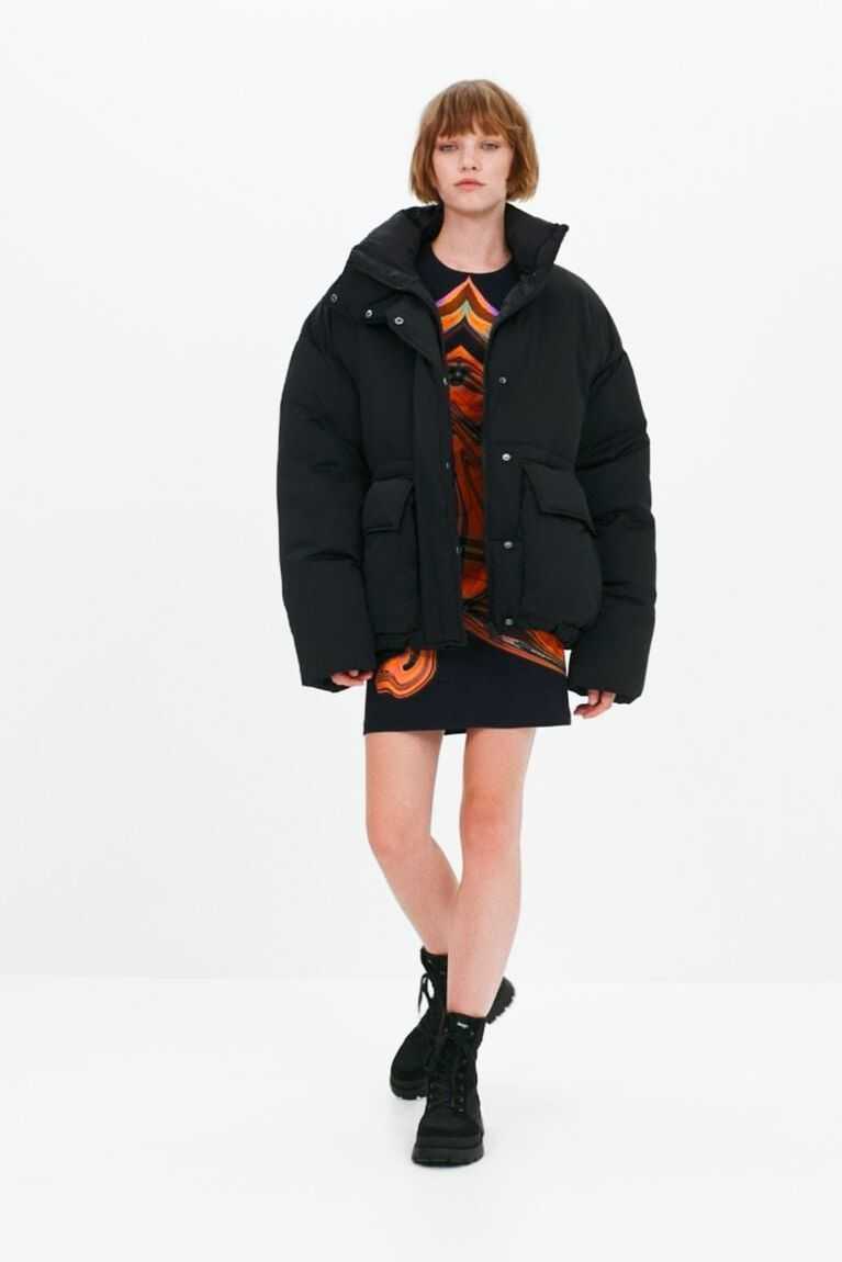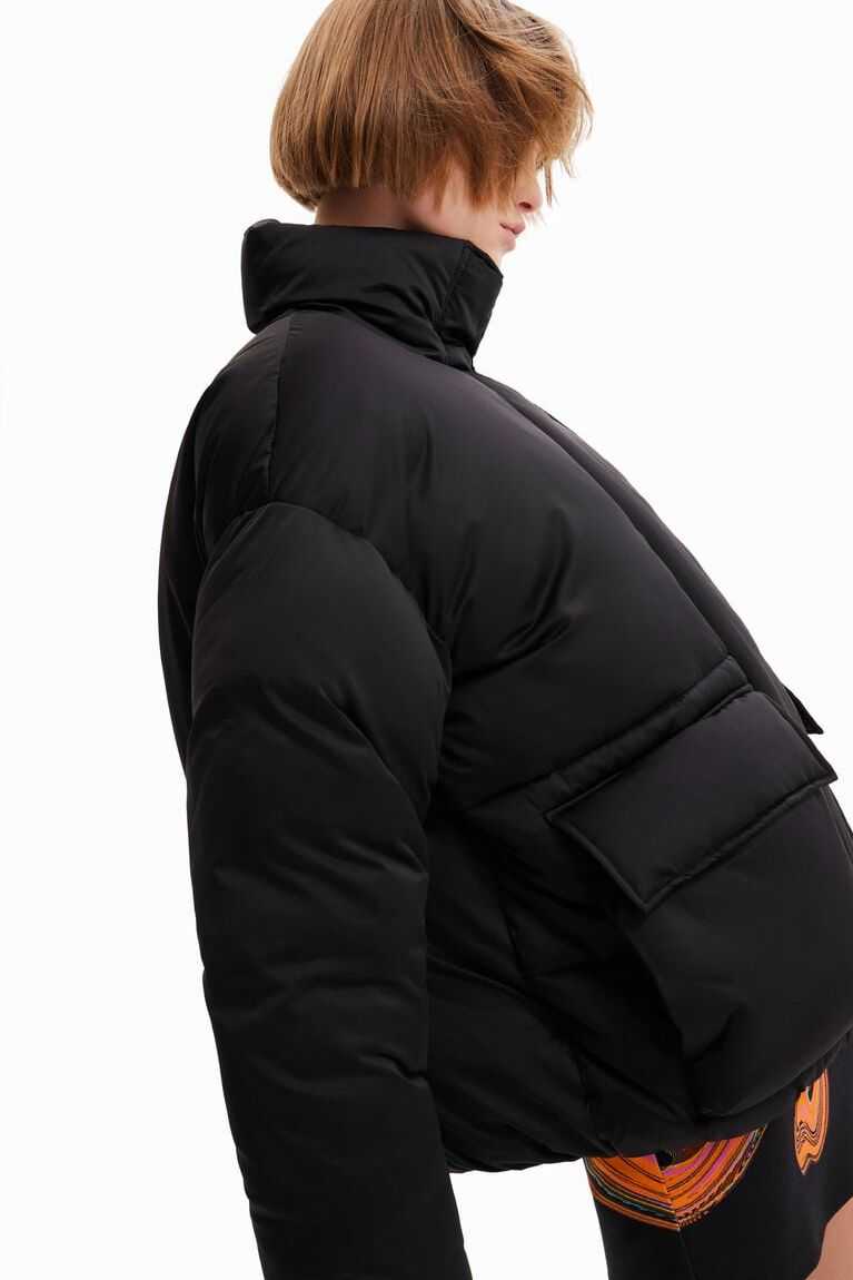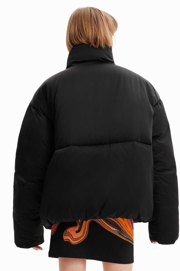 An oversize padded jacket in satin nylon fabric with a positional inside print. Designed by Mar