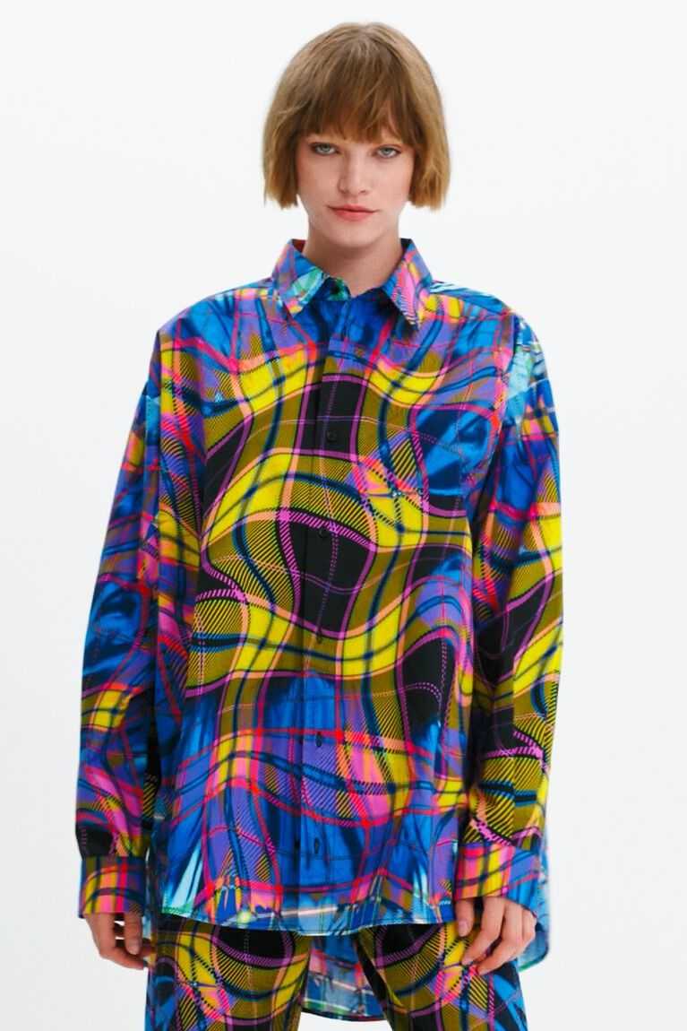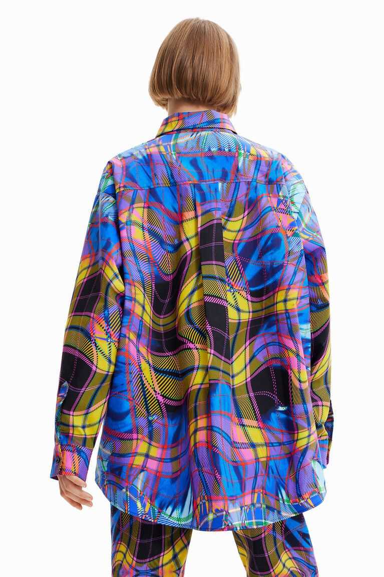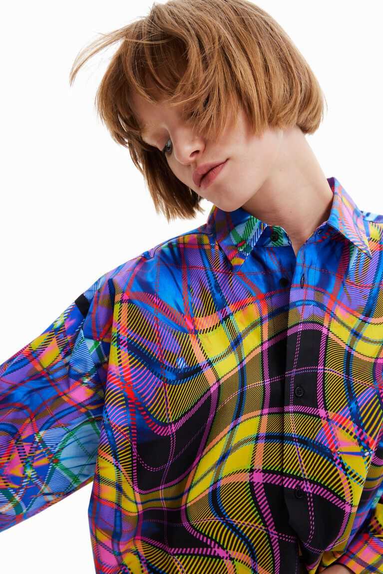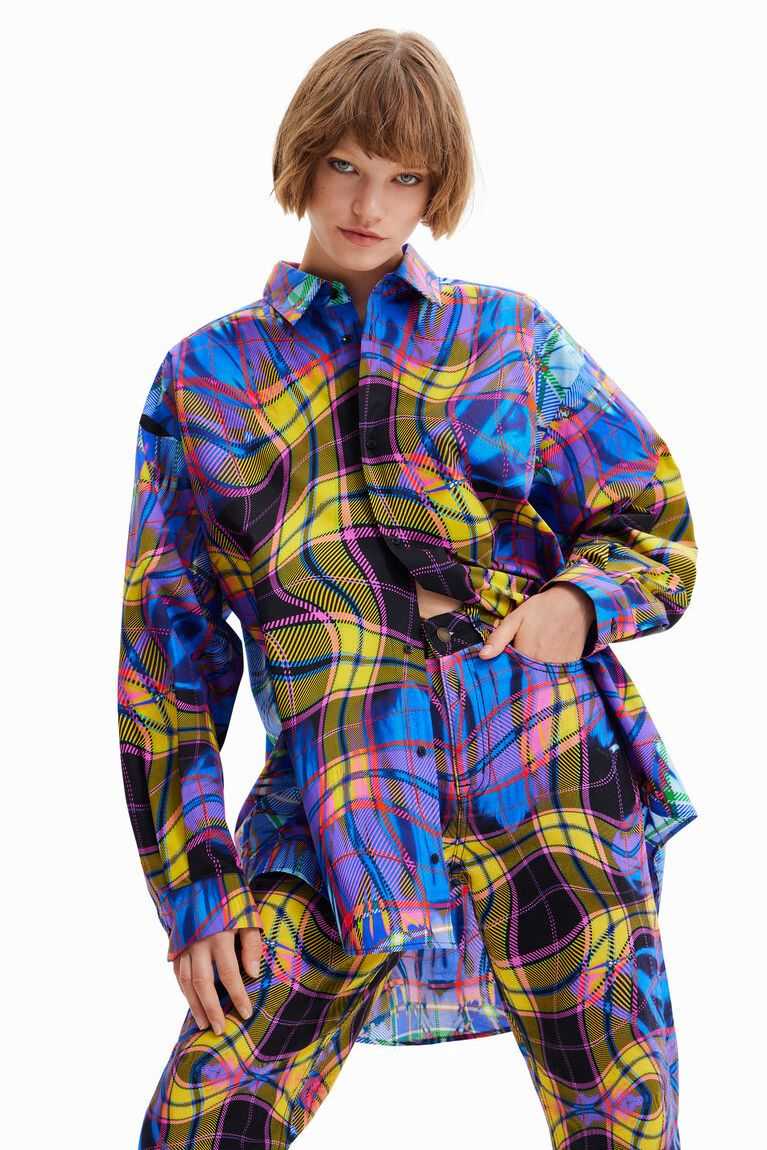 An oversize long-sleeve shirt in cotton poplin with drop shoulders, black buttons and a distorted plaid print. Designed by Mar