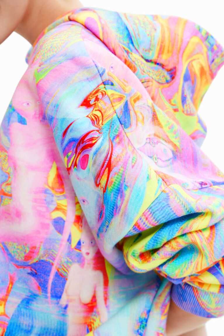 An oversize sweatshirt with a lined hood, pockets and a spirit print. Designed by Mar