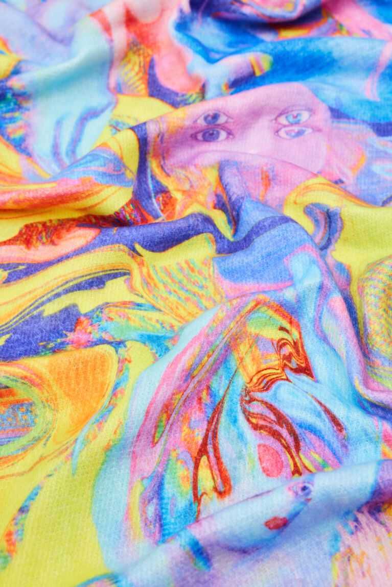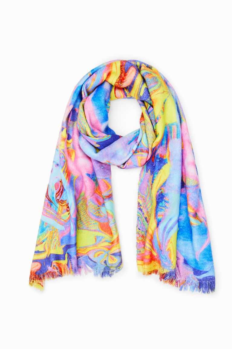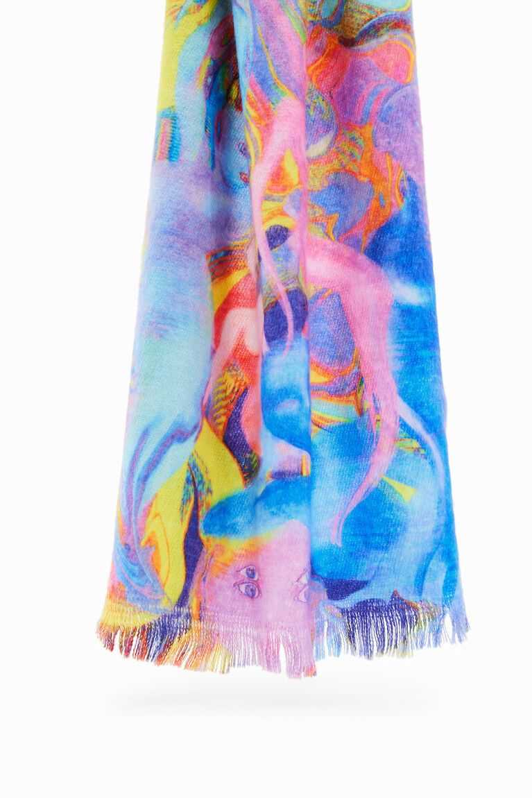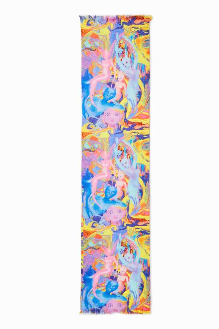 A fine scarf in frayed-effect fabric on the hems and a spirit print. Designed by Mar