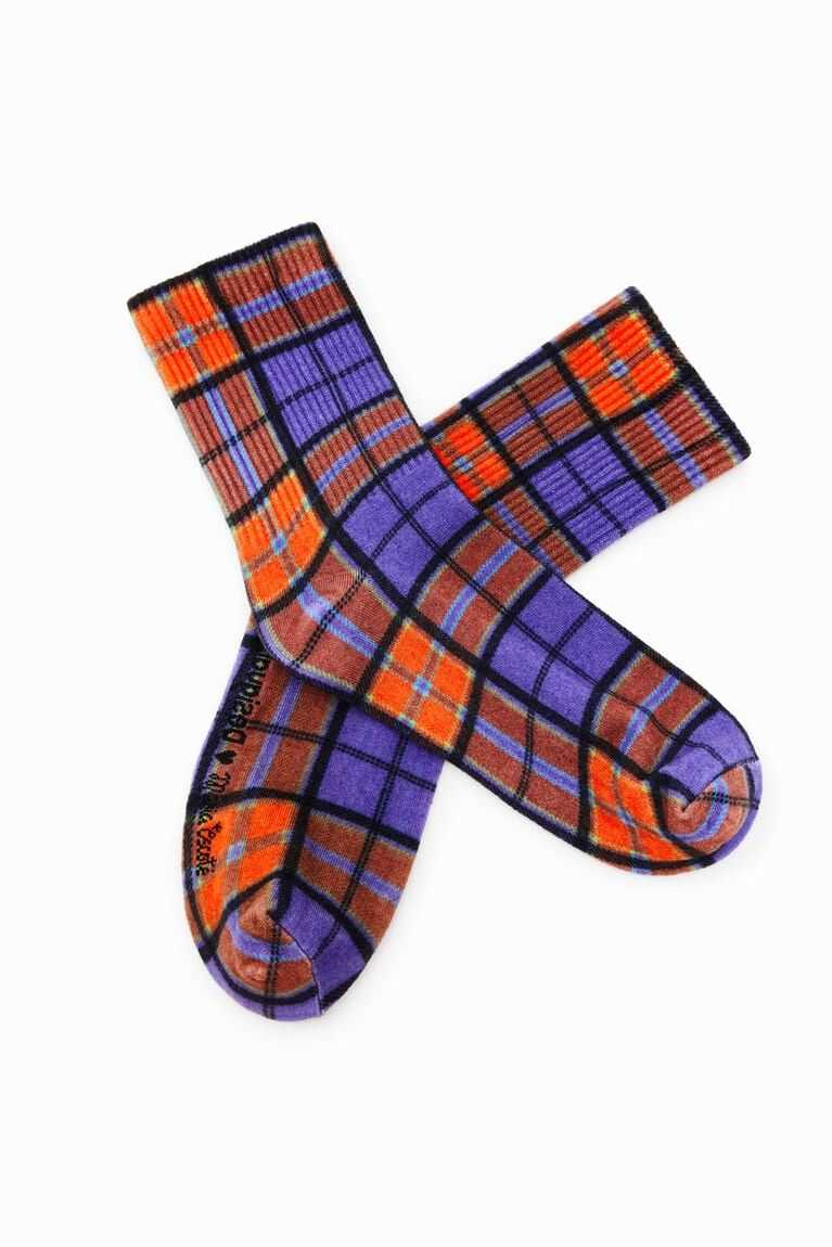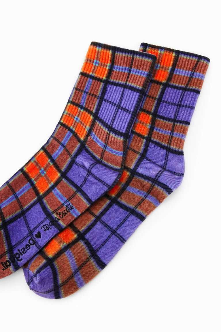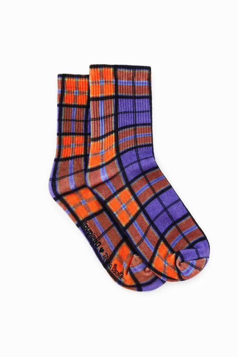 Short socks with a ribbed upper part and a plaid print with acid-colour details. Designed by Mar