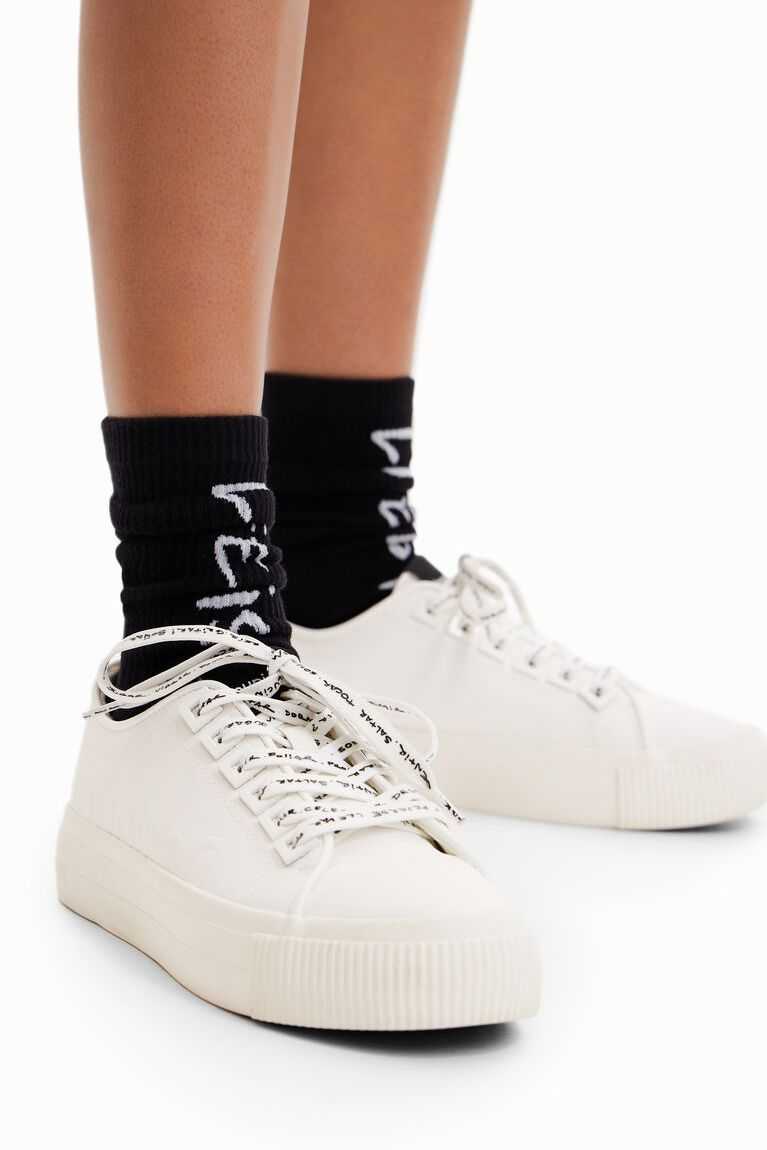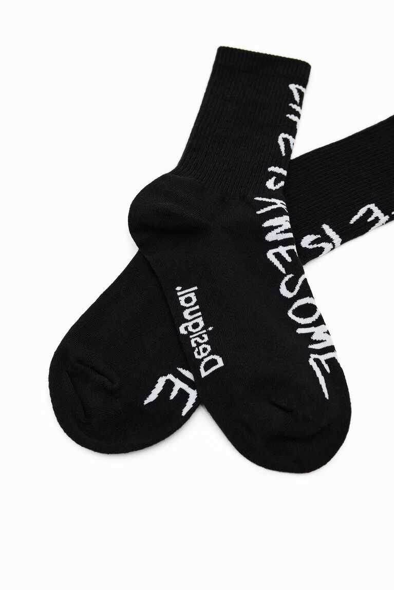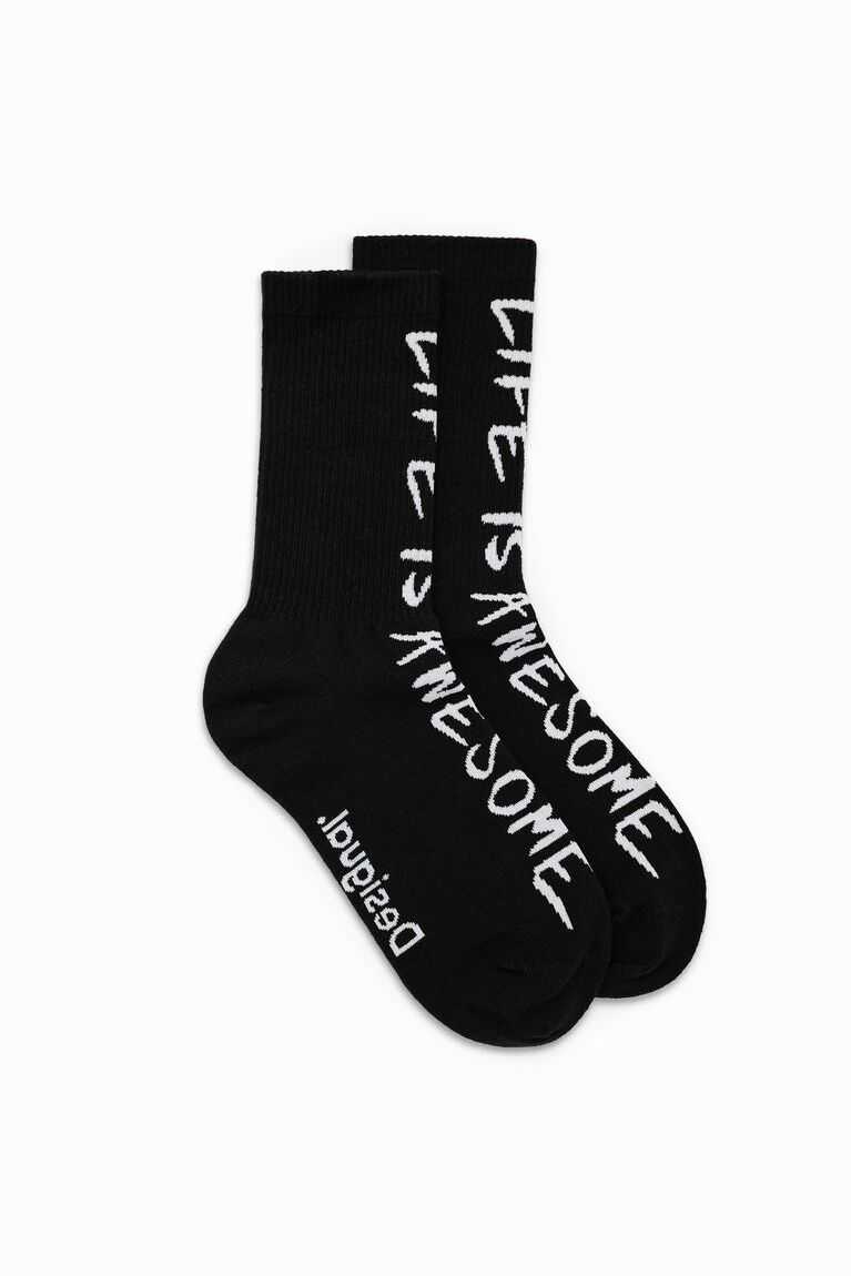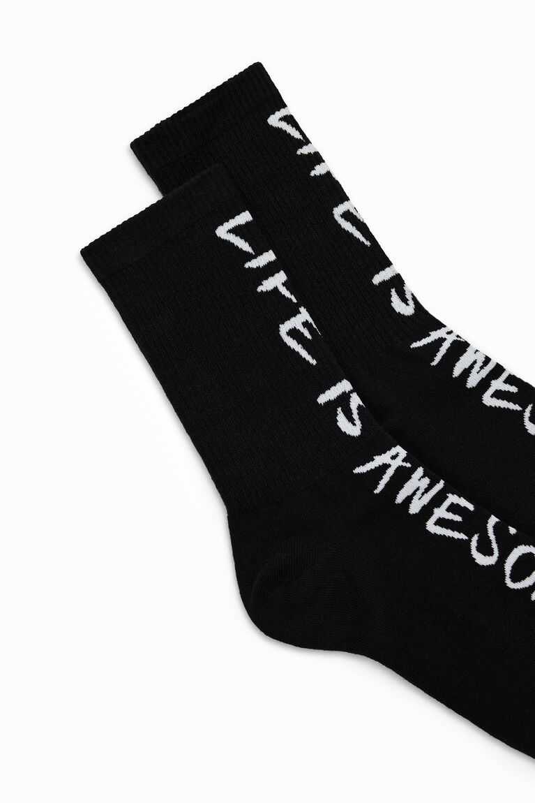 Black socks with a Life is Awesome message on the side. They are very soft to the touch and stop above the ankle.