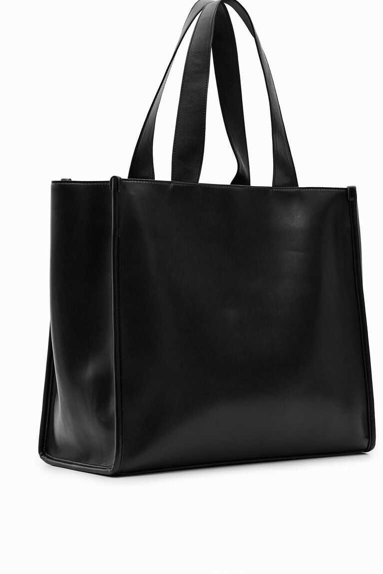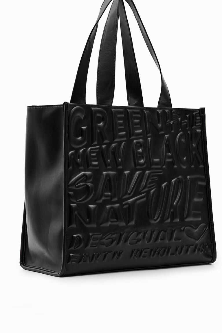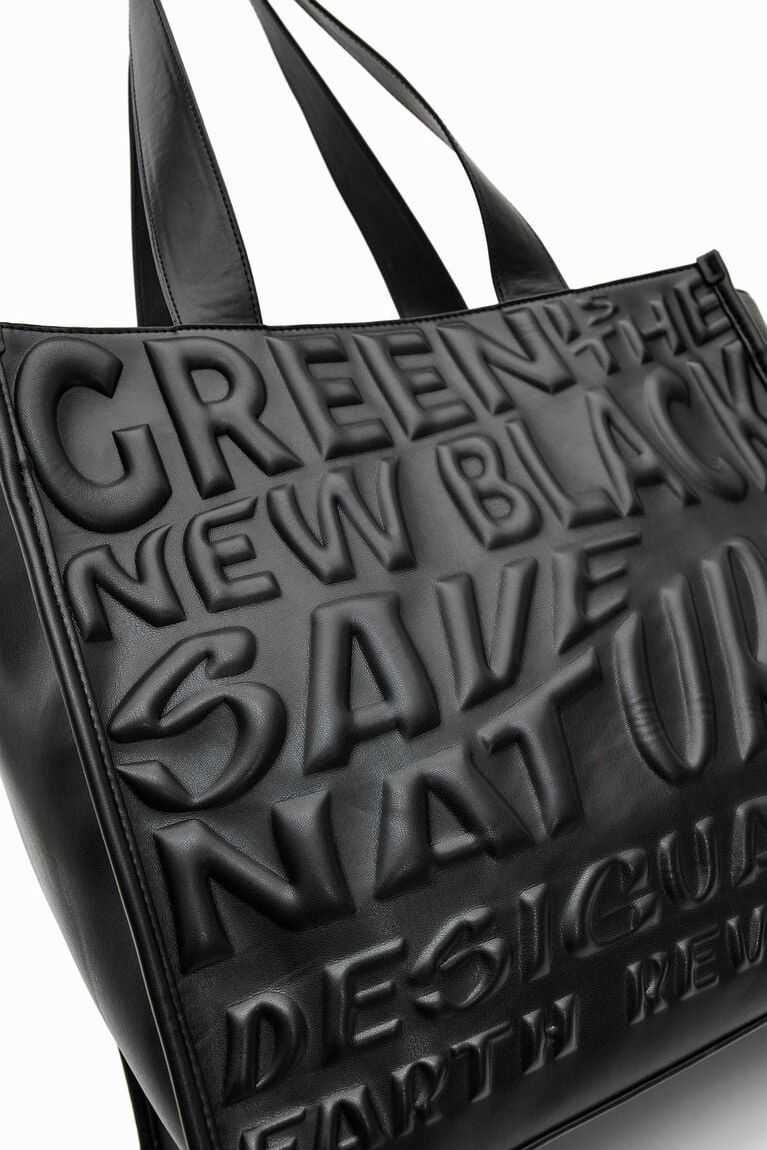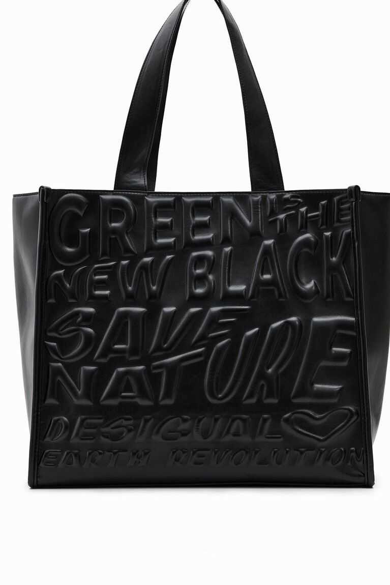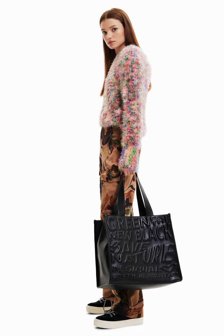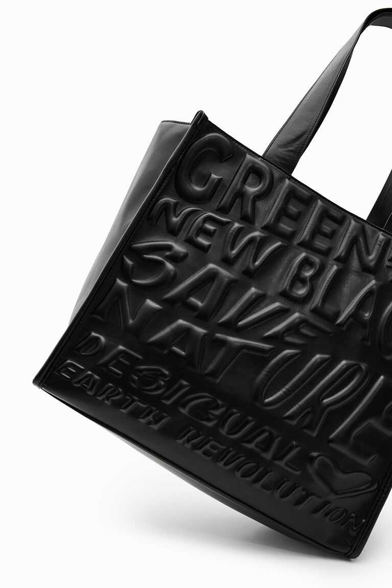 A very lightweight and spacious square shopper bag made from recycled fibres. The front is covered with embossed messages from the collection.