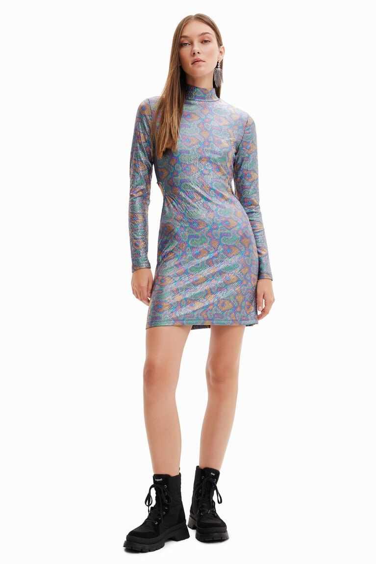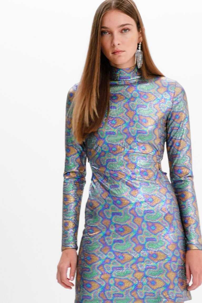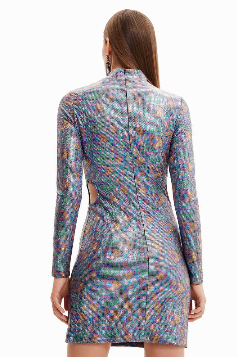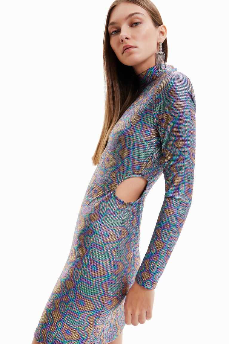 A short, fitted, shimmery metallic dress with long sleeves and a Perkins collar. Fits the body thanks to its stretch fabric, and features cut-out details at the side of the waist.