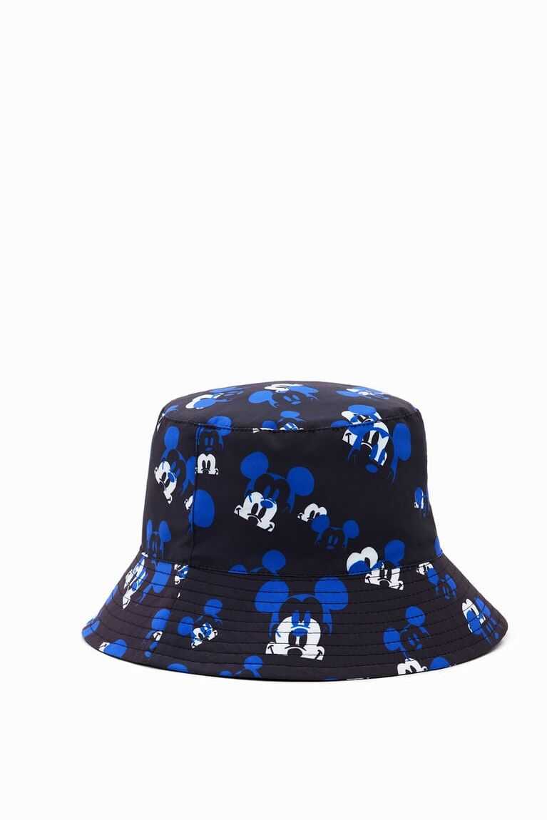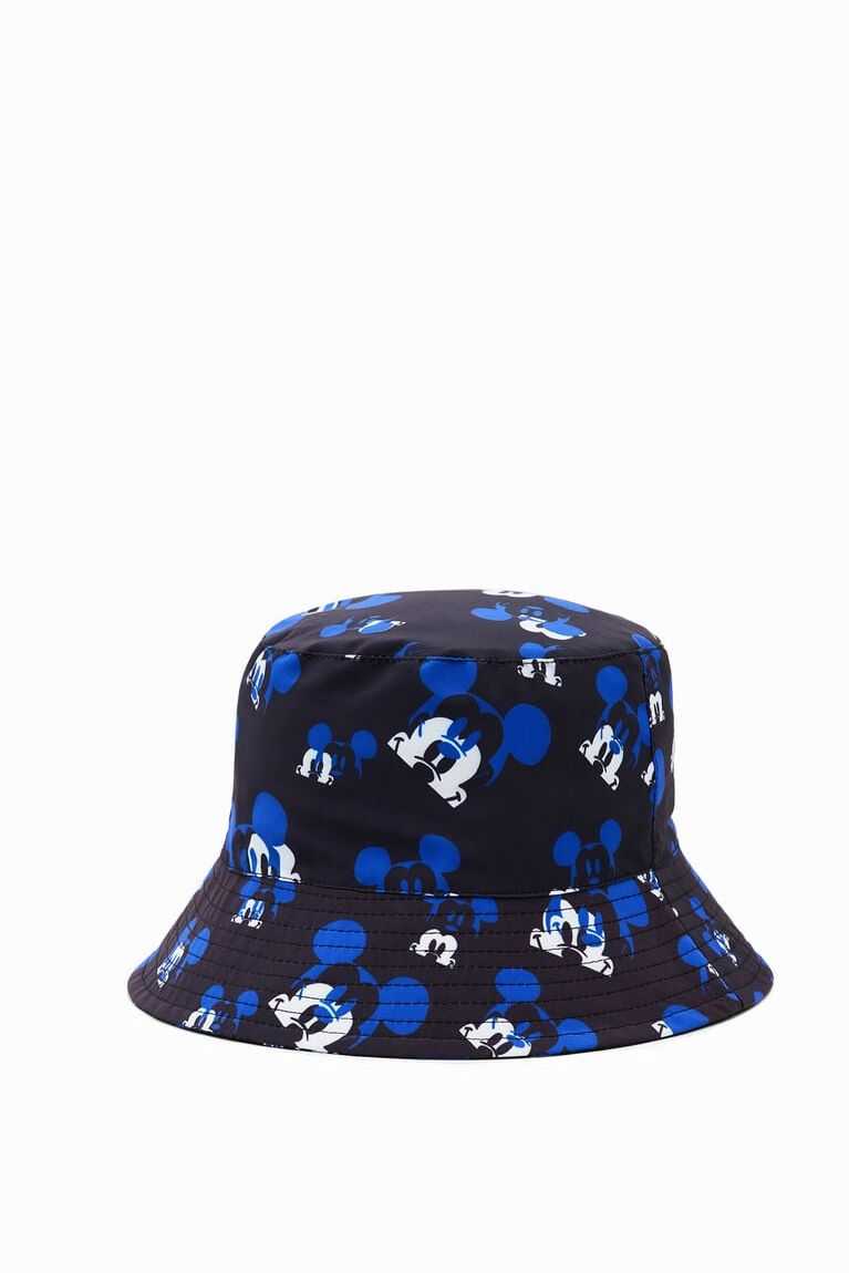 A very light bucket rain hat with a print of Disney's Mickey Mouse.