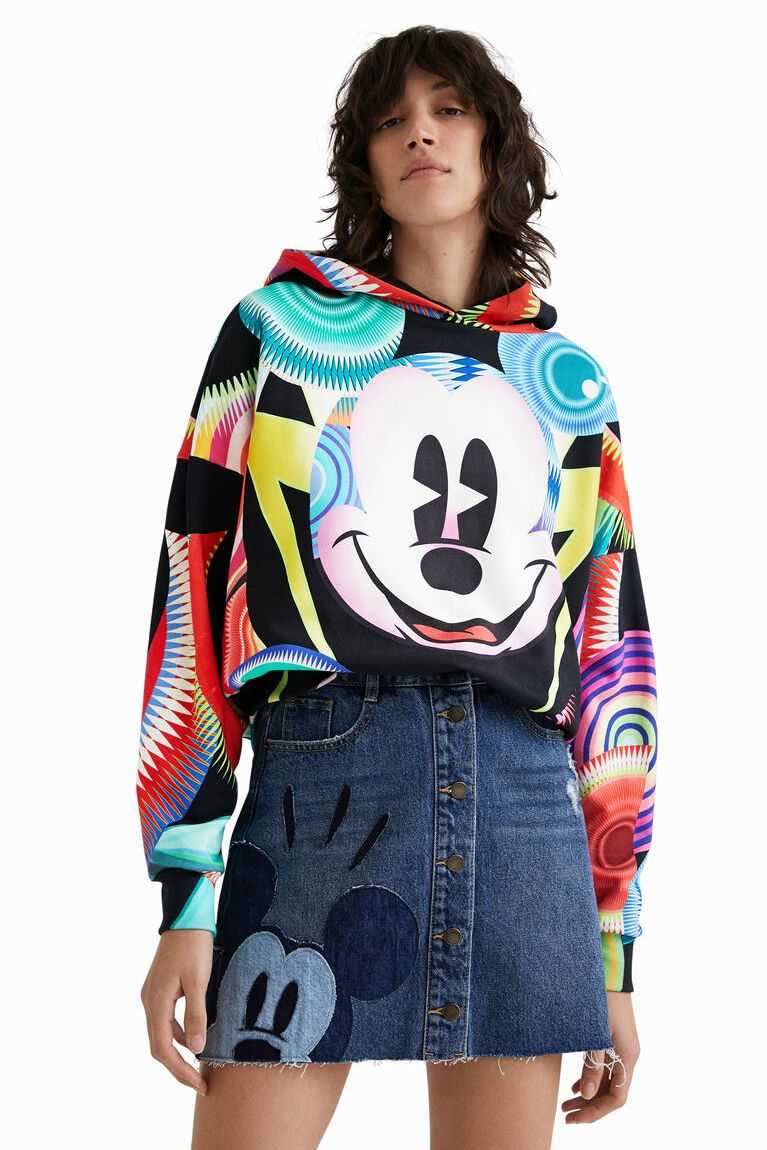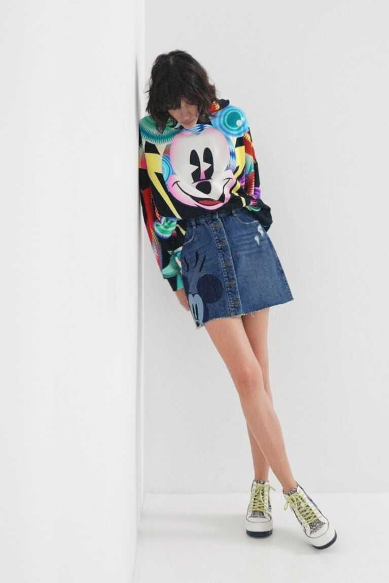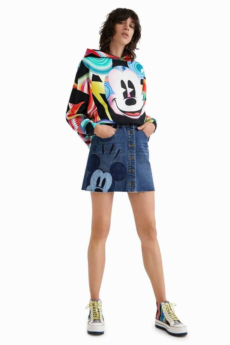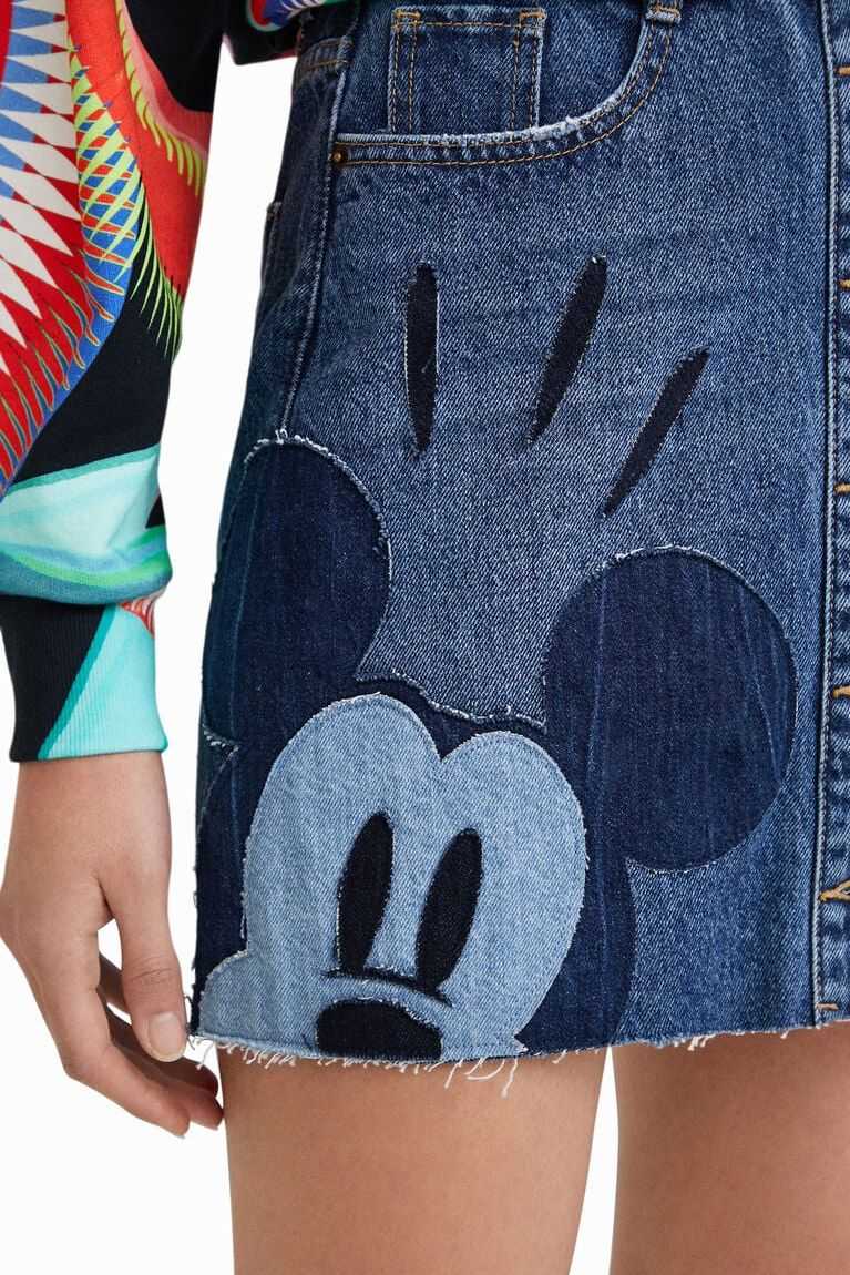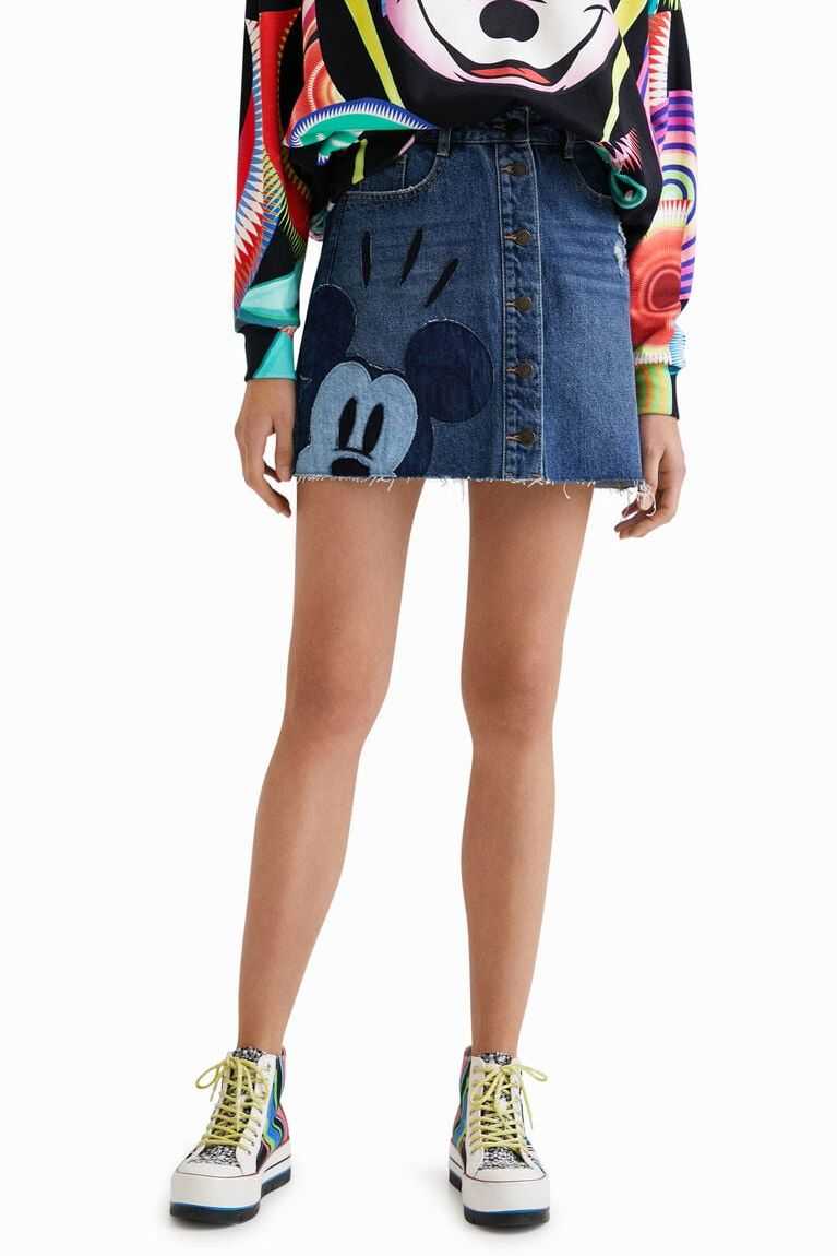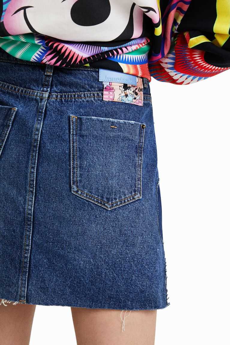 An A-line shape and button fastening on a denim miniskirt with a denim patchwork featuring Disney's Mickey Mouse. Plus a raw-cut finish and Disney's Mickey and Minnie Mouse vintage print on the back pocket. Made from sustainable cotton.