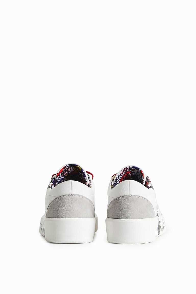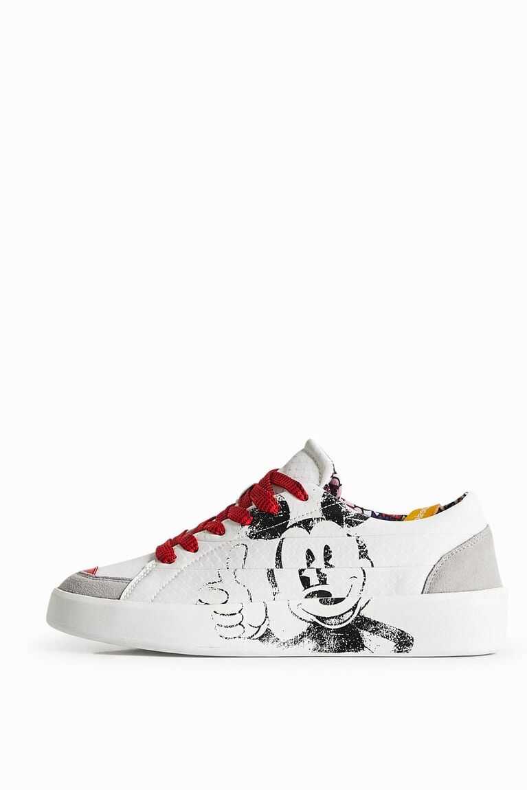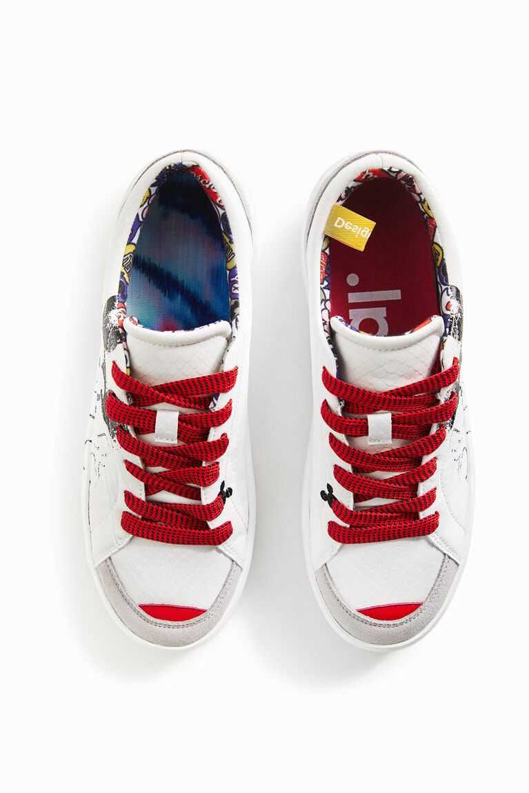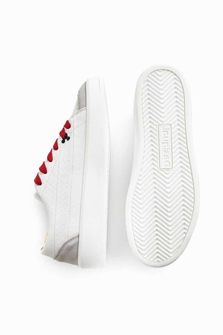 A thick and comfortable sole and a patchwork graphic of Disney's Mickey Mouse define these white snakeskin-effect lace-up sneakers.