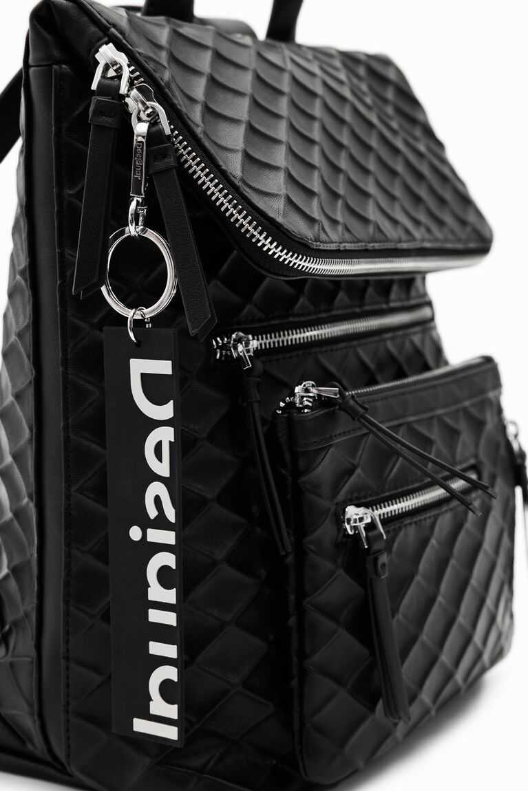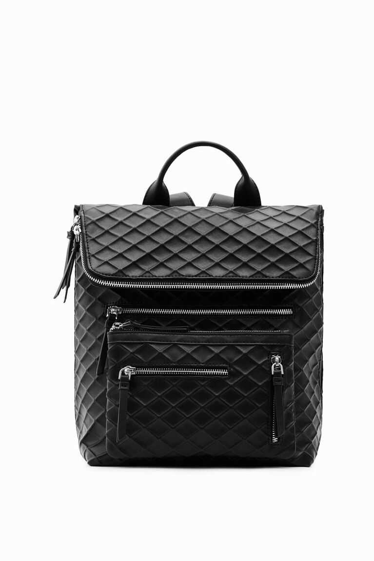 A midsize backpack with diamond embossing, a zipped flap closure, and multiple straps and pockets.