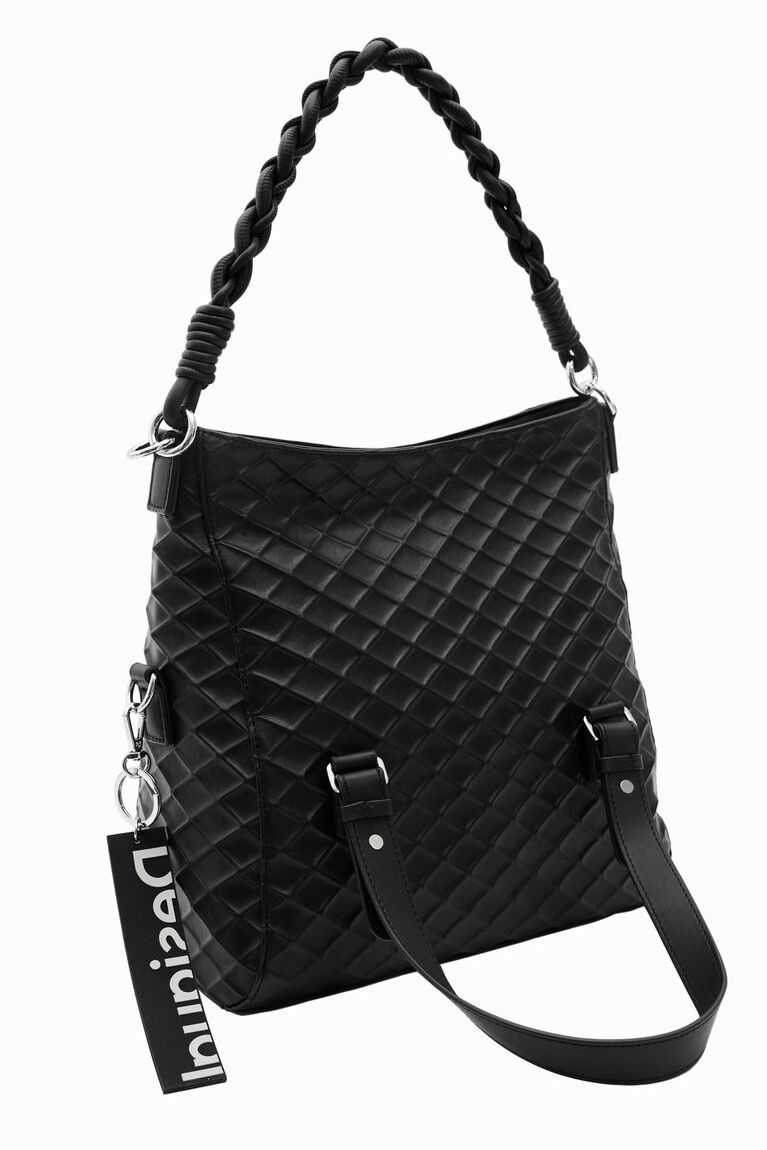 A midsize multi-position bag in leather-effect fabric with an embossed diamond pattern, a removable keyring, and several handles and pockets.