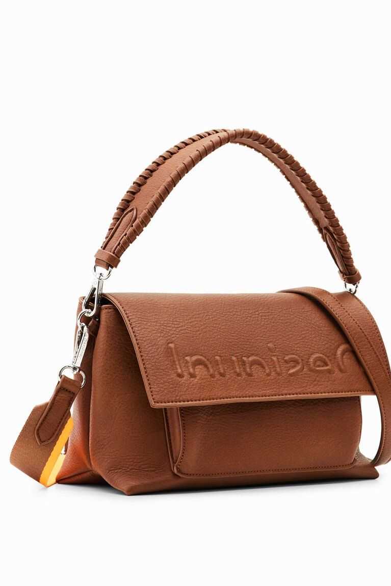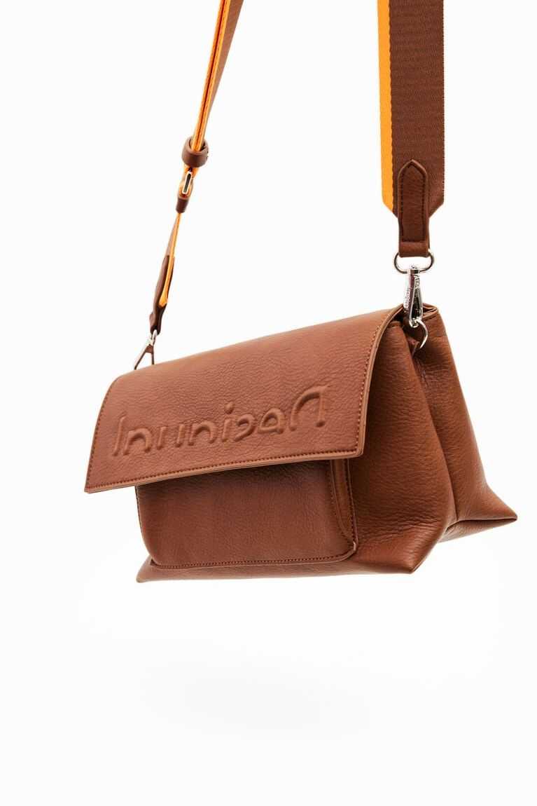 A crossbody bag in leather-effect fabric with an embossed half logo, a flap, and several straps, compartments and pockets.
