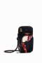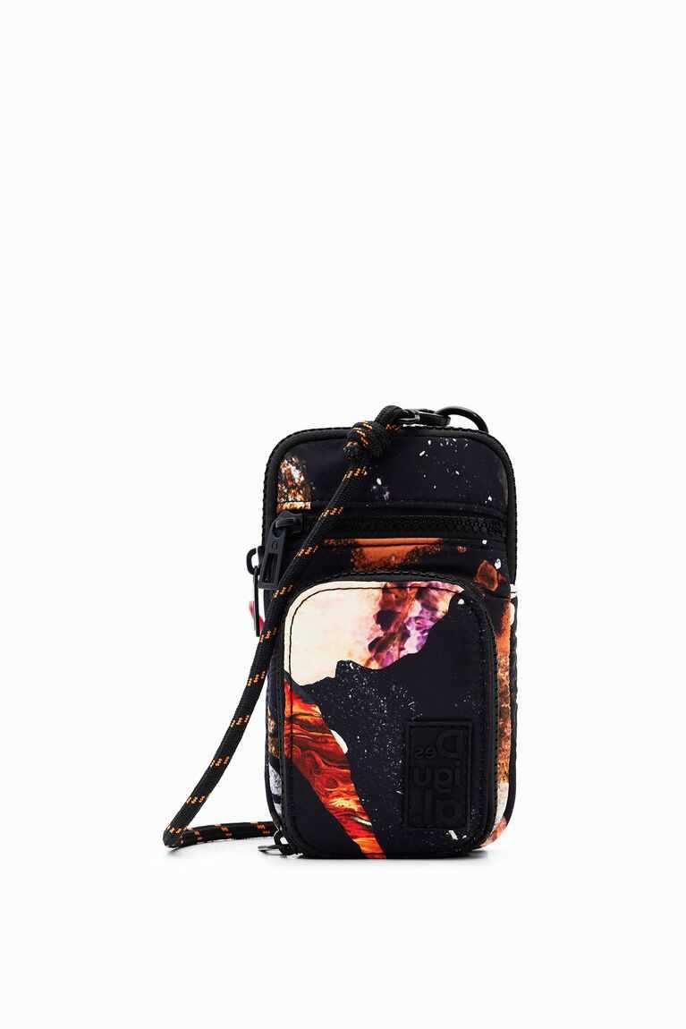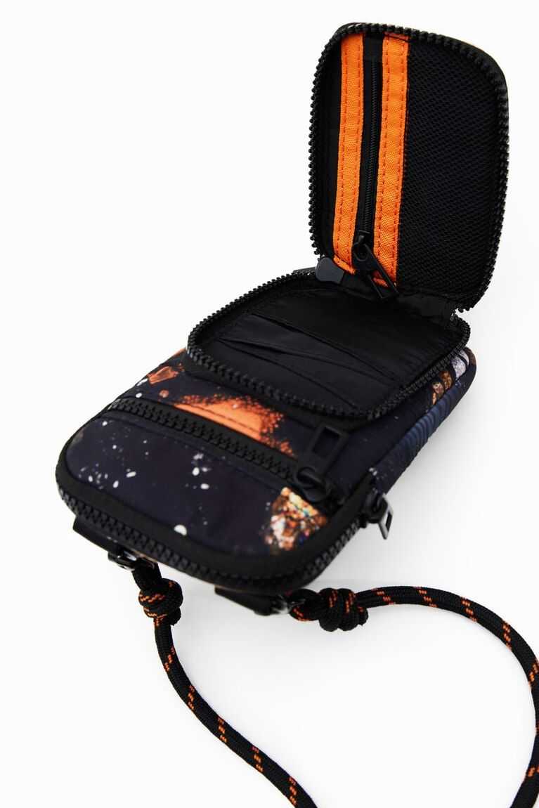A printed smartphone purse with an integrated change compartment, several pockets and a long detachable lanyard.