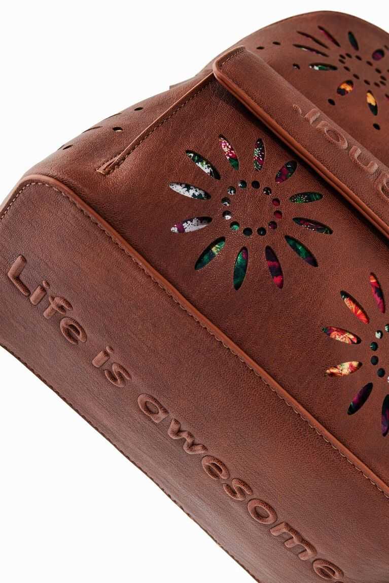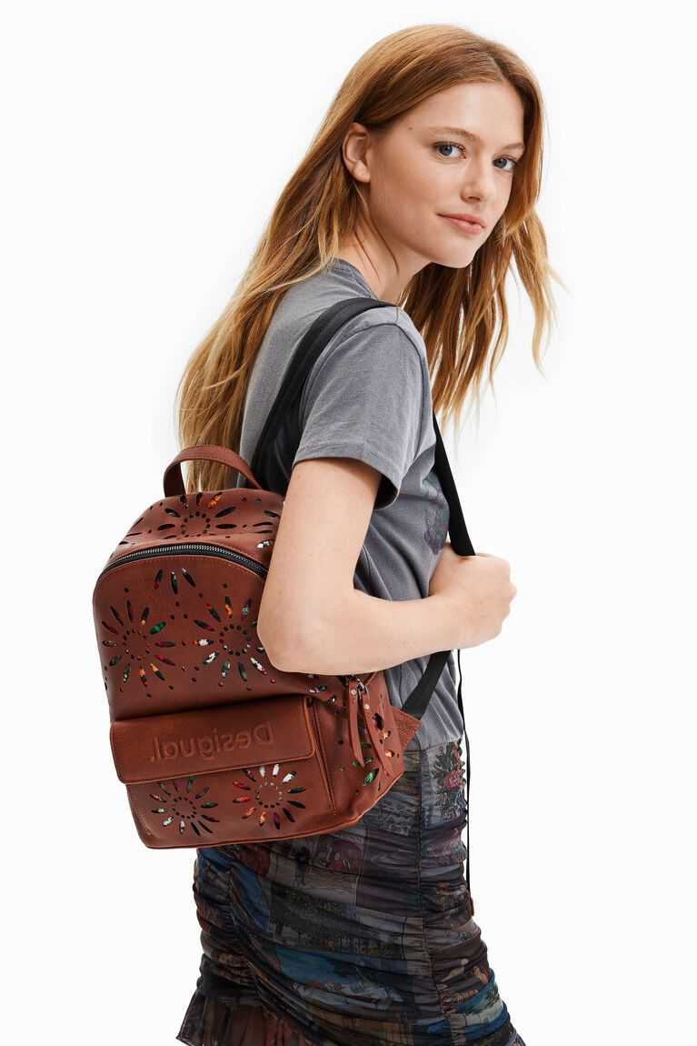 Faux-leather backpack in camel colour with die-cut flowers and a large front pocket. Small size and maximum lightness.