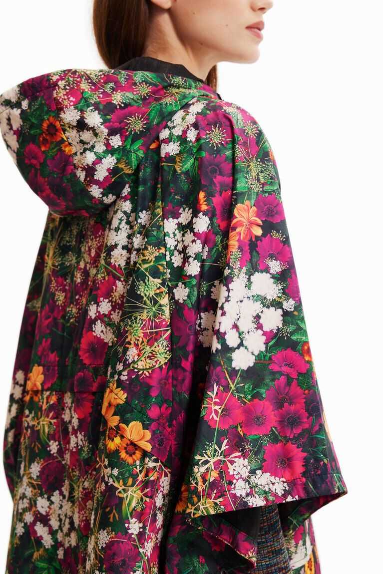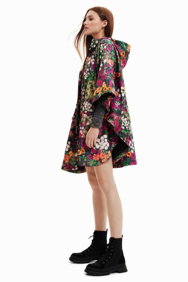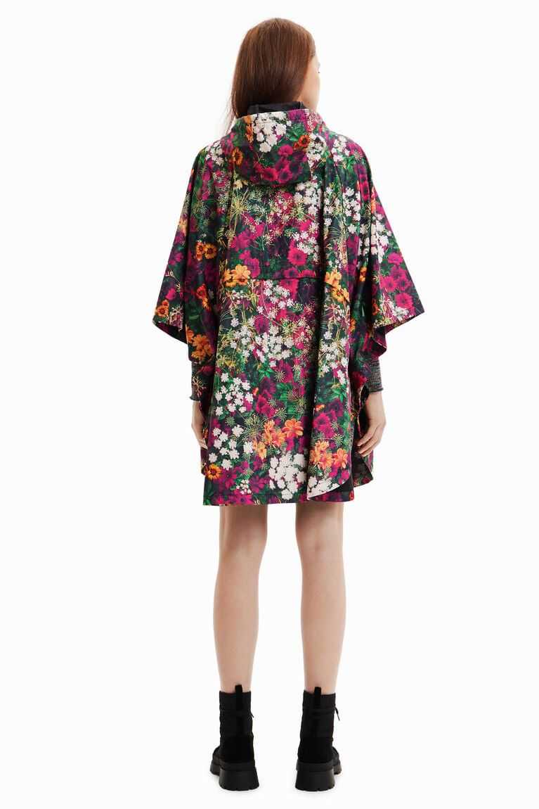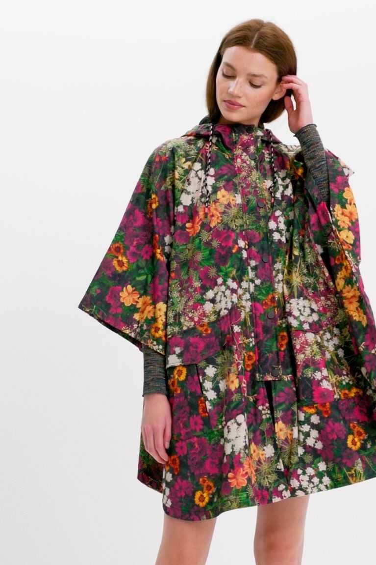 Midi-length waterproof raincoat with a hood featuring forest-inspired mini flowers. With bat sleeves that can be adjusted at the neck with a drawstring