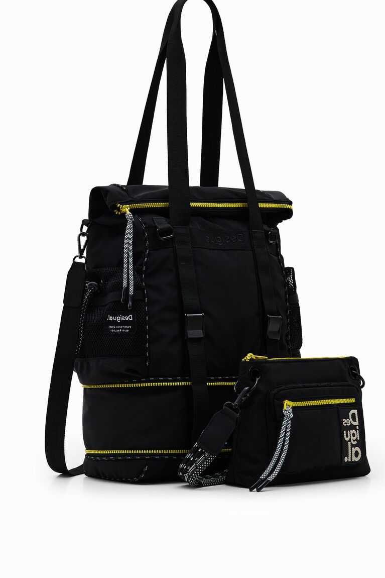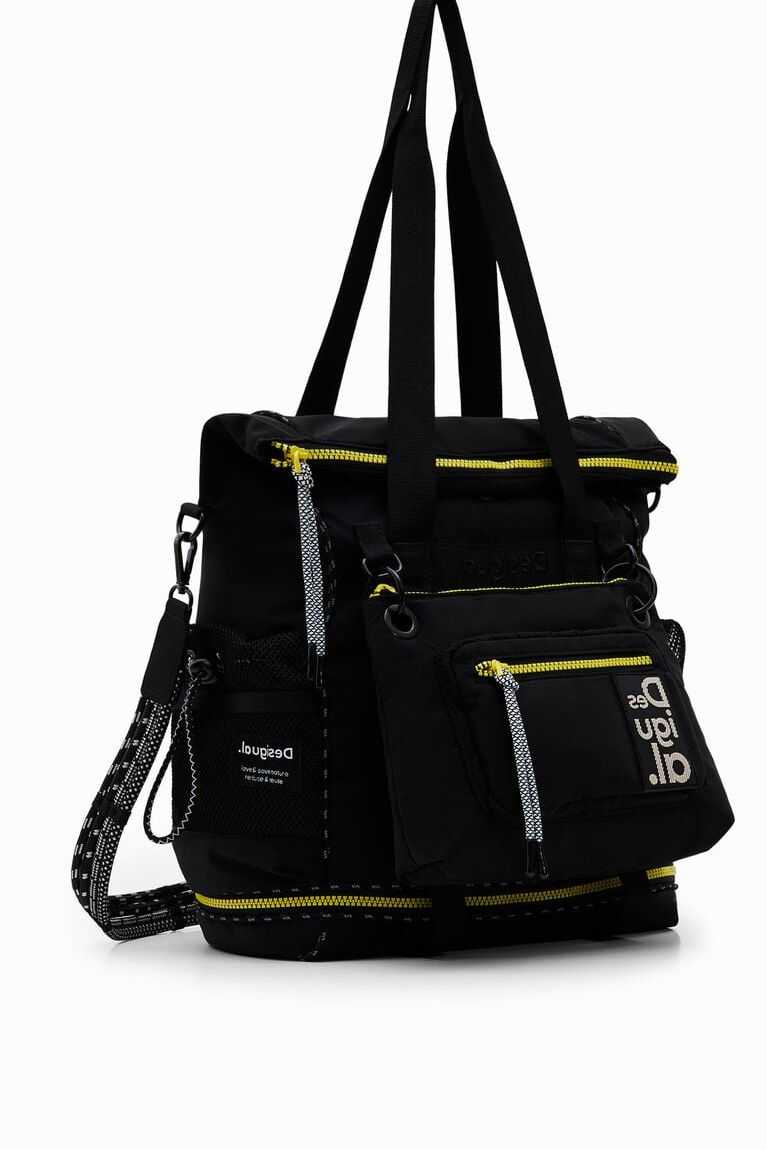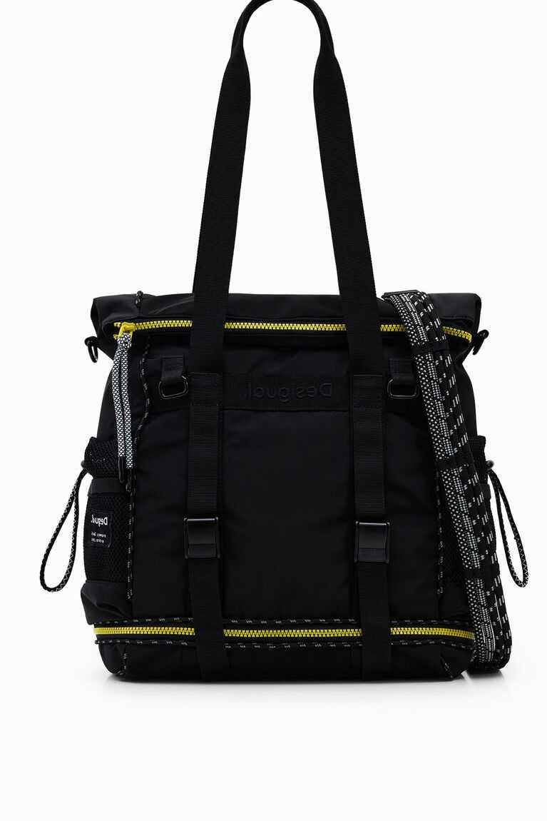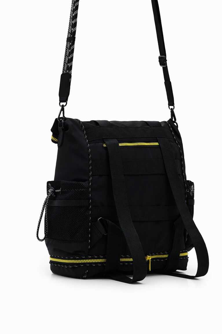 Multi-position backpack that can be carried as a handbag. It has several detachable handles and multiple accessories. Lightweight and versatile.