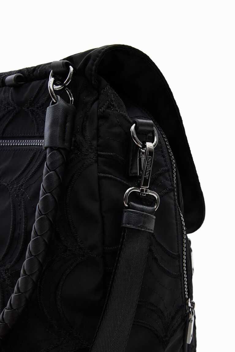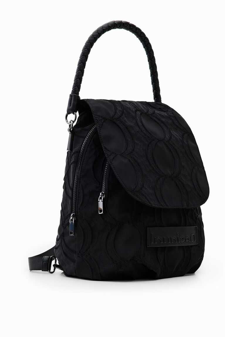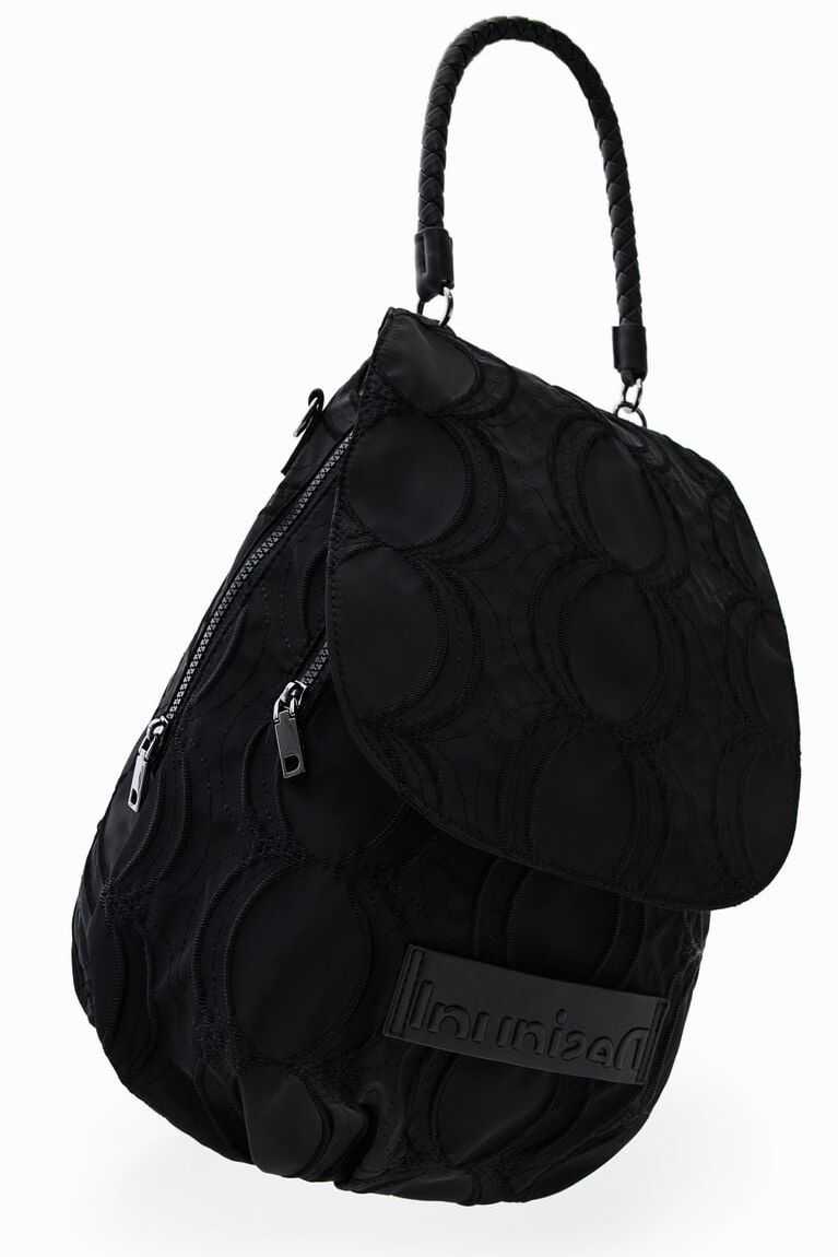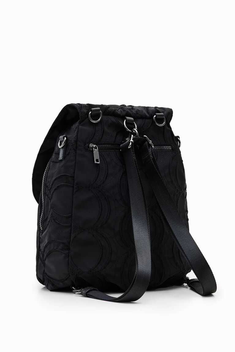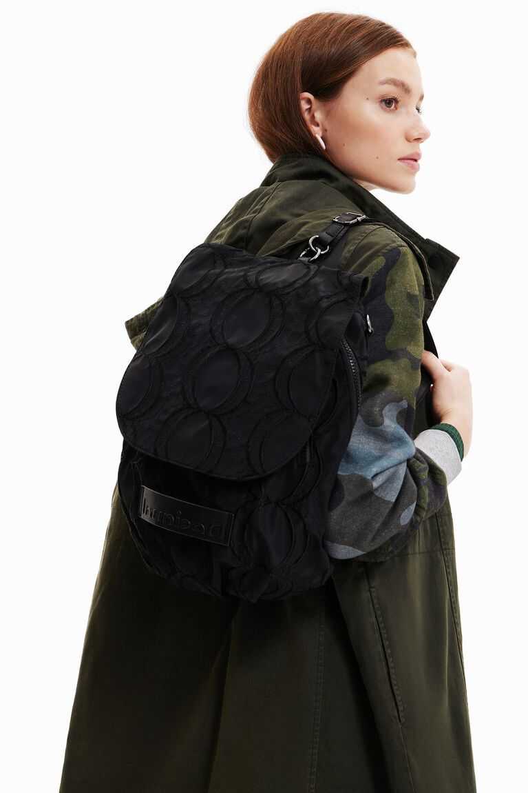 A very versatile backpack that can also be a handbag. In plain colour fabric embossed with circles.