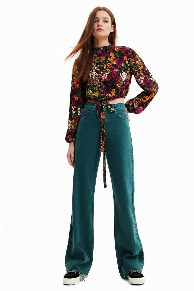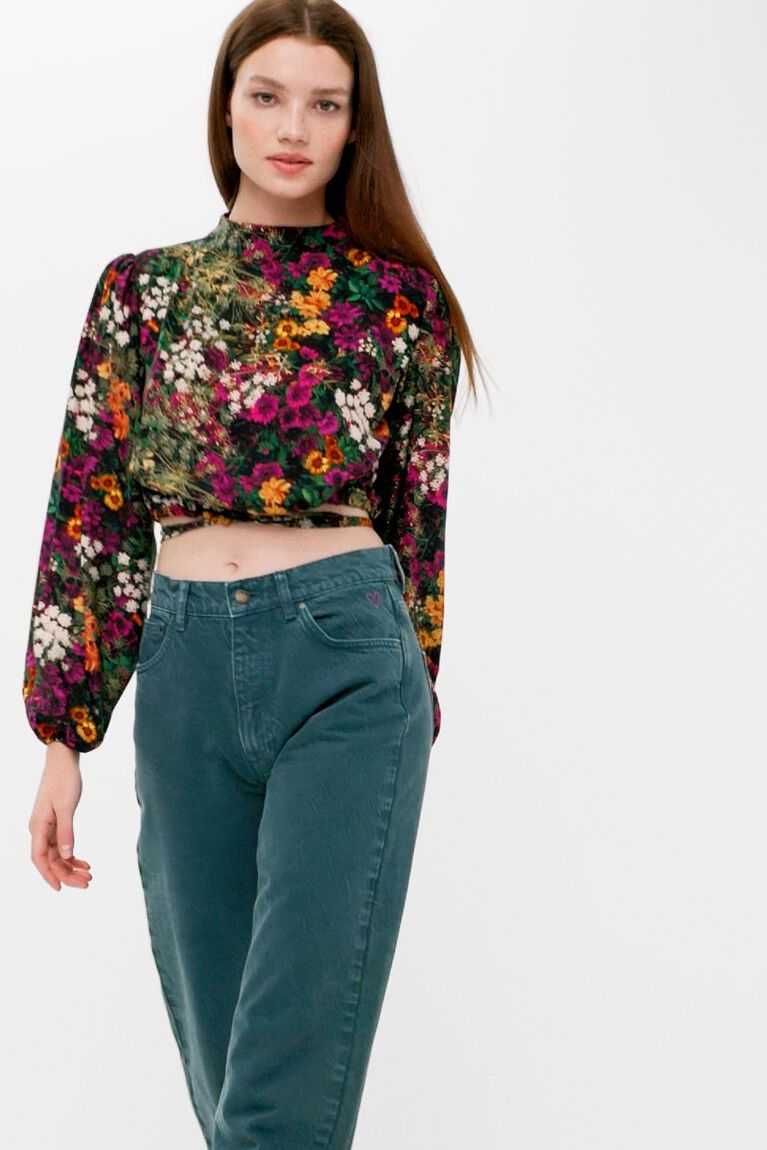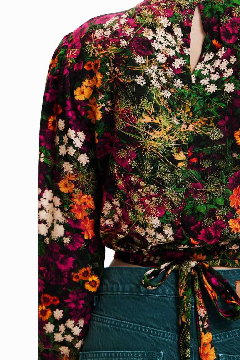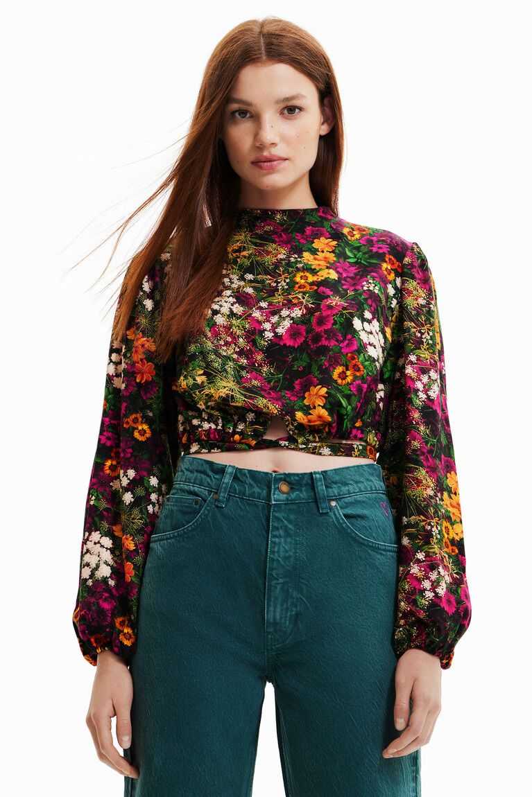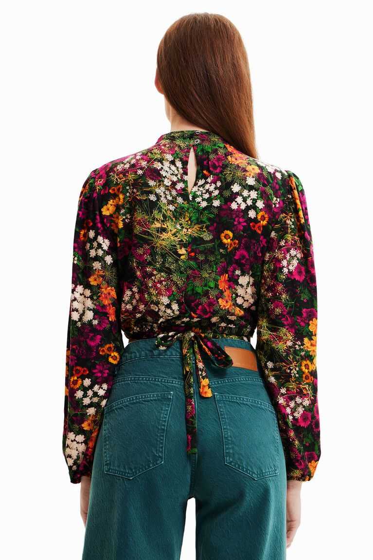 A cheerful floral print on this short blouse with multi-position lacing: can be tied at the front or wrapped around the body. Made with sustainable fibres.
