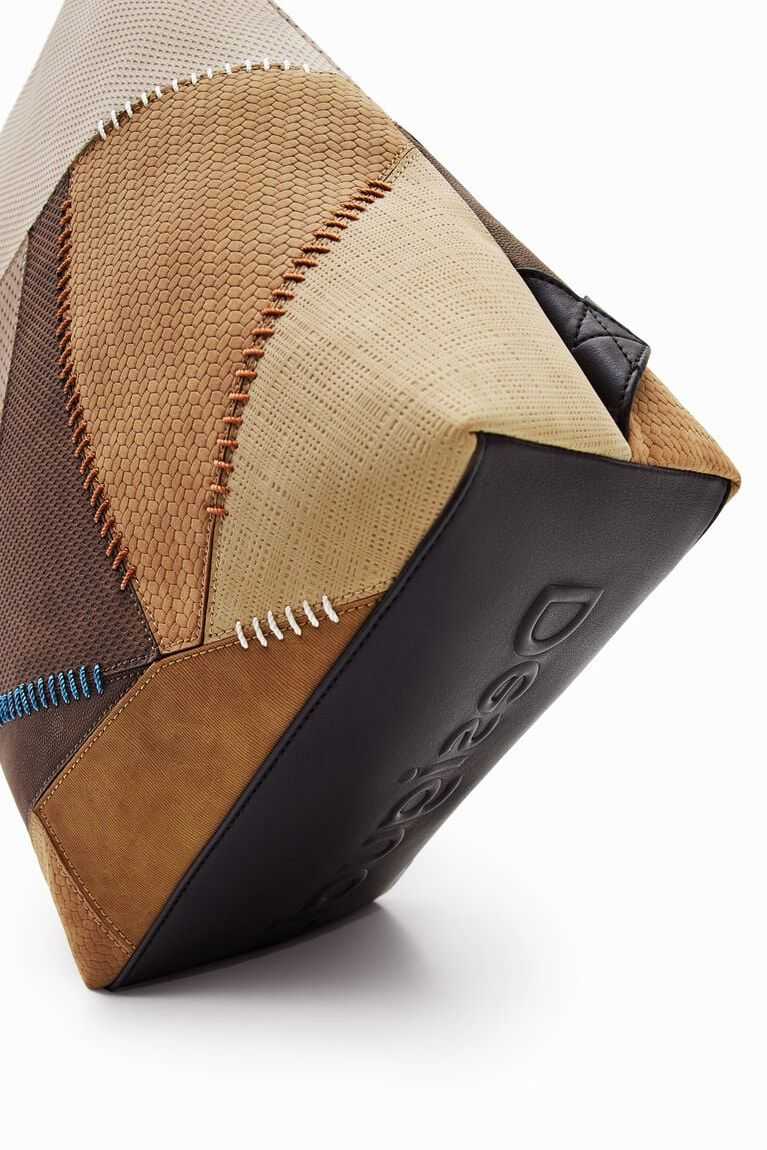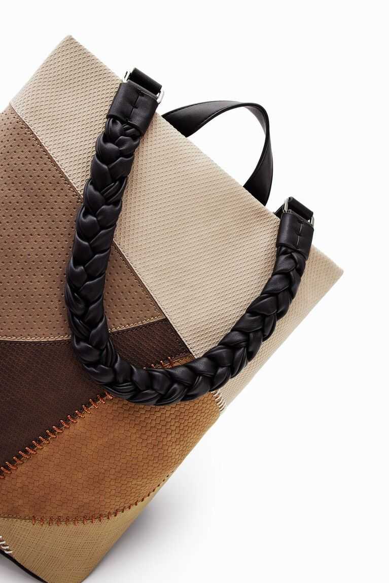 PU backpack with a patchwork of different textures and coloured backstitching. Features multiple straps so it can be used as a bag or backpack.
