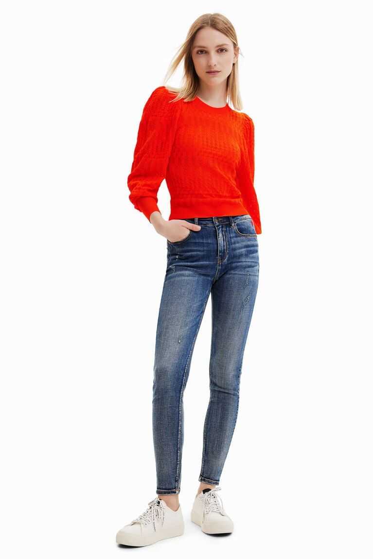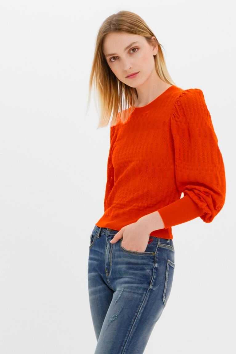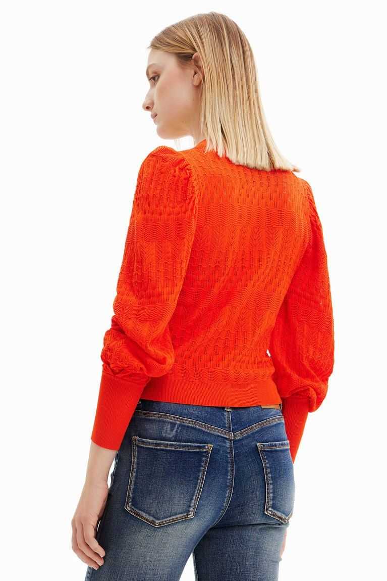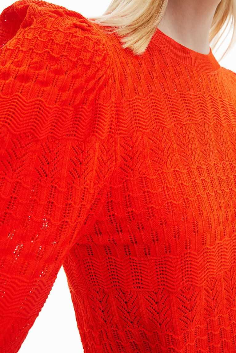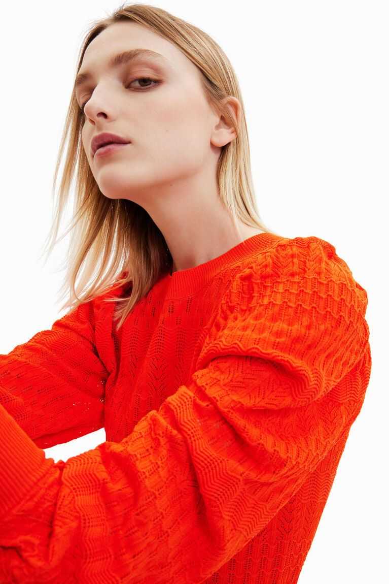 An openwork knit pullover with balloon sleeves and a design with different motifs.