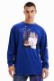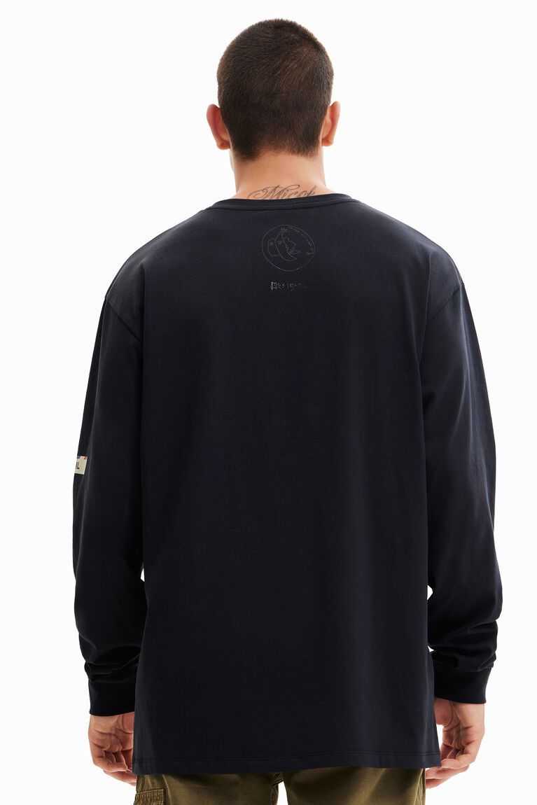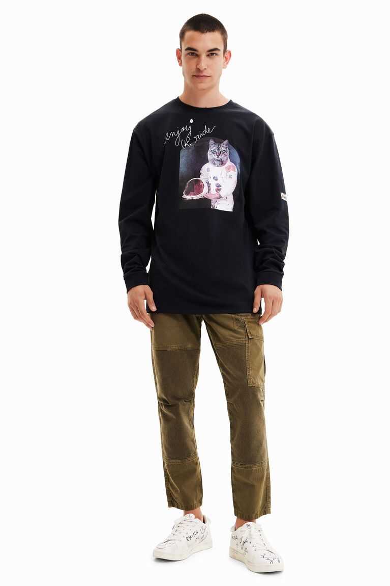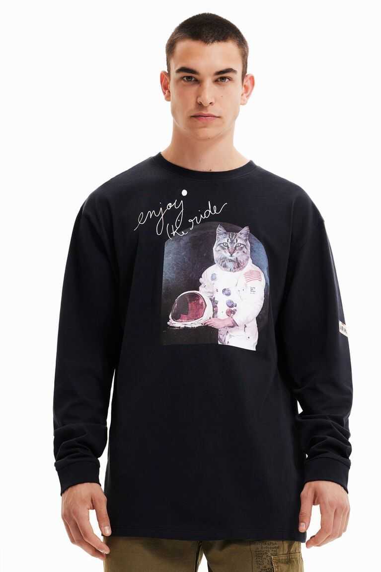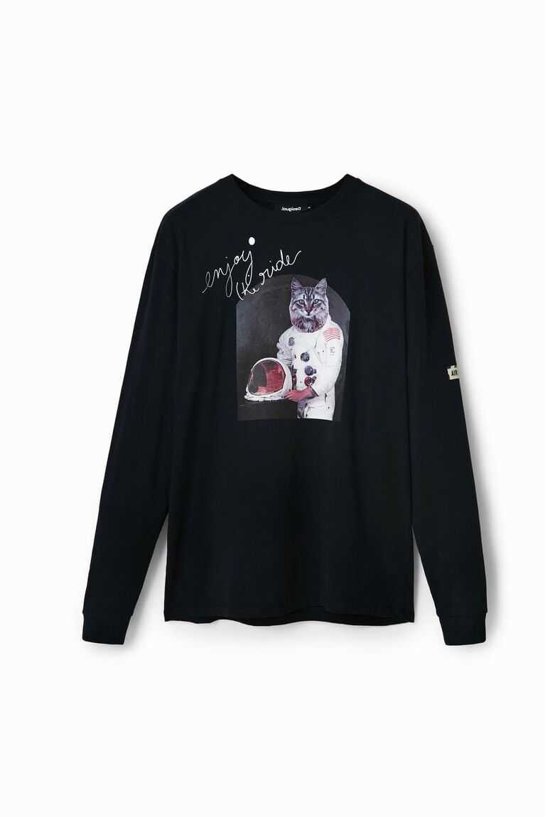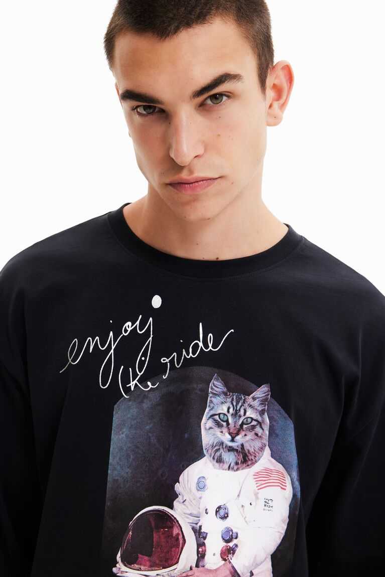 A loose fitting long-sleeve T-shirt featuring an astronaut cat print and "Enjoy the ride" message.