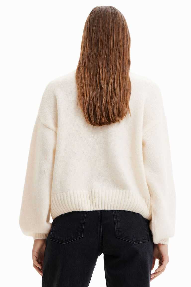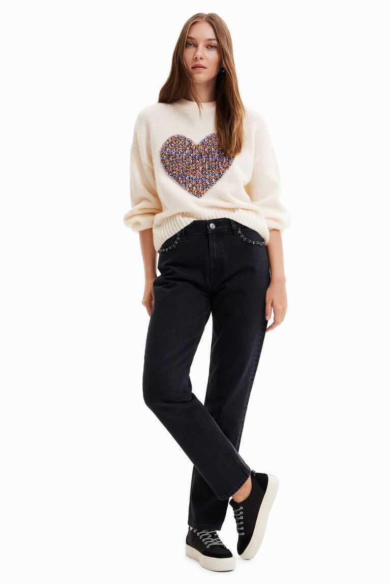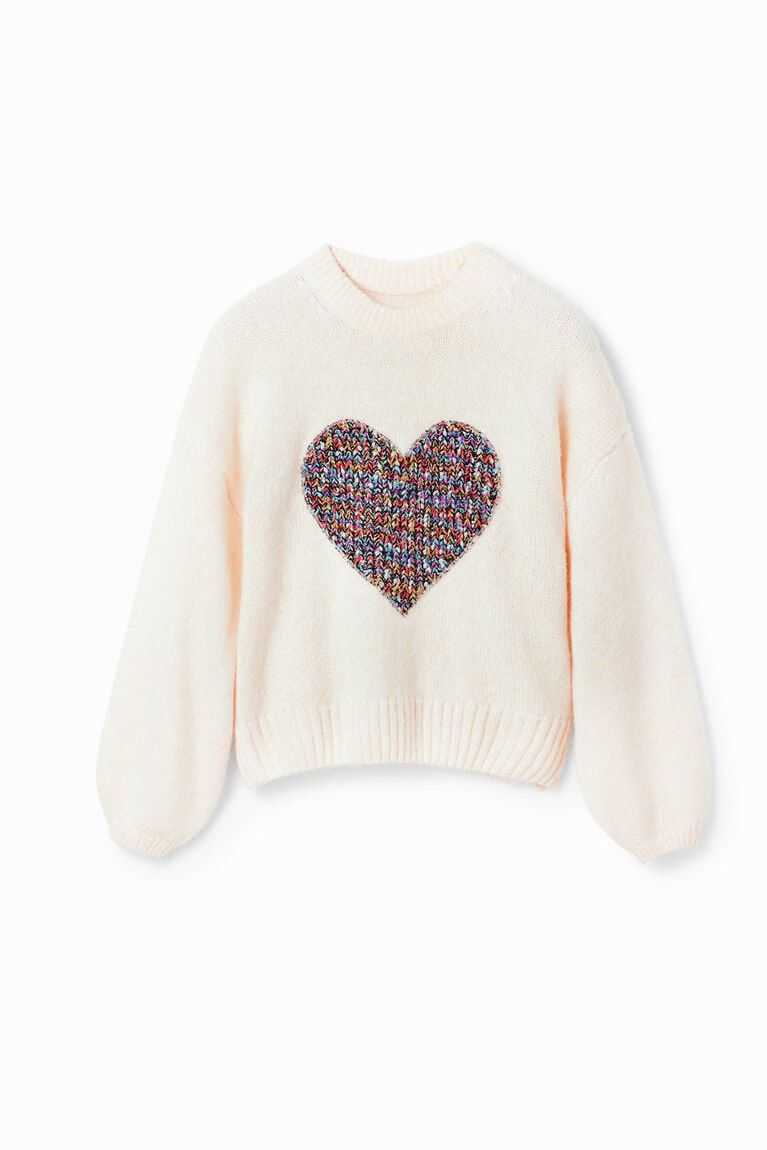 A loose, long-sleeve pullover in chunky knit with a multicoloured, ribbed heart patch on the front.