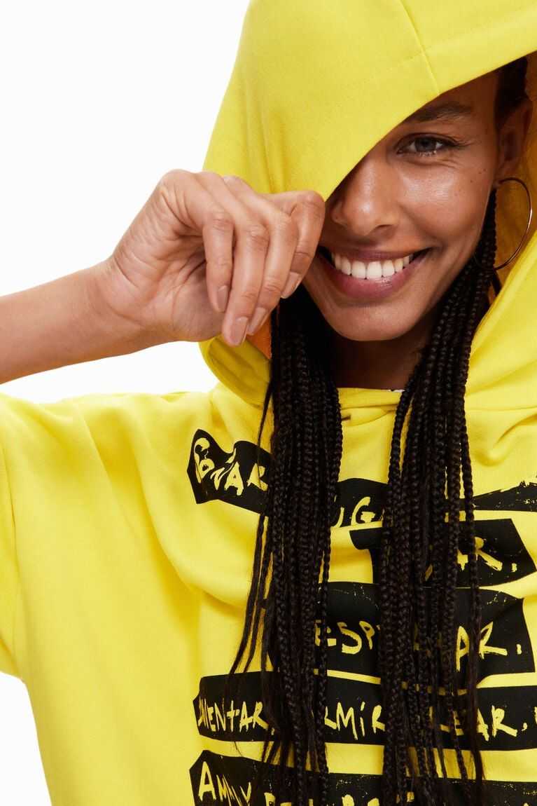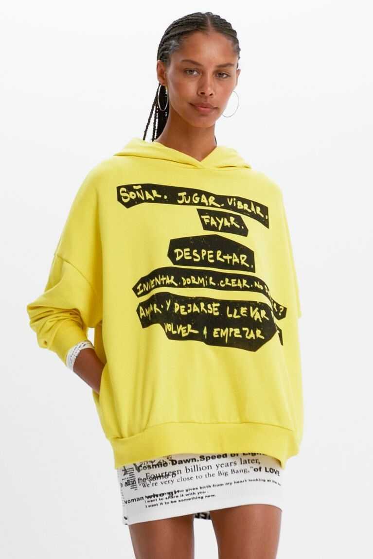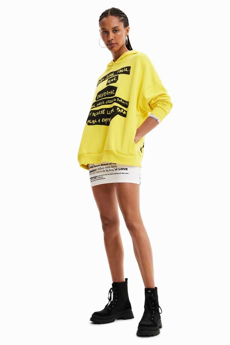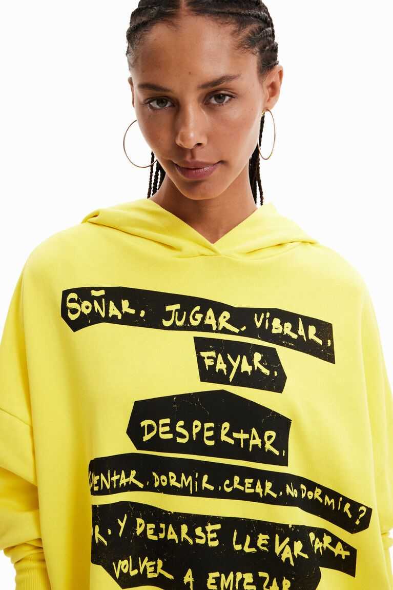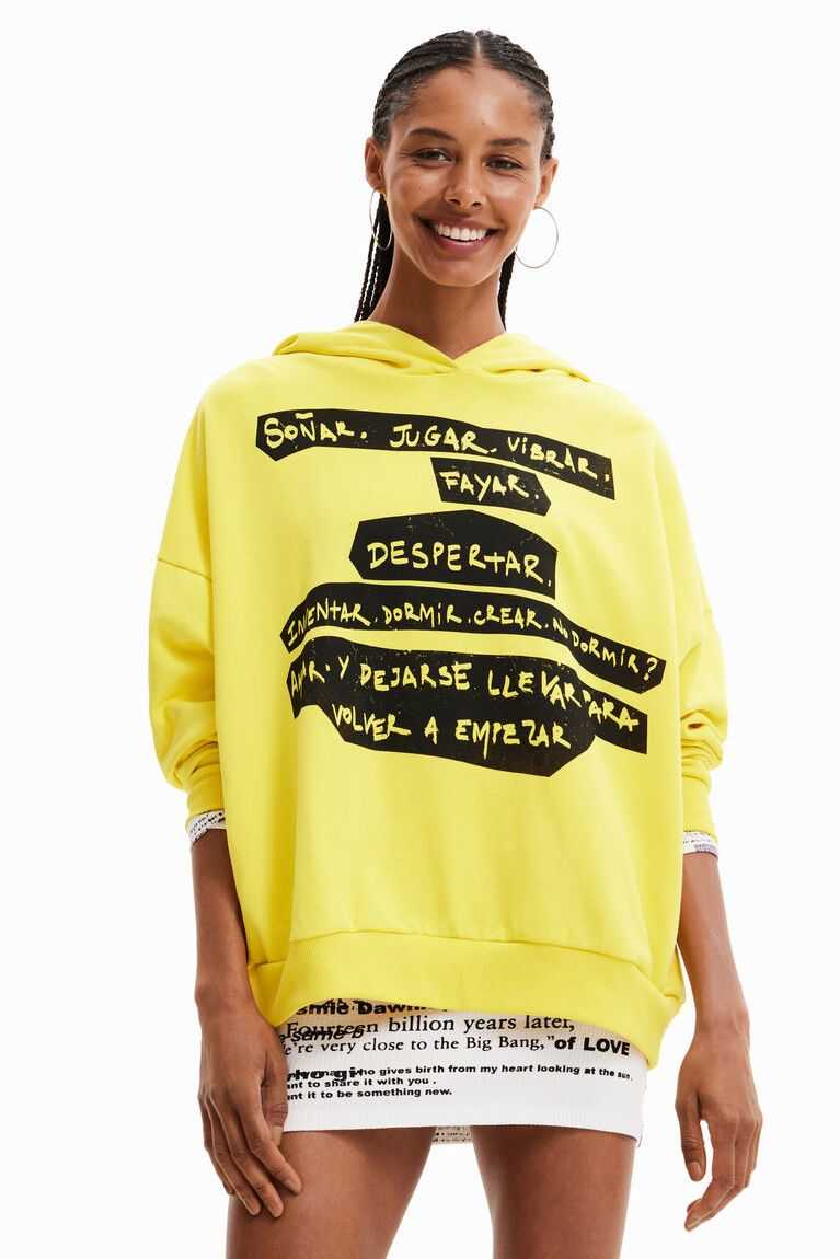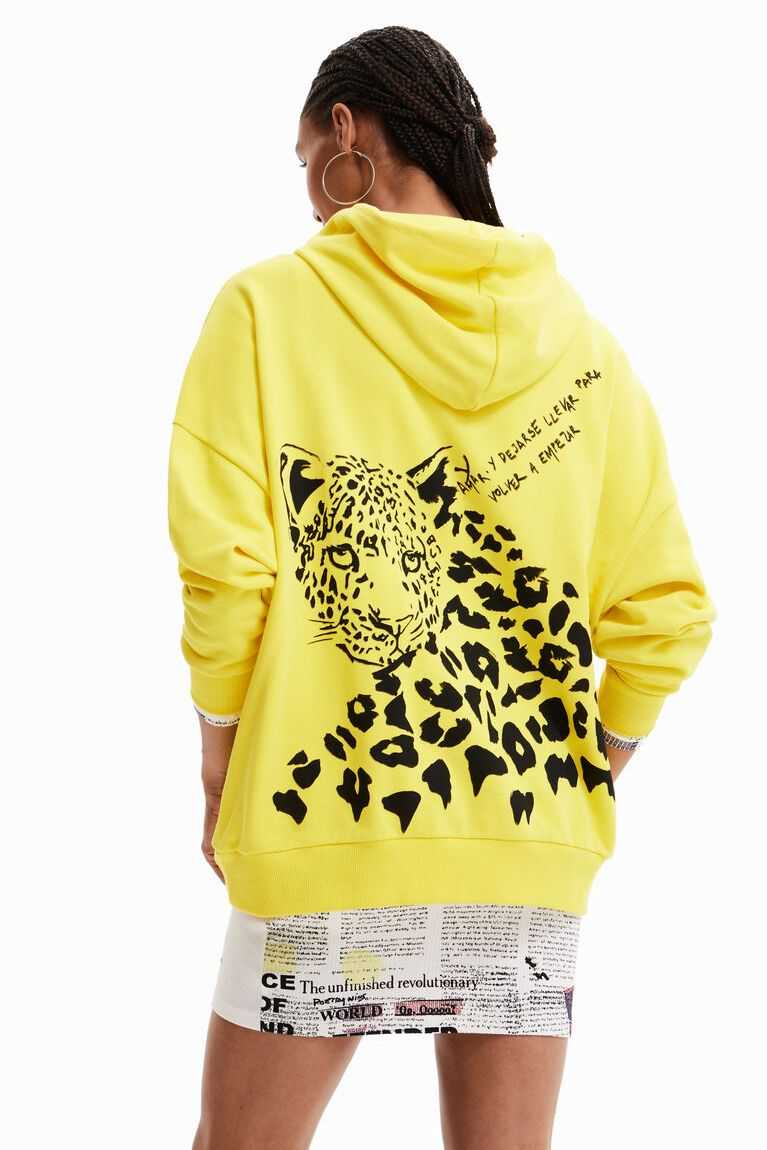 This oversize, long hoodie is decorated with text from the Manifesto with positive messages on the front and a leopard illustration on the back.
