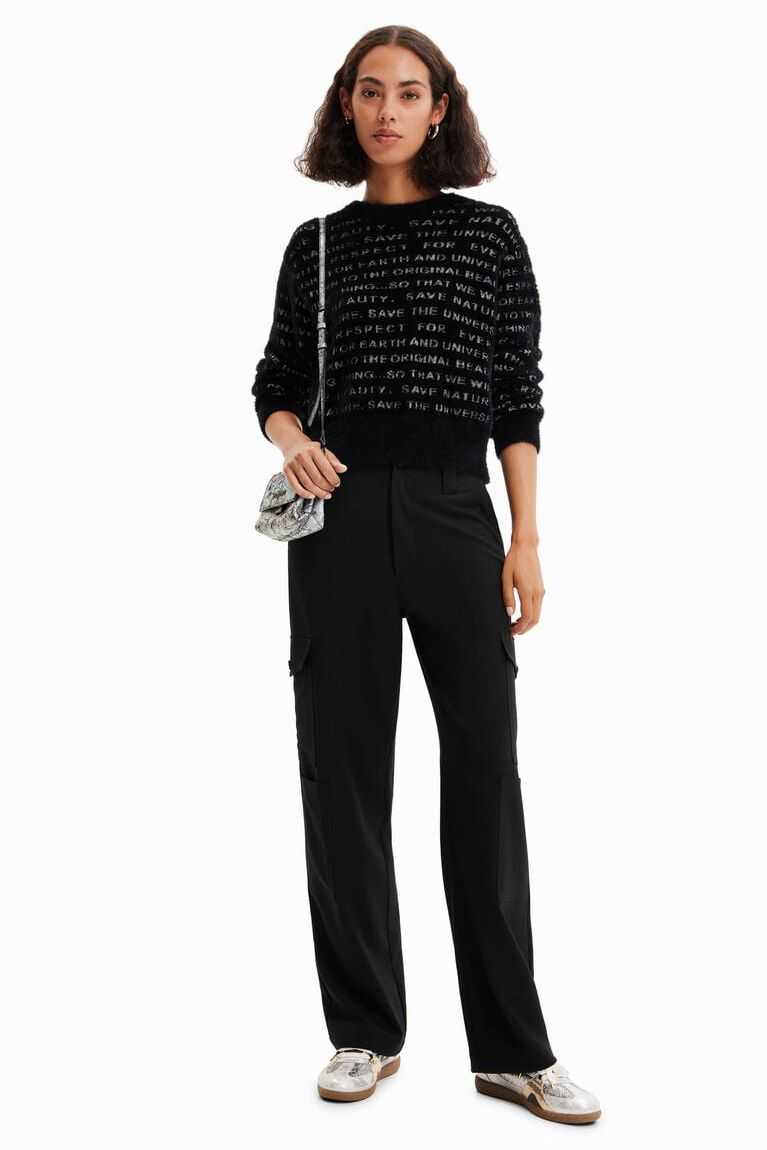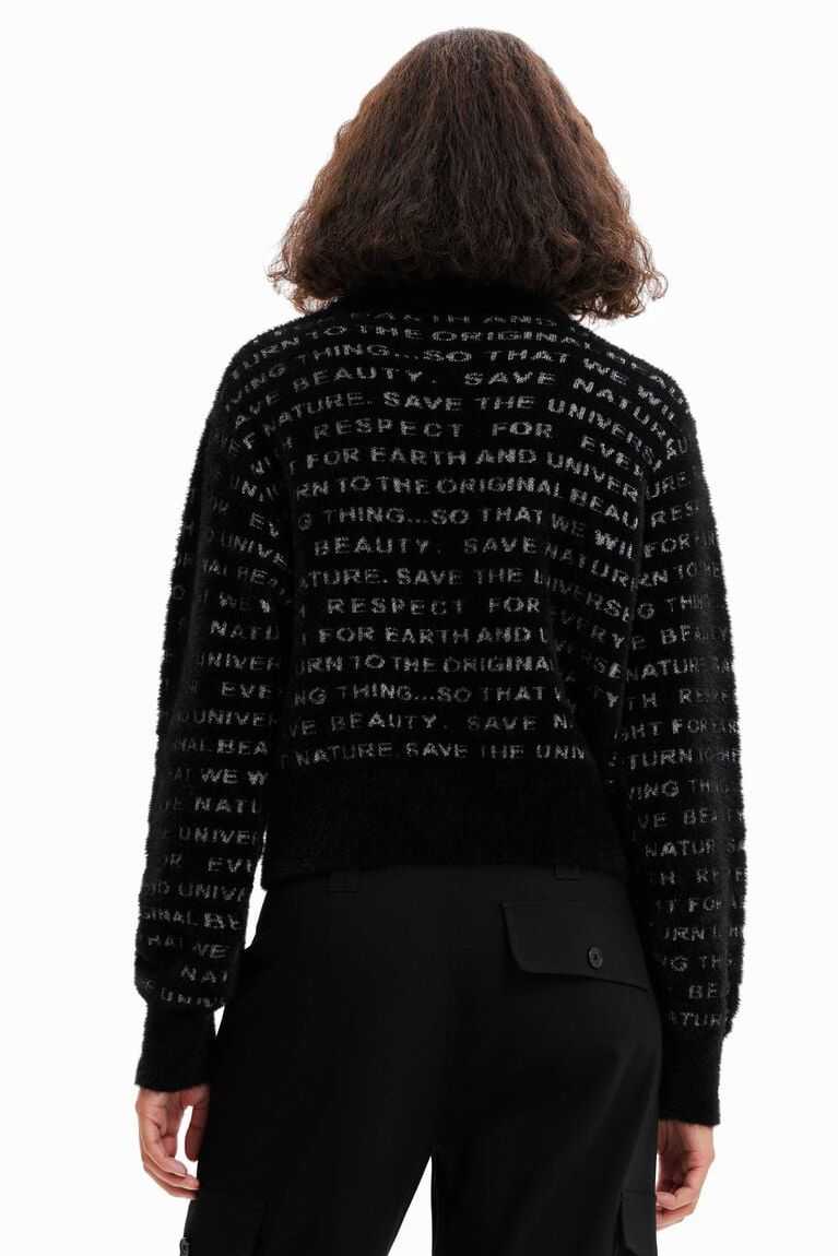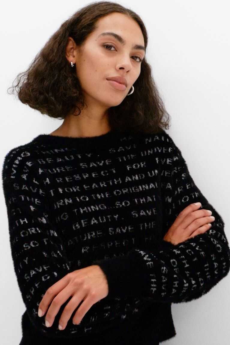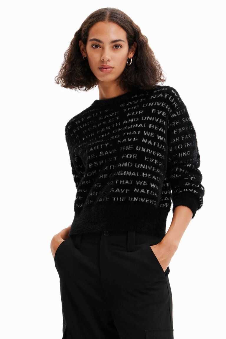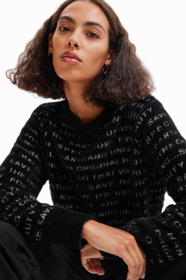 This loose-fit jumper has a fur-effect texture and is printed with text from the Manifesto in metallic-effect threads.