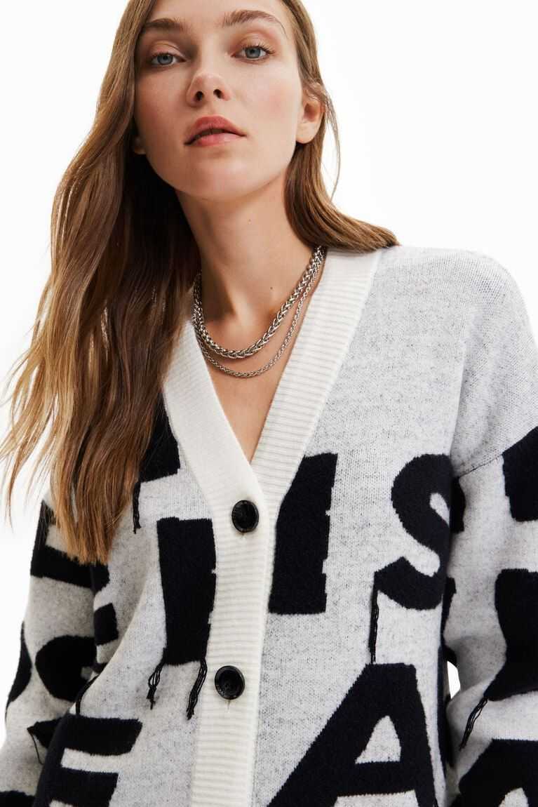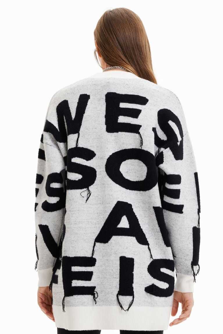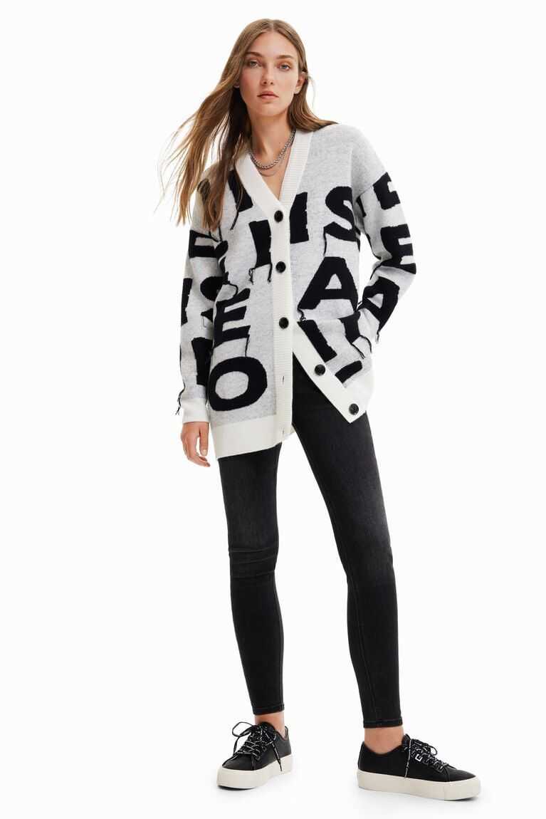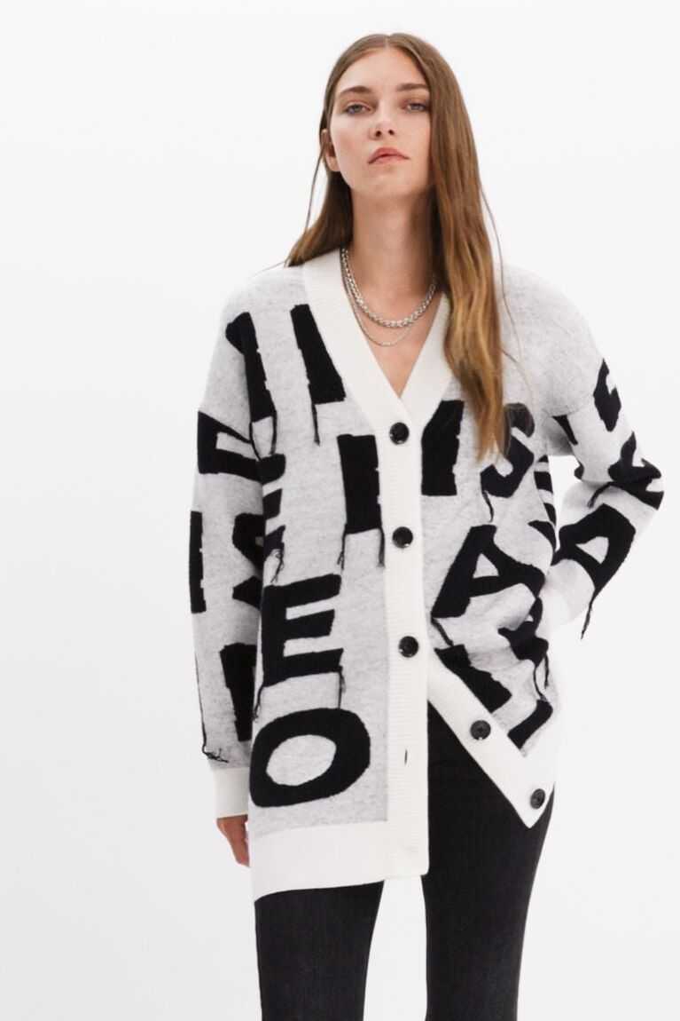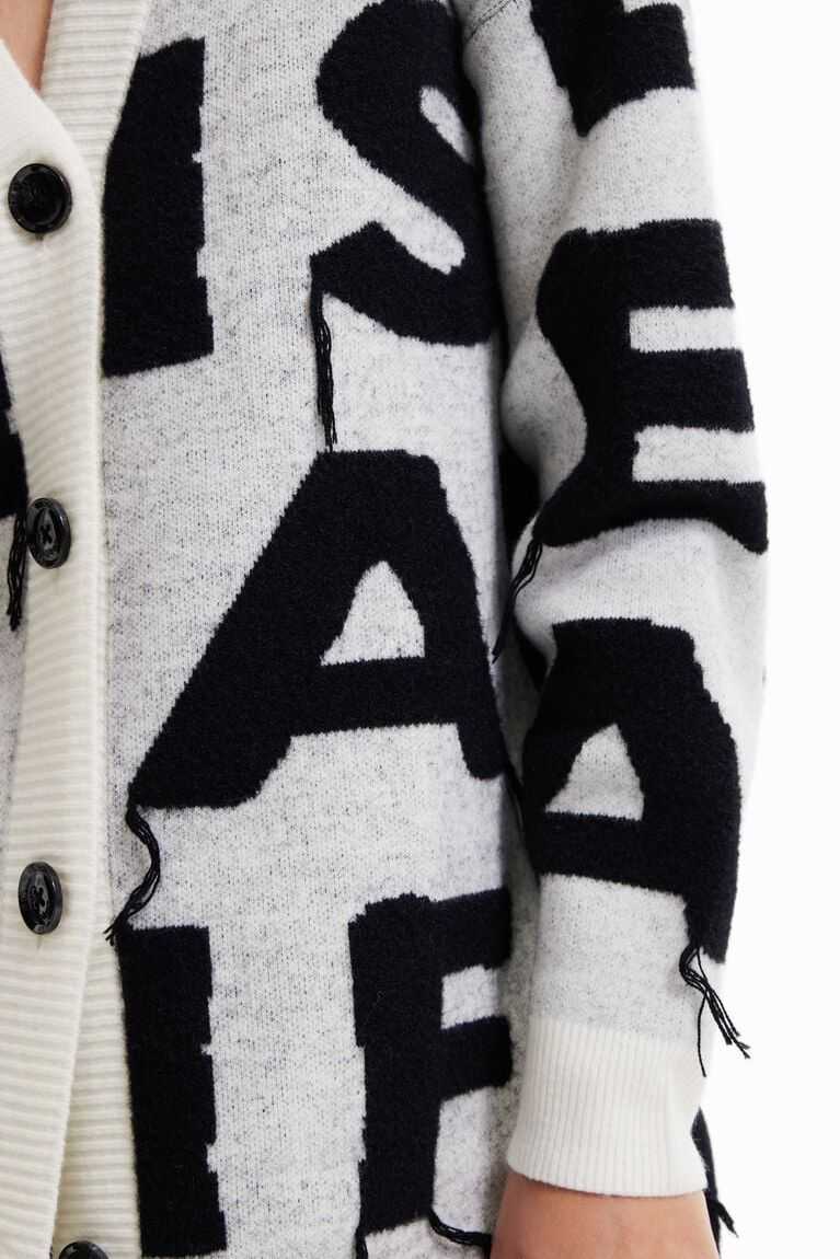 This loose-fit long jacquard cardigan features large, contrasting Manifesto lettering and fastens with big buttons.
