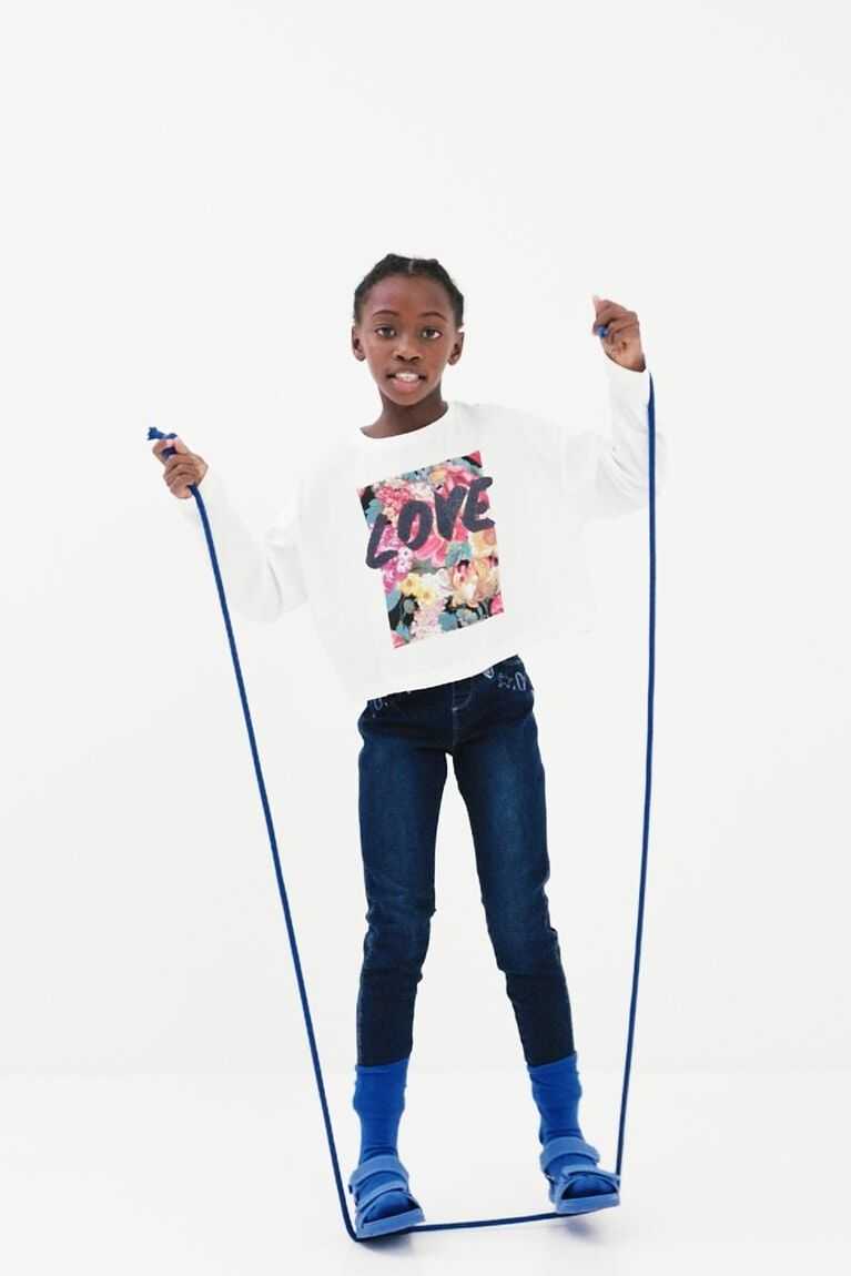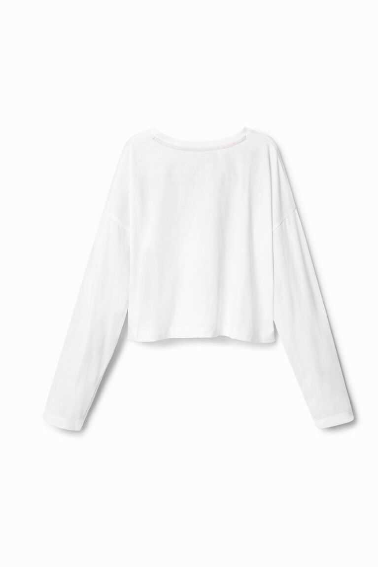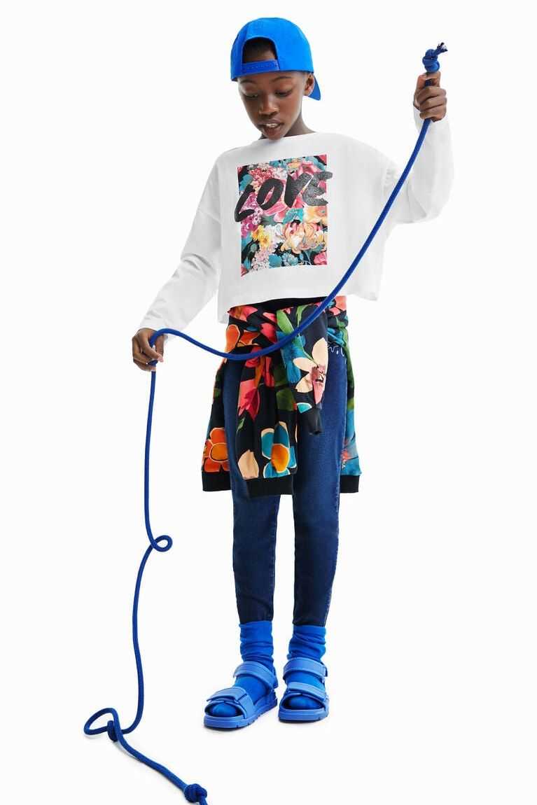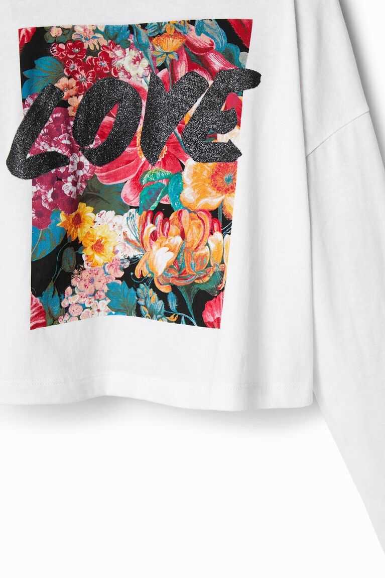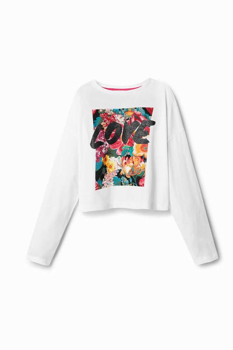 A rectangular floral print with the word "Love" in a hand-painted effect adorn the front of this long-sleeve cotton T-shirt. Cropped with an oversize fit.