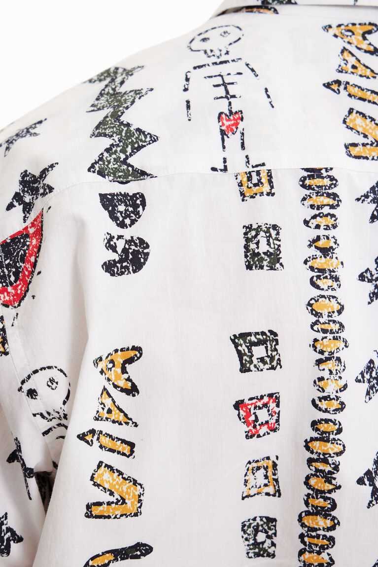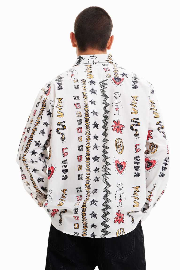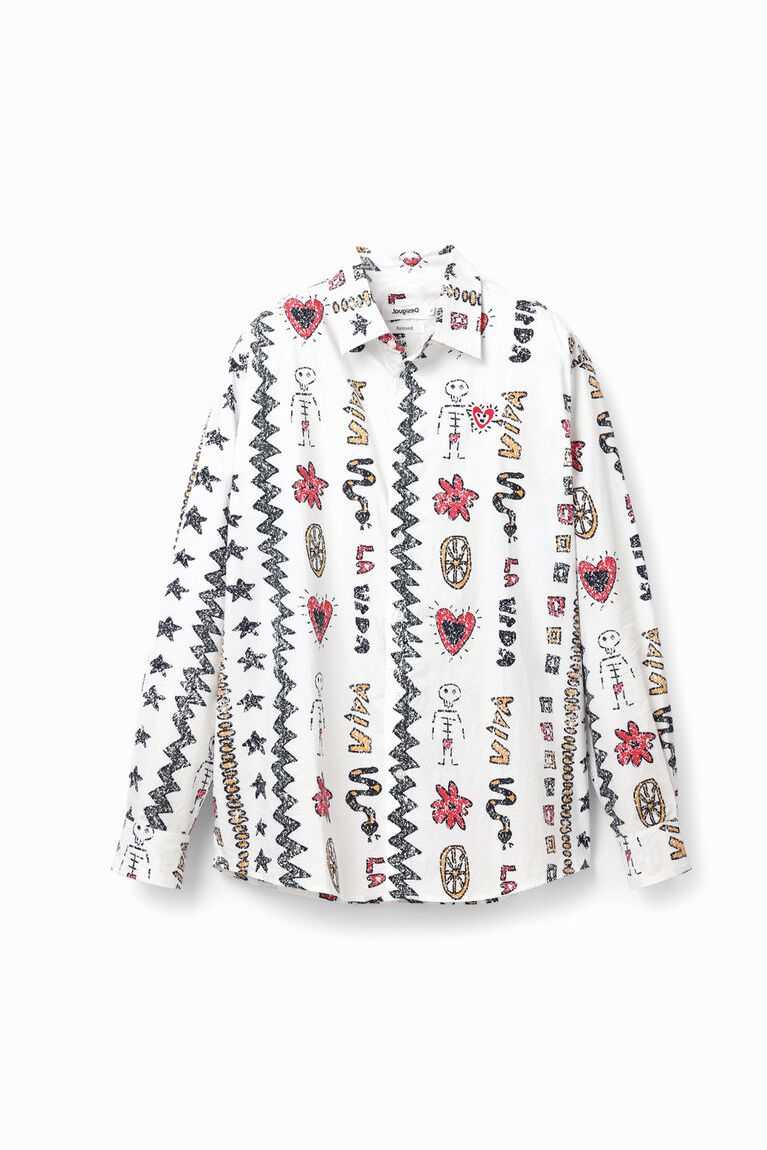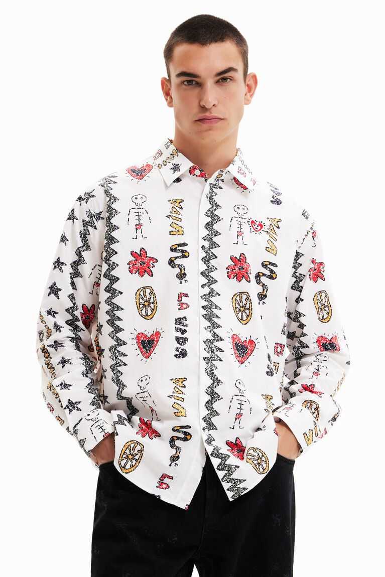 A long-sleeve, Italian collar shirt in a slightly loose fit with an all-over print featuring symbols and a "Viva la vida" message.