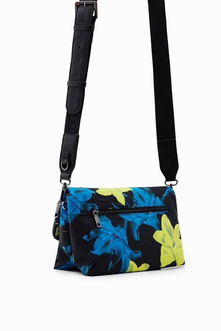 A crossbody bag that looks hand-painted with flowers in blue and yellow tones. Very light and made from recycled polyester with a coarse texture. Multiple straps and compartments.