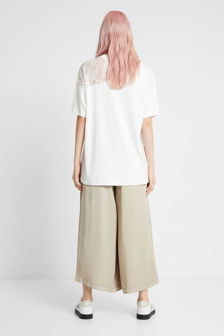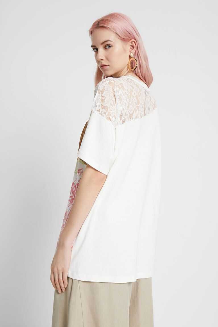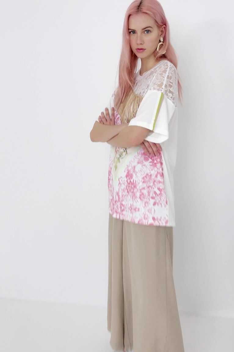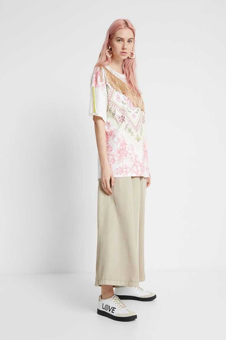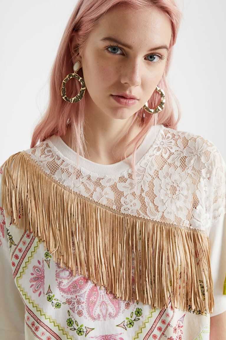 And if we join the style of the 50s with large fringes and the most modern looks? Garments emerge like this short sleeve and patch T-shirt that combines white lace with sheer fabric on the shoulders, fringe on the chest, a scarf style design in the centre and oriental friezes on the hem and sleeves.