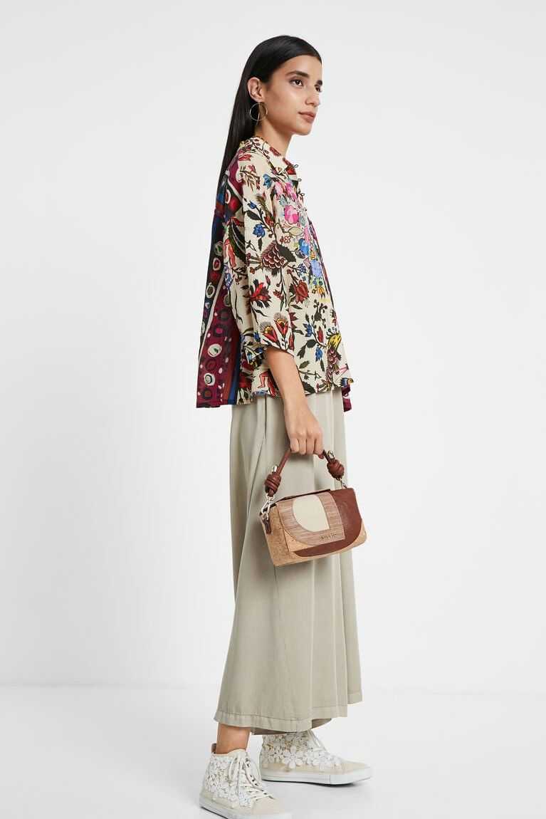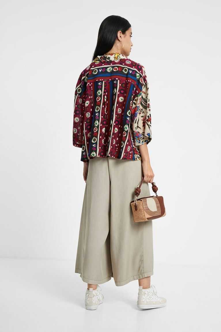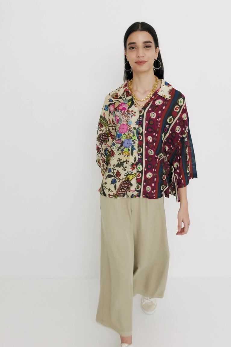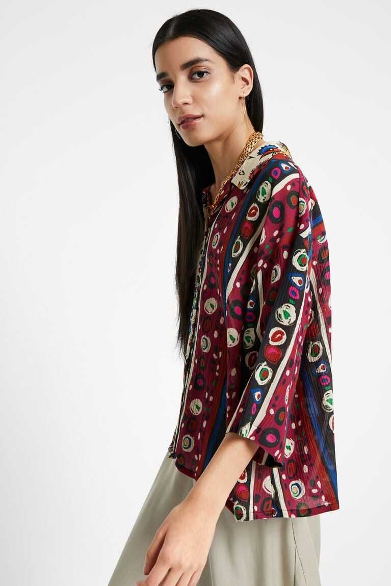 3/4 sleeve cotton and silk shirt with ethnic style patch designed by M. Christian Lacroix. The fabrics mix vertically to create a colourful print. A loose shirt with cutaway collar and asymmetric hems. Ideal to dress with colour.