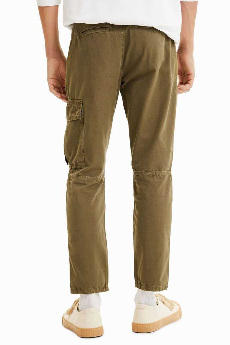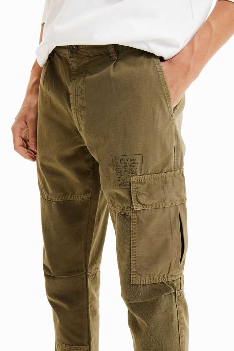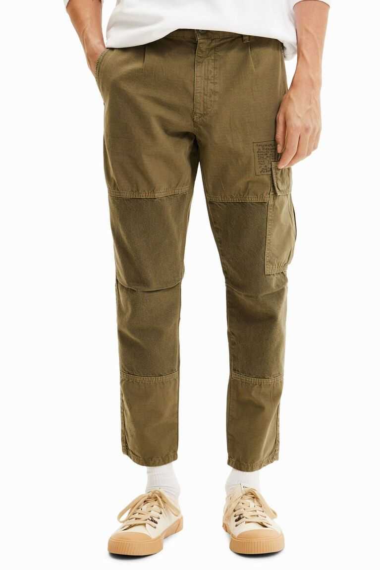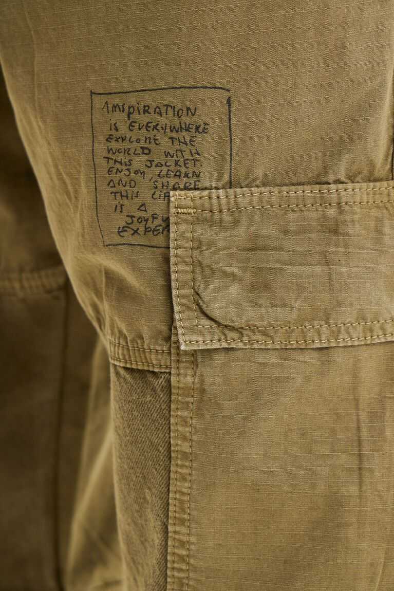 Relaxed-fit cargo trousers made from cotton with a patchwork of fabrics, a print on the hem and lettering under the pocket. Featuring multiple pockets.