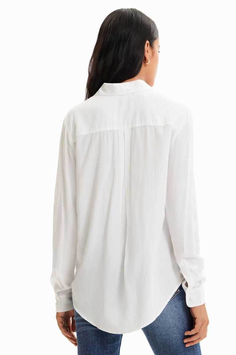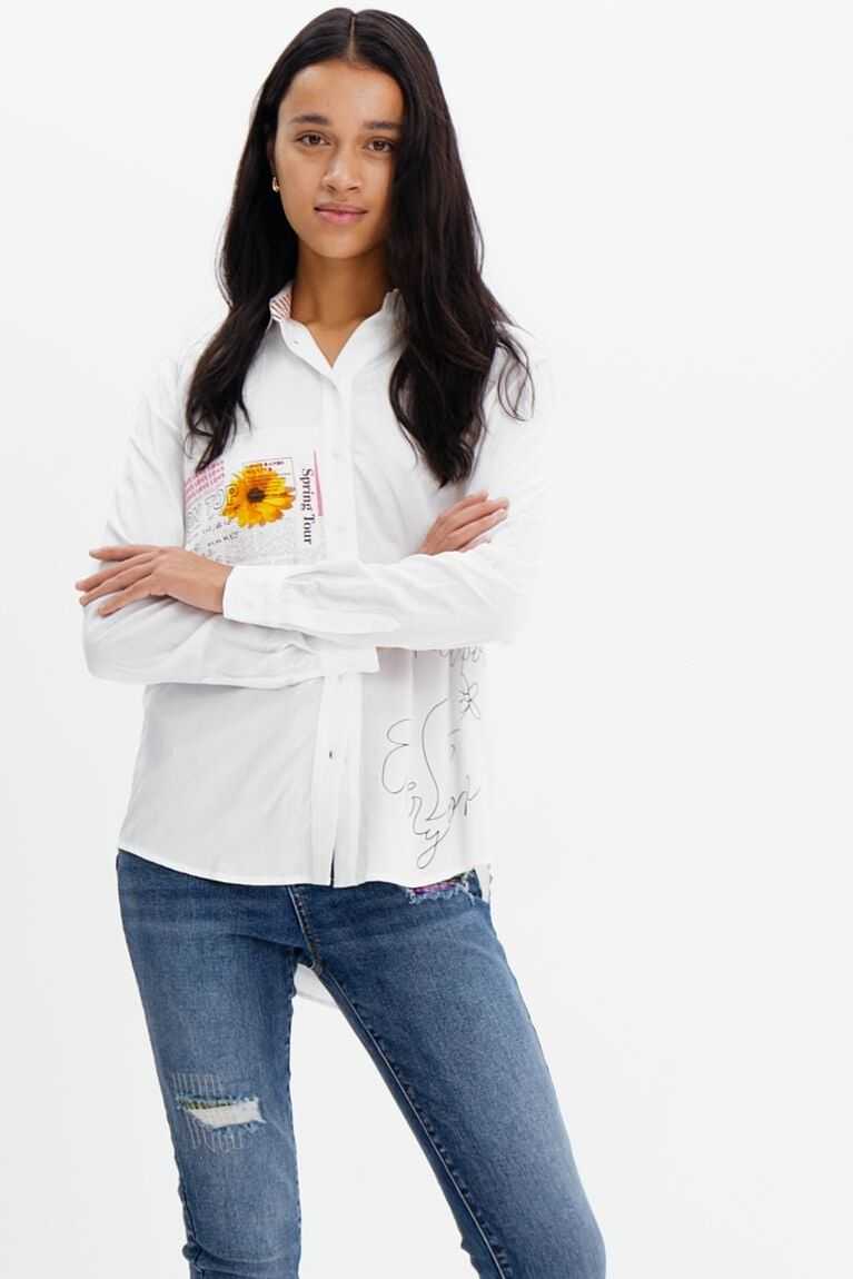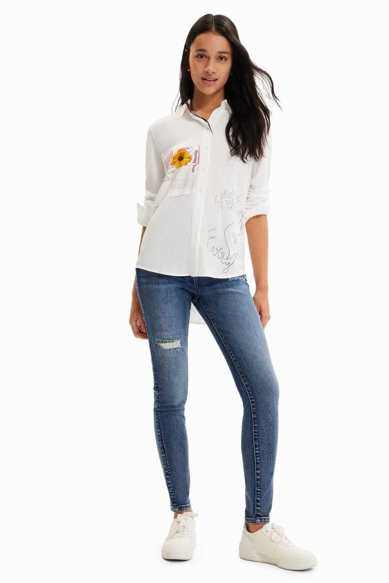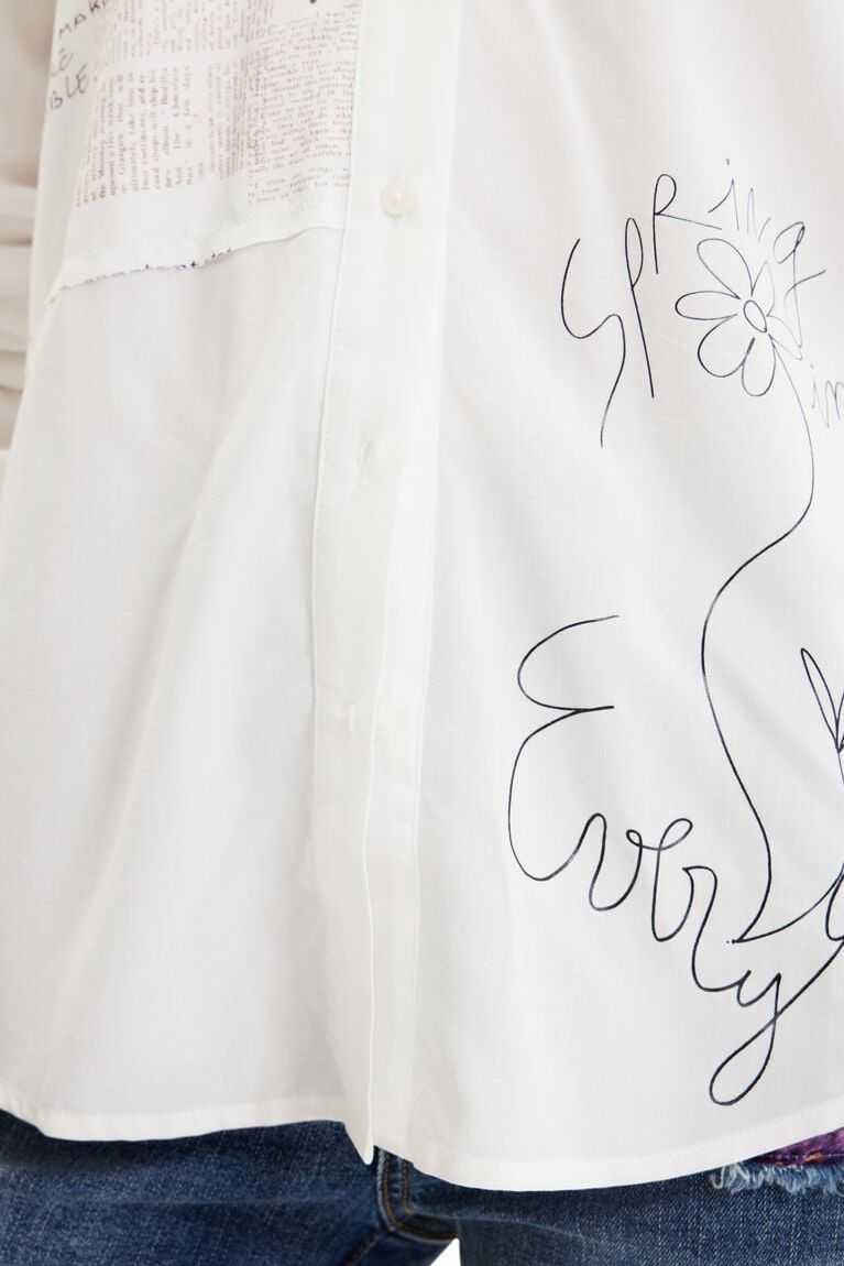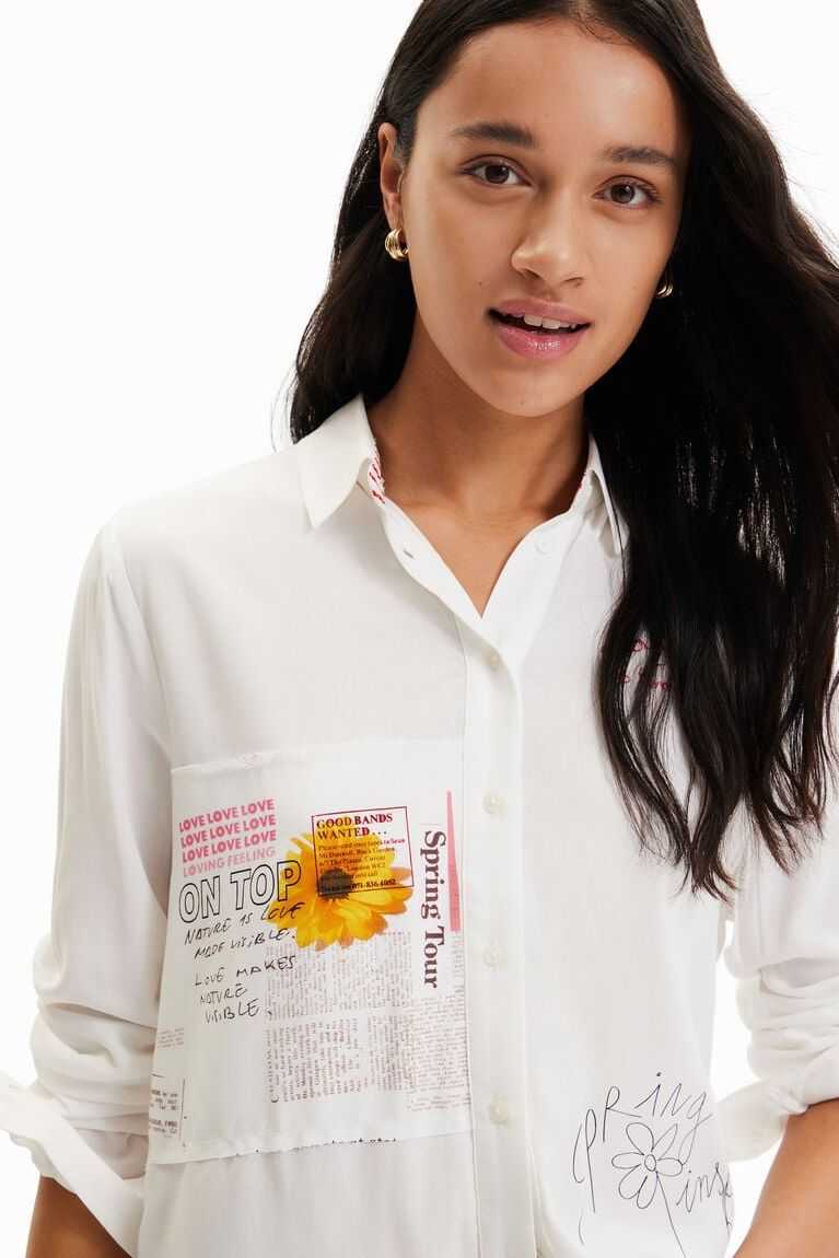 A long-sleeve shirt with a frayed patch, illustrations and messages on the front.