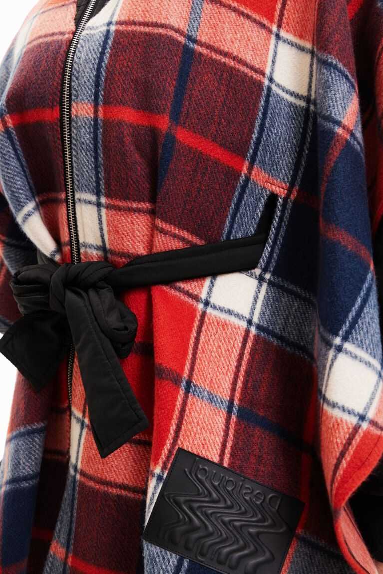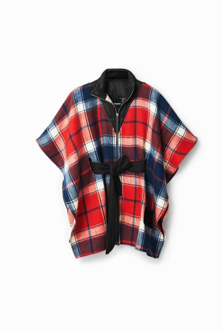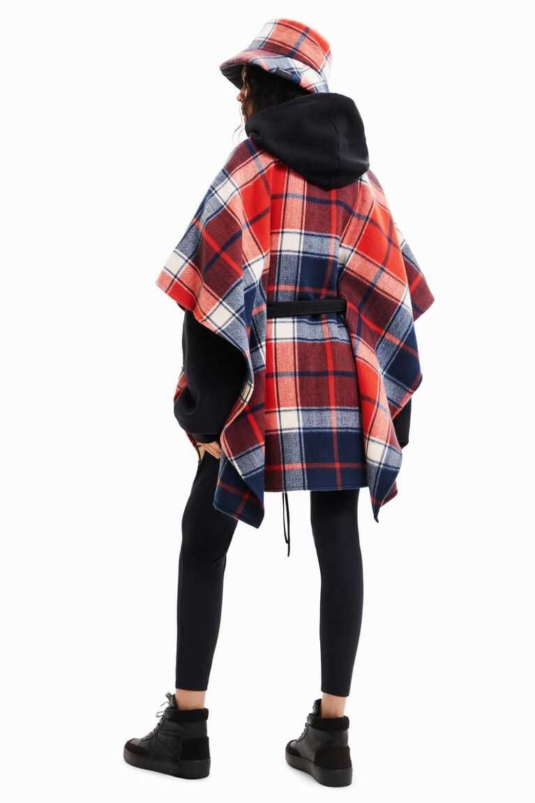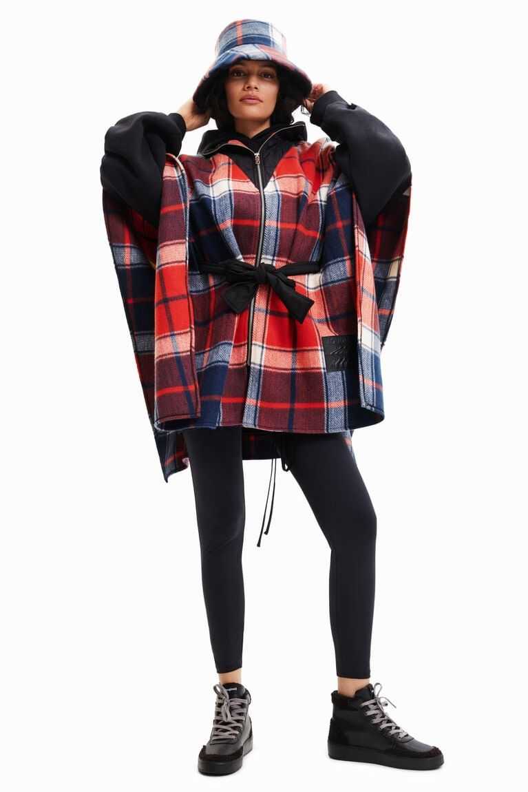 Patchwork plaid poncho with a nylon collar and a belt with a zip closure, works well with the gloves and hat from the same collection.