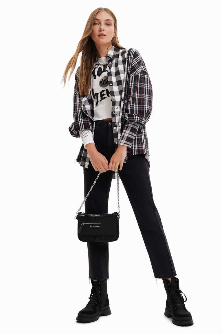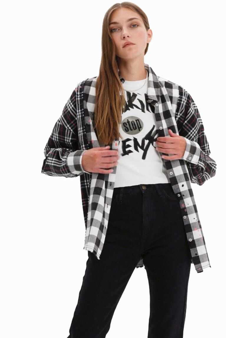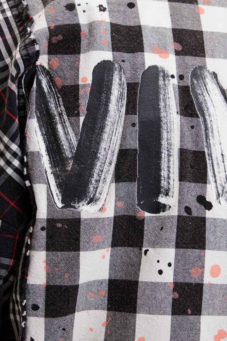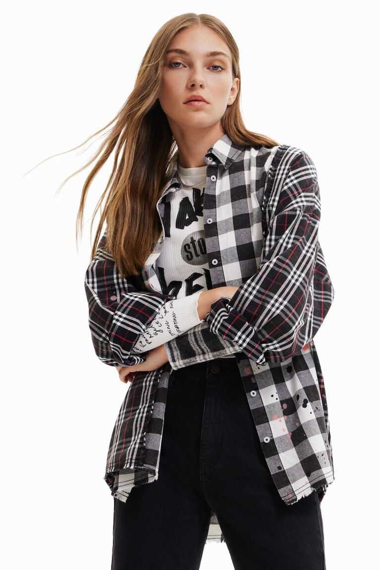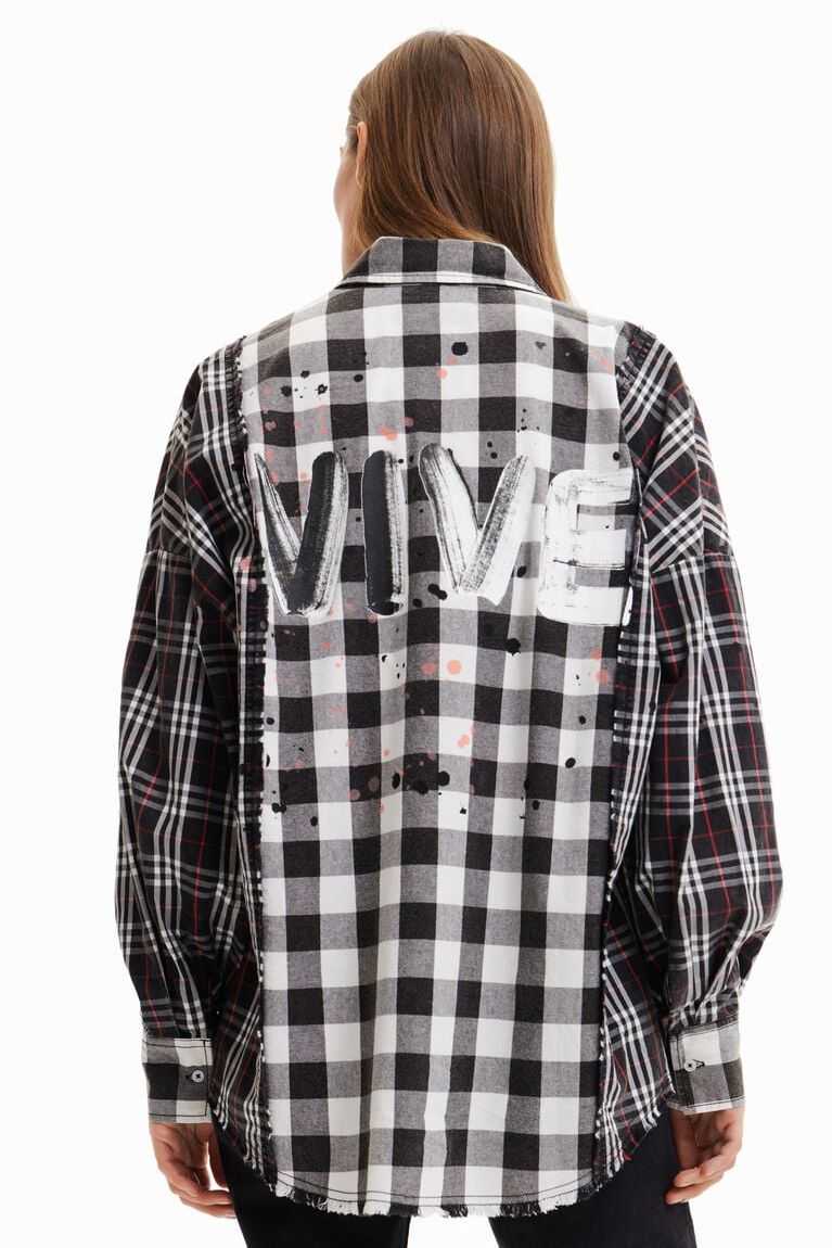 This comfortable oversize long-sleeve cotton shirt features two plaid prints. It has a handwritten-effect message on the back.