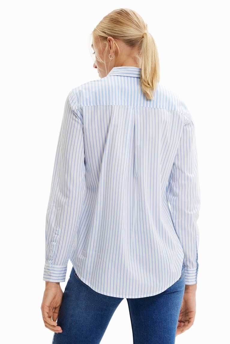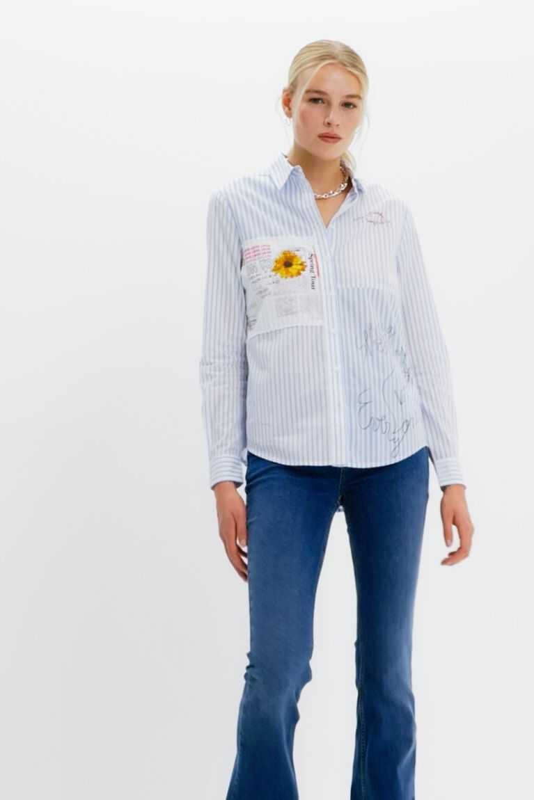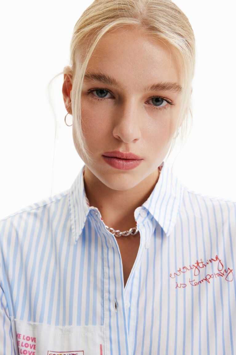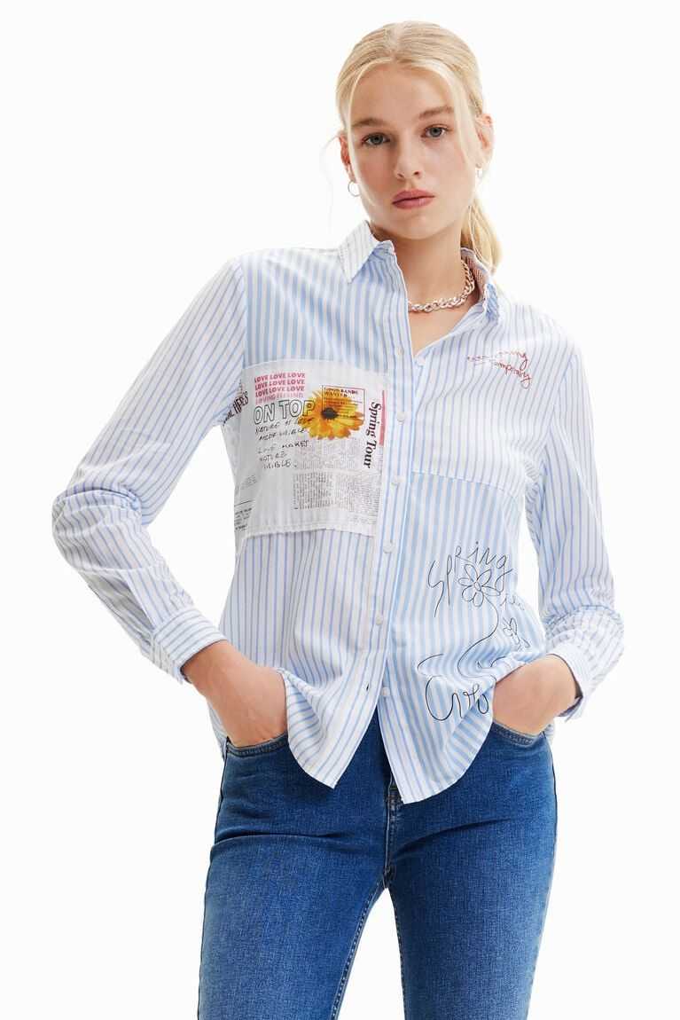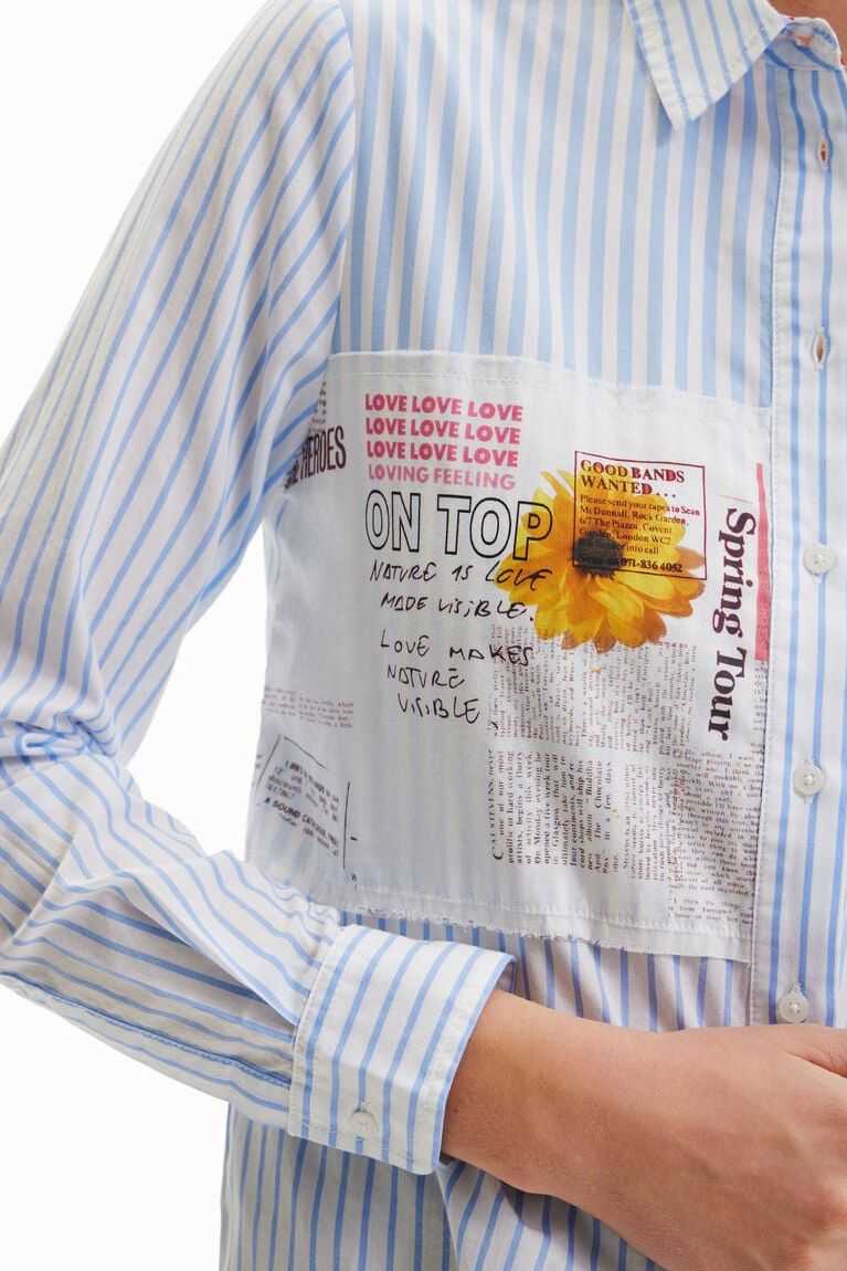 A long-sleeve striped shirt with a frayed patch, illustrations and messages on the front.