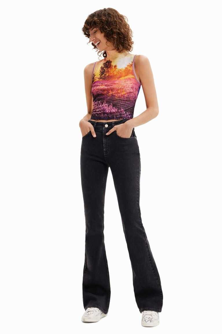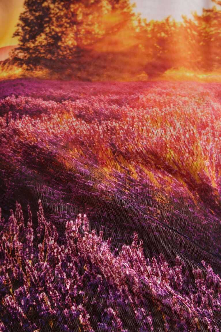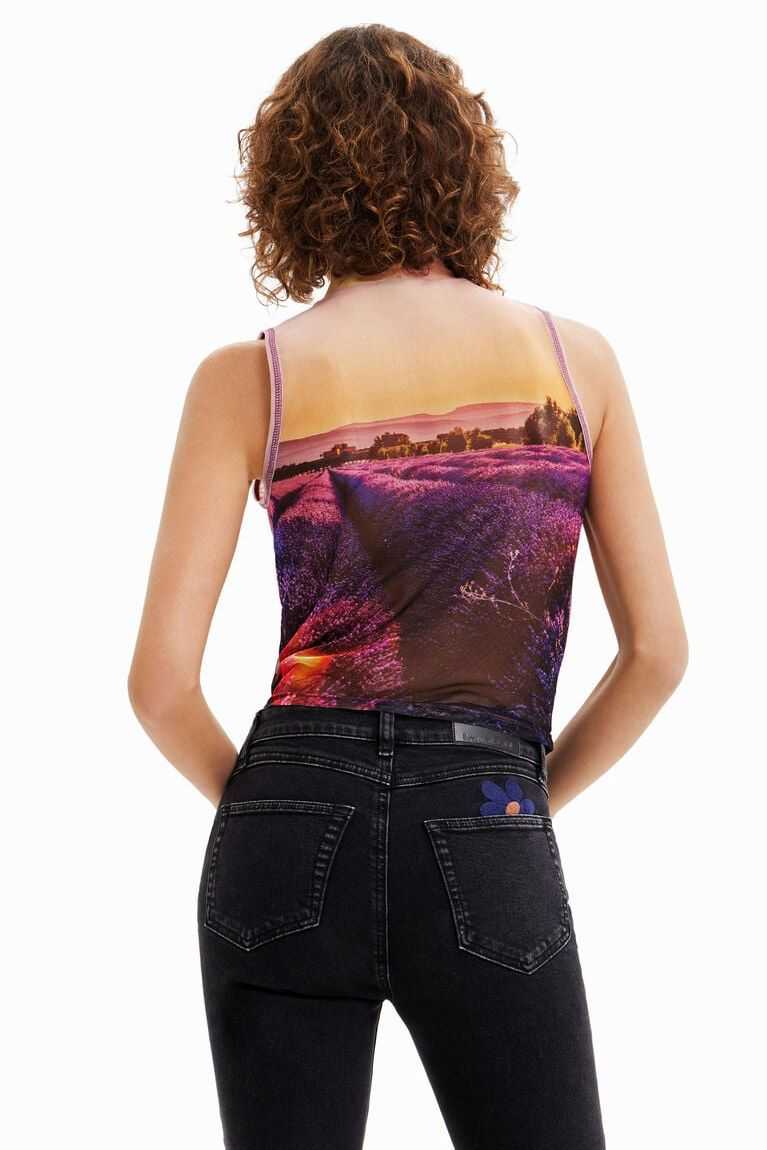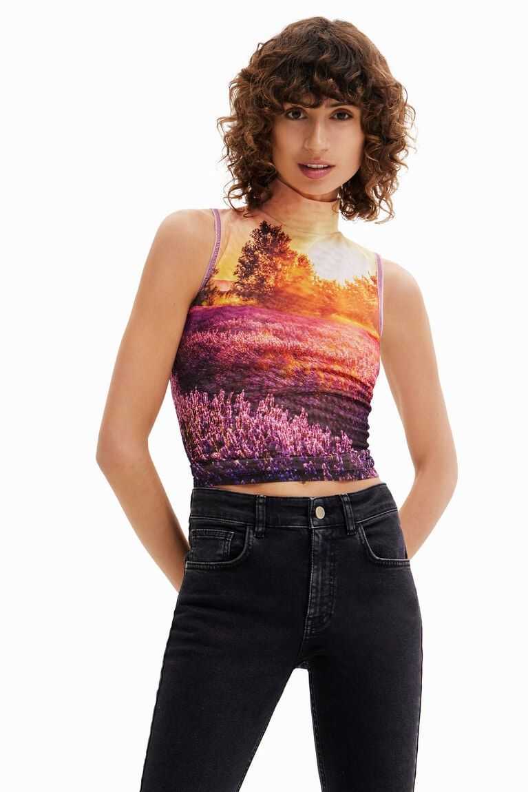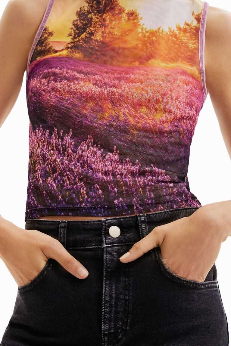 This sleeveless tulle T-shirt features a digital photographic print of a lavender blossom landscape. Fitted with a cropped waist.