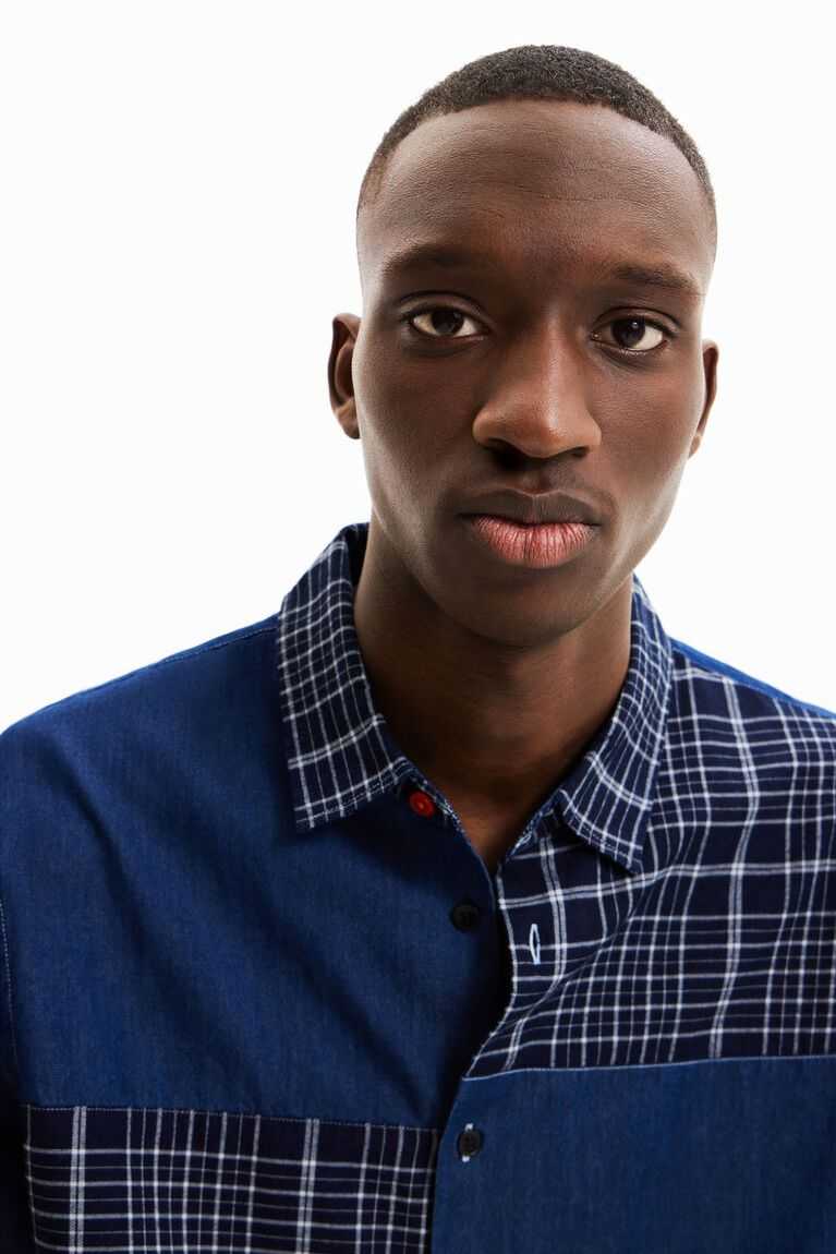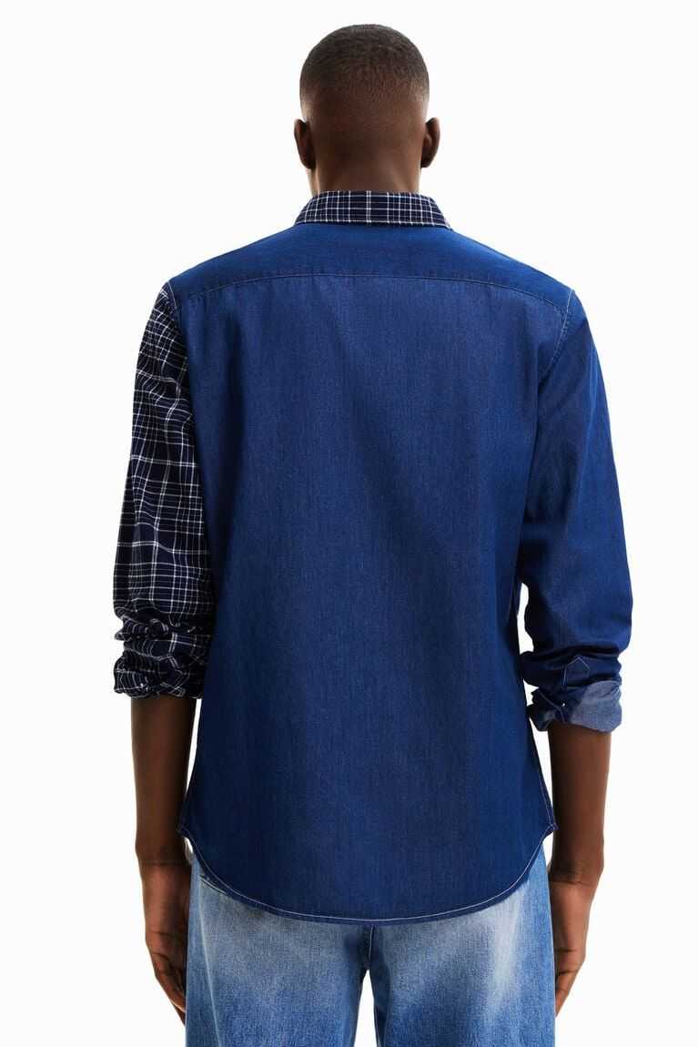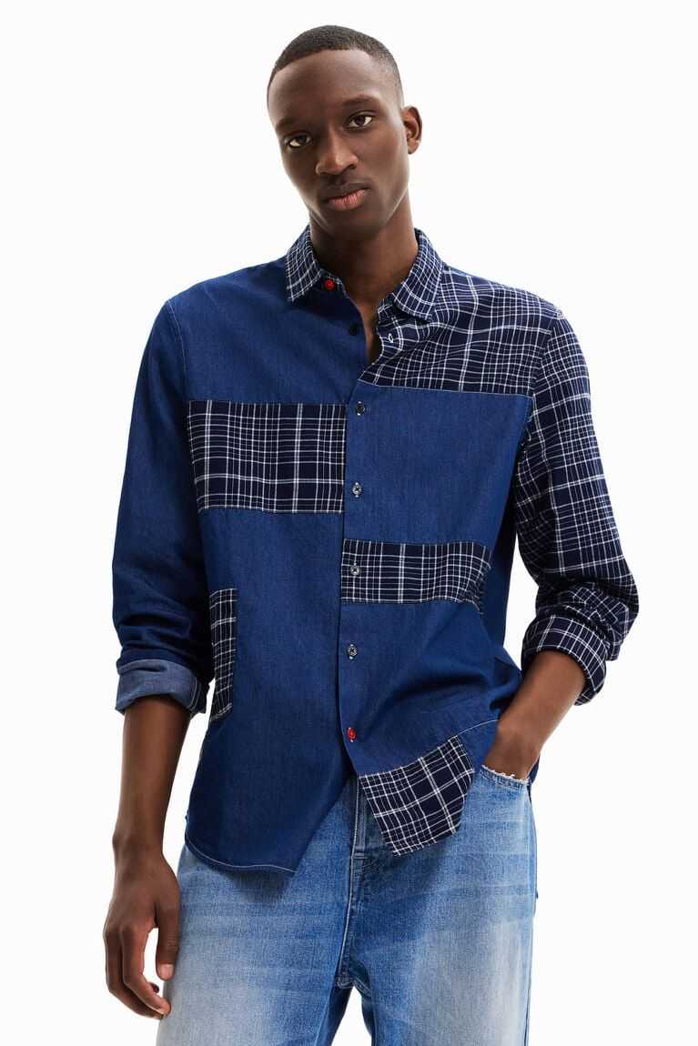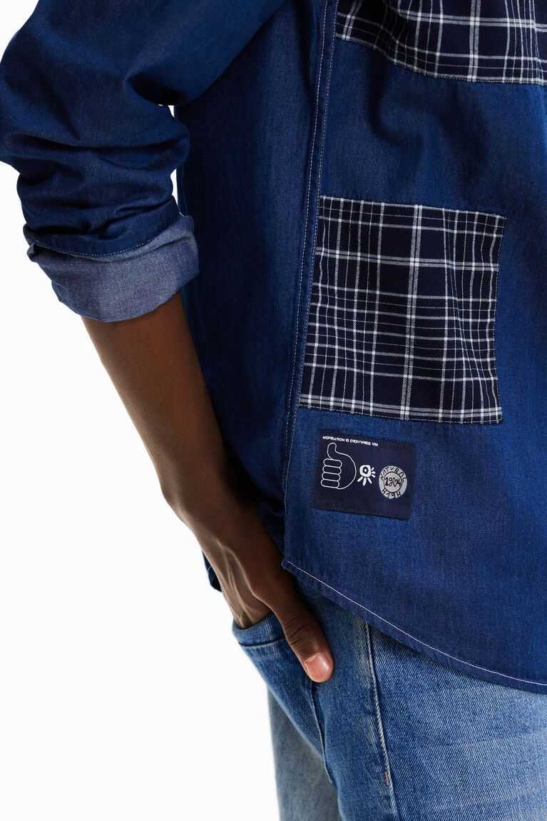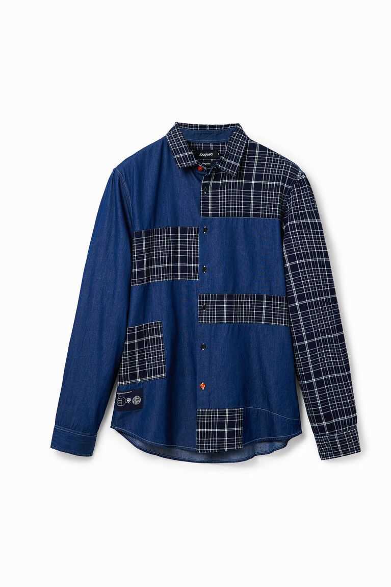 A long-sleeve shirt with a regular fit, made from cotton, with a patchwork of plaid, denim and a message.
